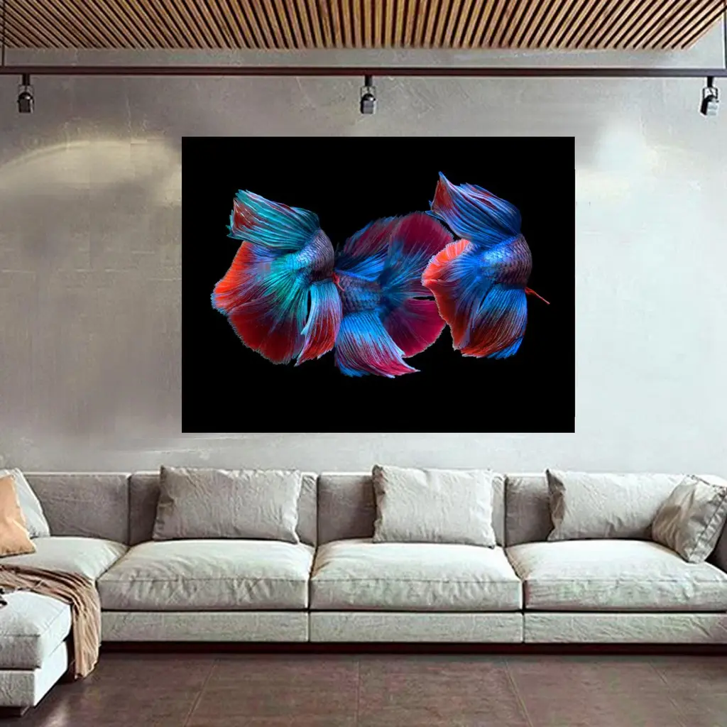 Color photograph of several male betta fish swimming on black. Printed on archival fine art paper.