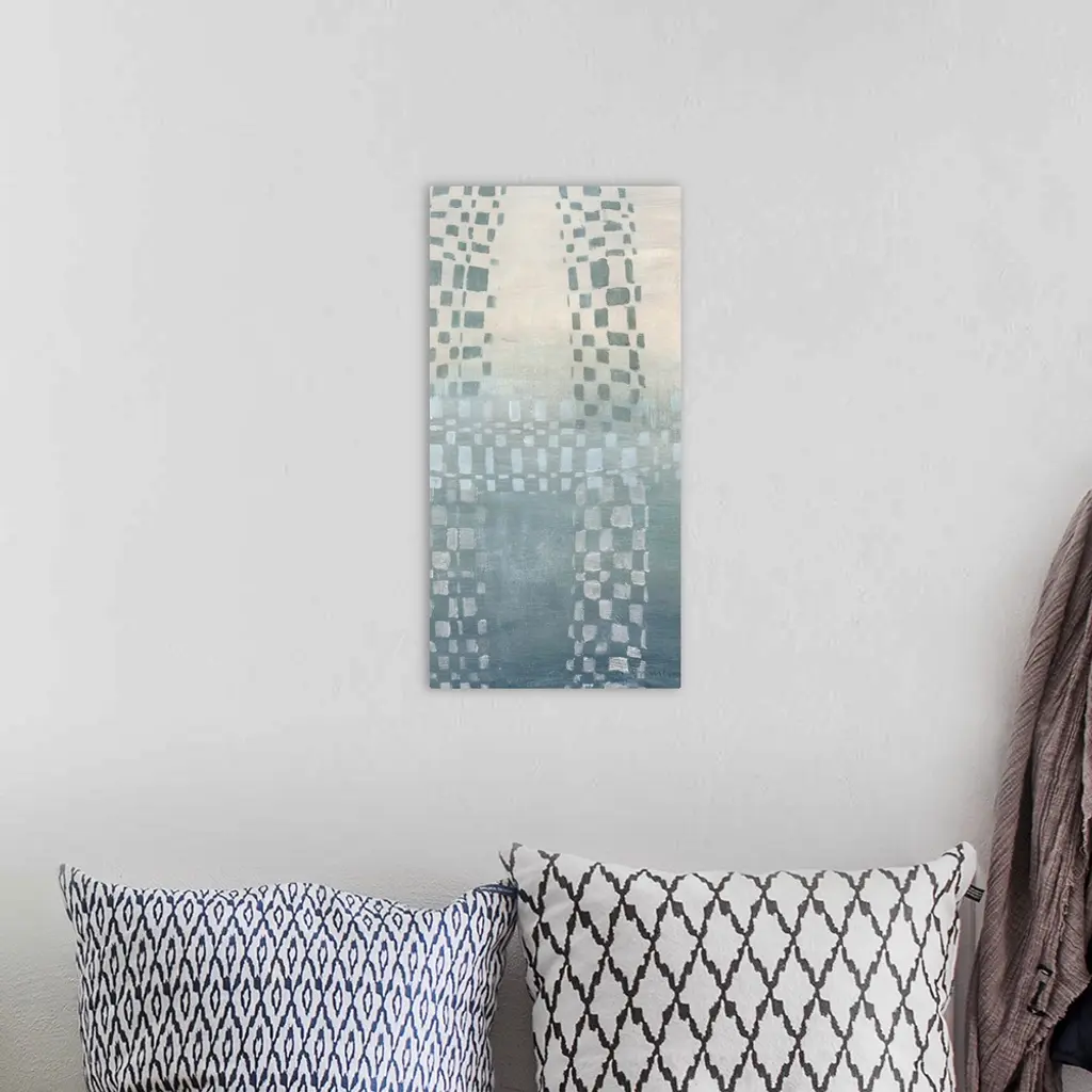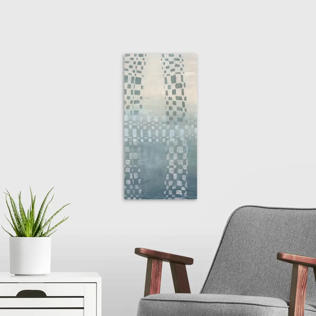 Abstract painting of cascading geometric shapes in a muted blue against a split tone cream and blue background.