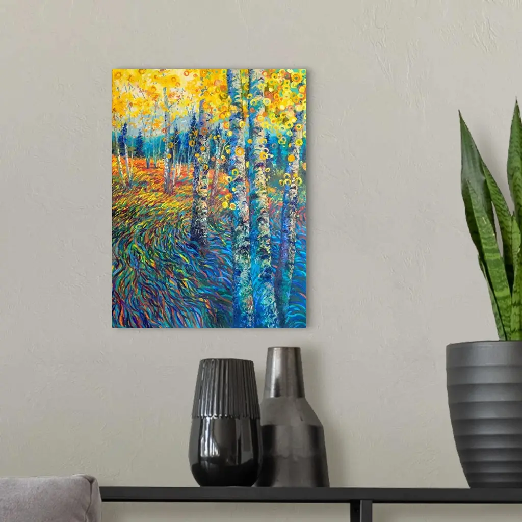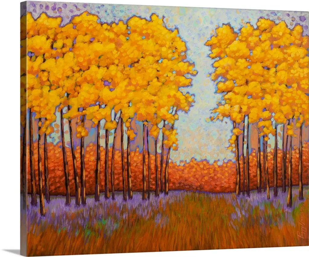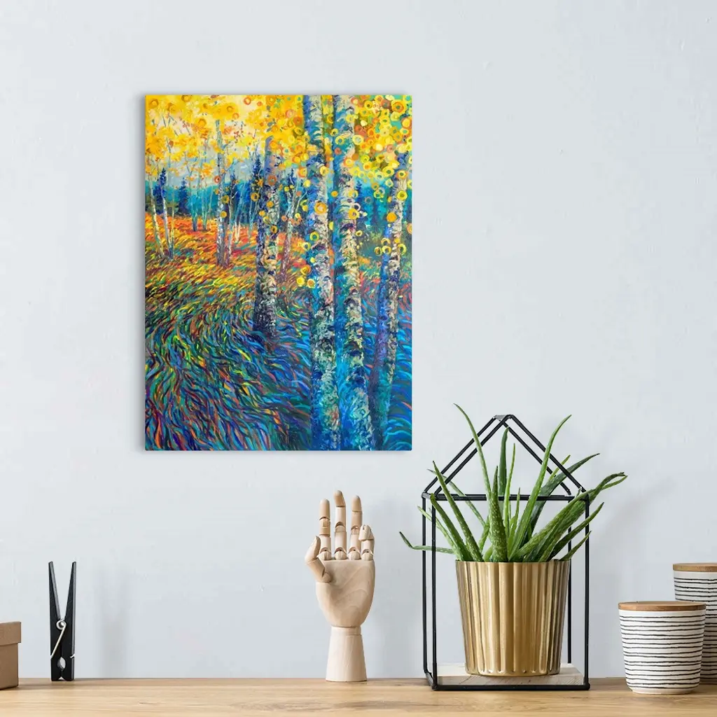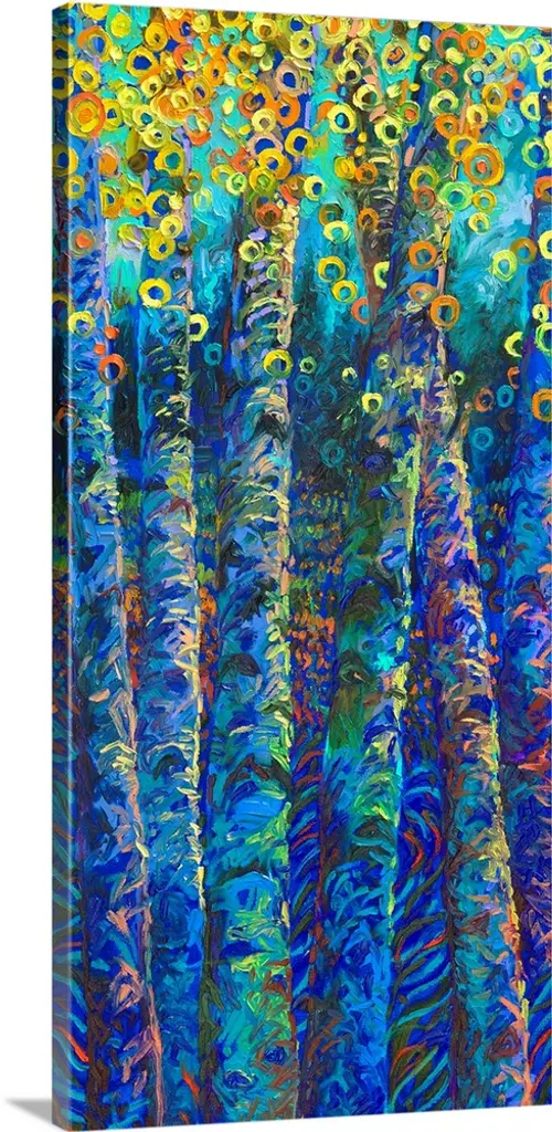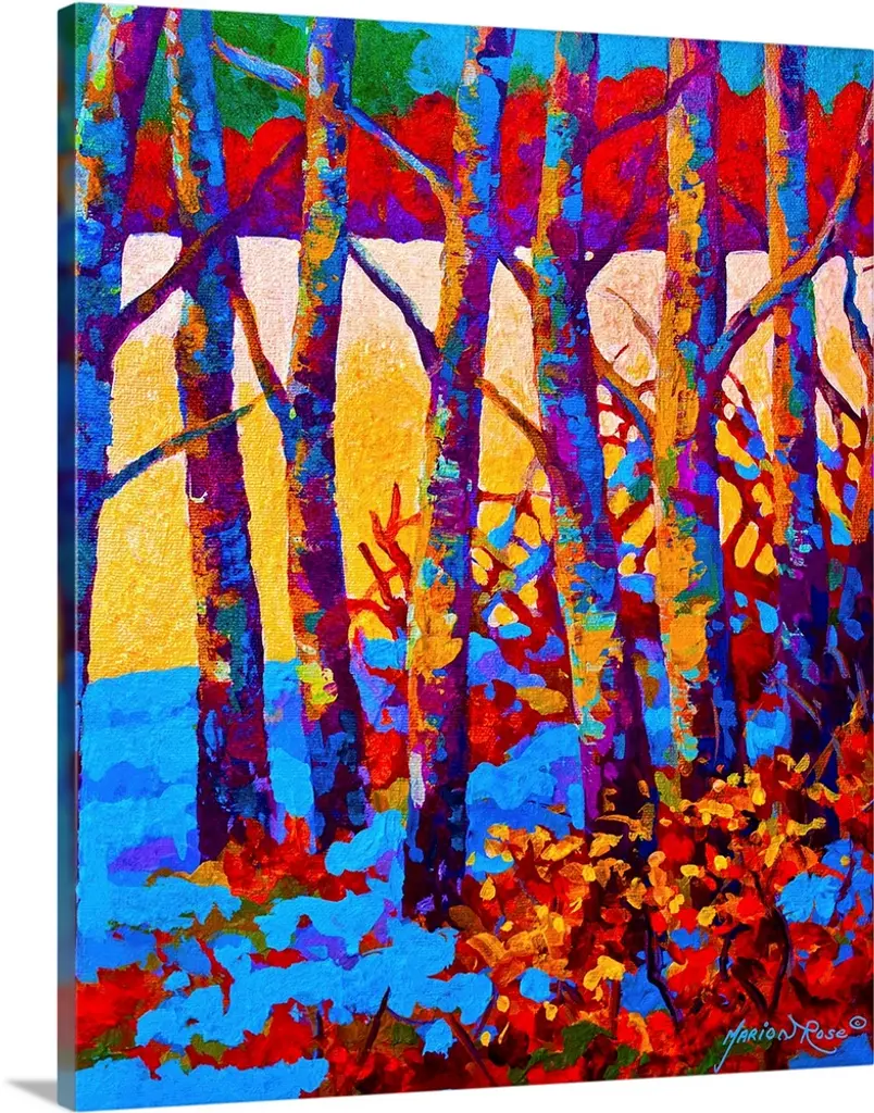 Brightly colored contemporary artwork of a colorful tree landscape.