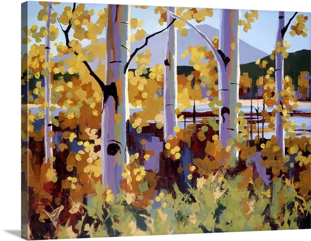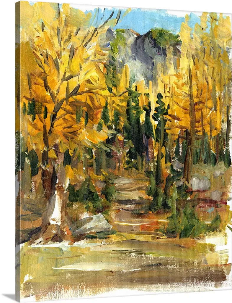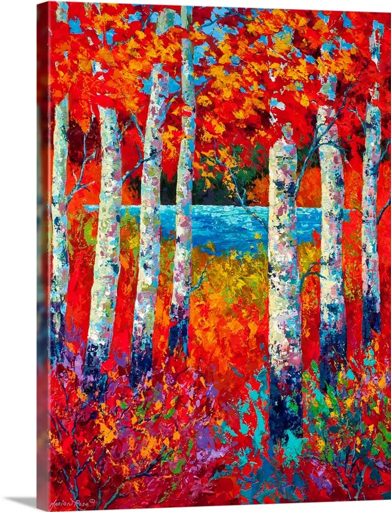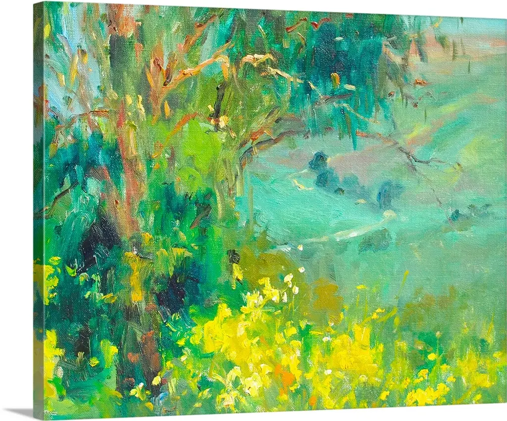 Brightly colored contemporary artwork of a colorful tree landscape.