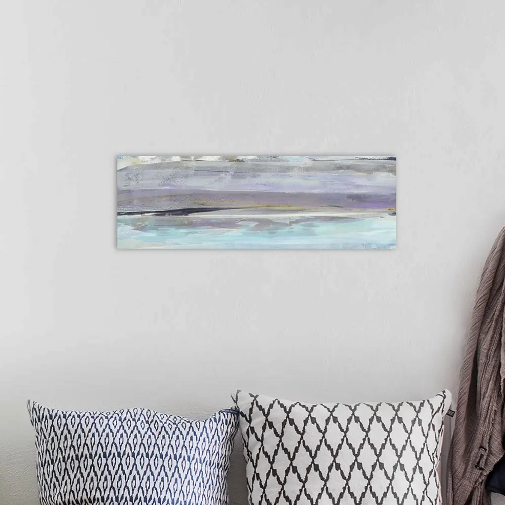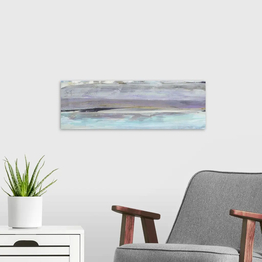 Panoramic abstract painting created with layering horizontal brushstrokes in cool tones.