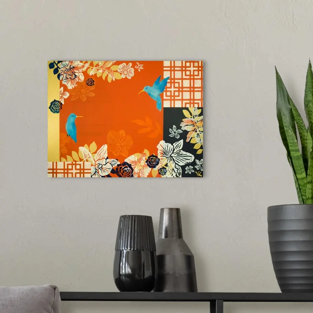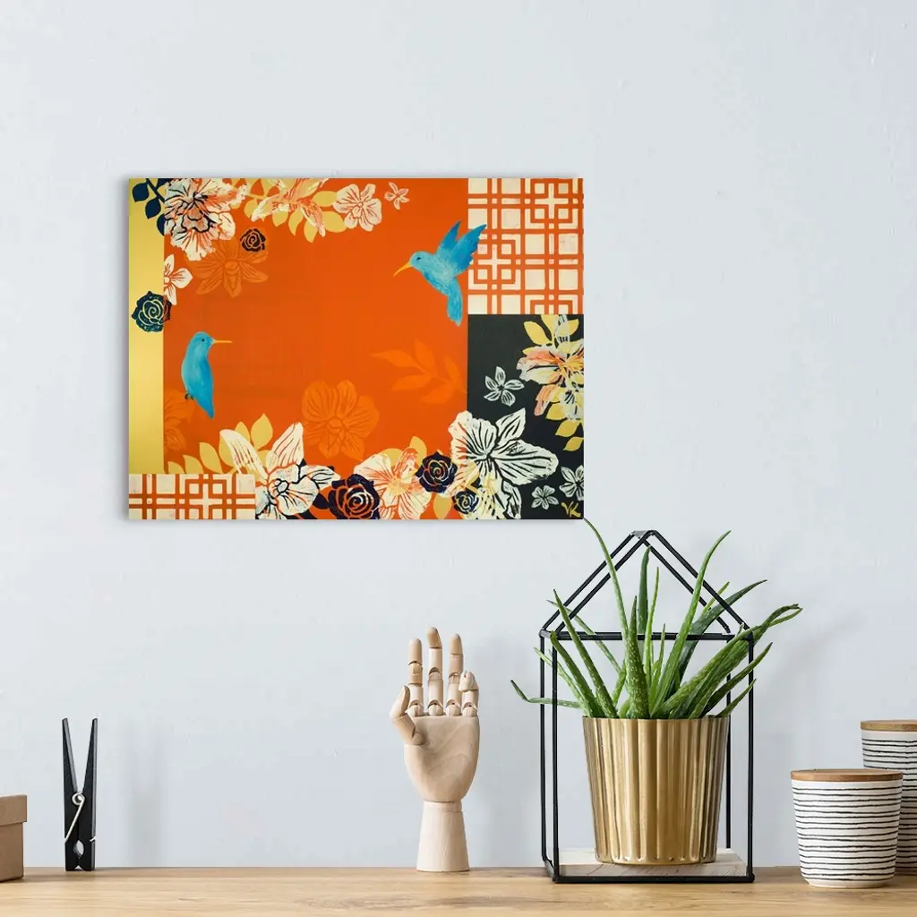 Painting of two bluebirds a garden of orchids with orange background and screens.