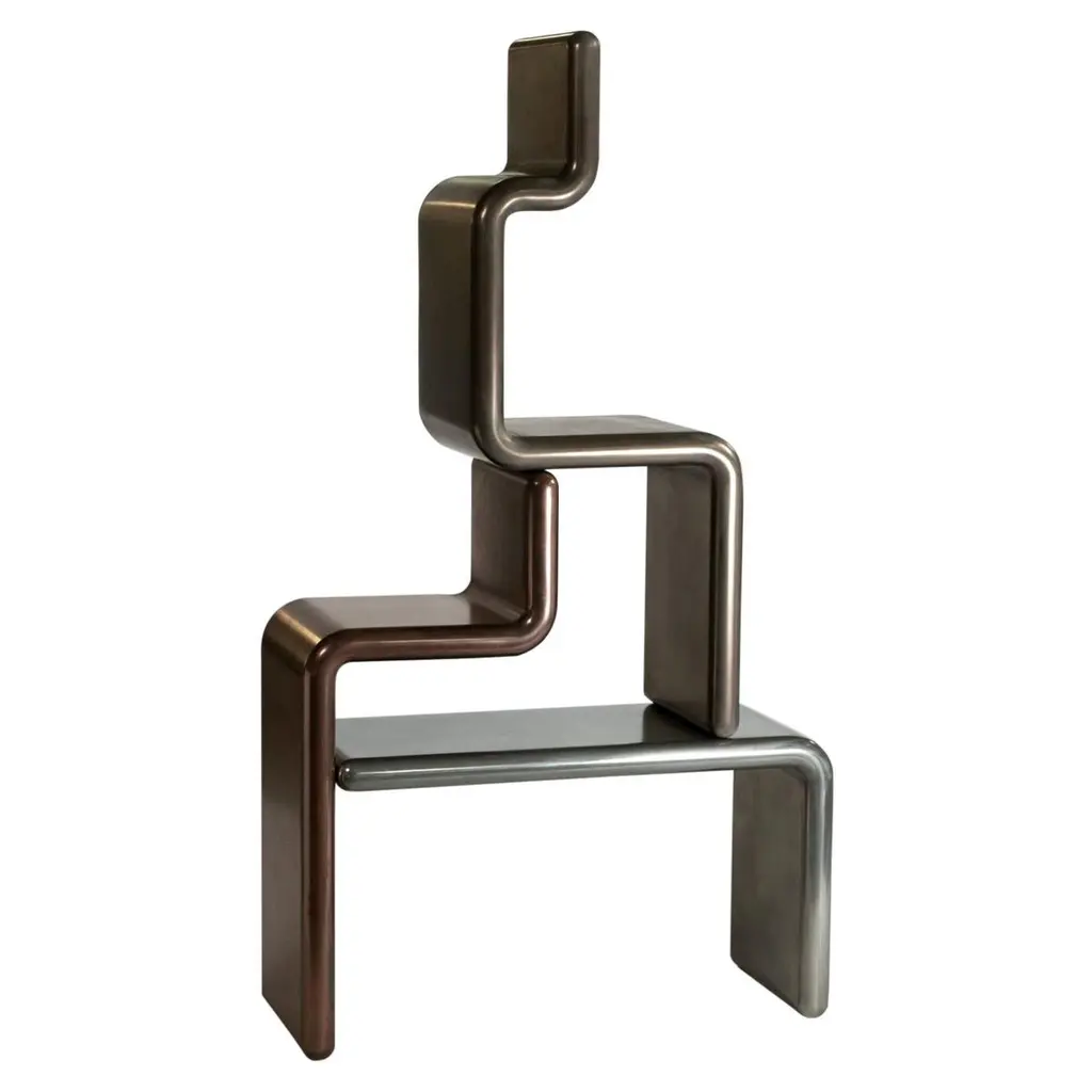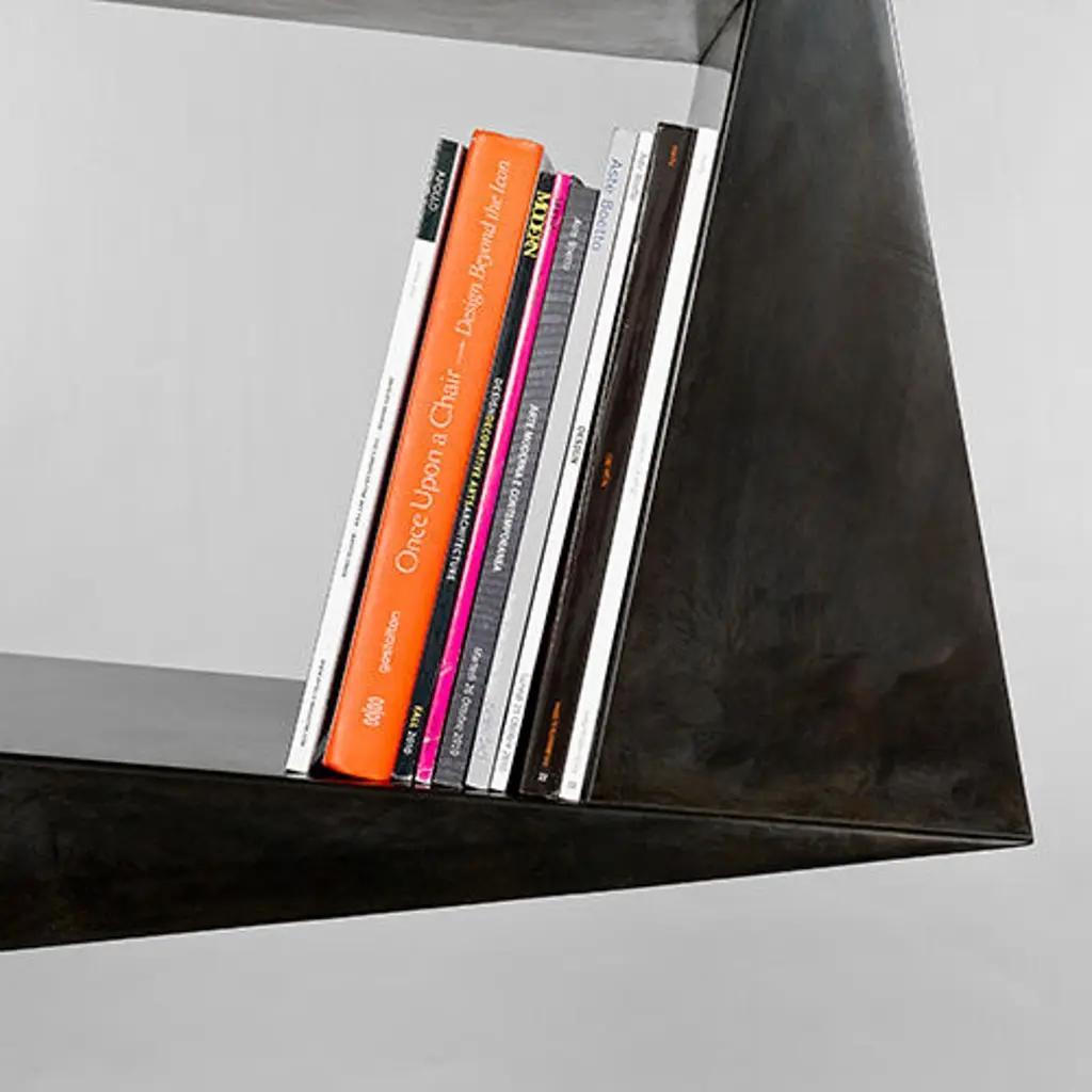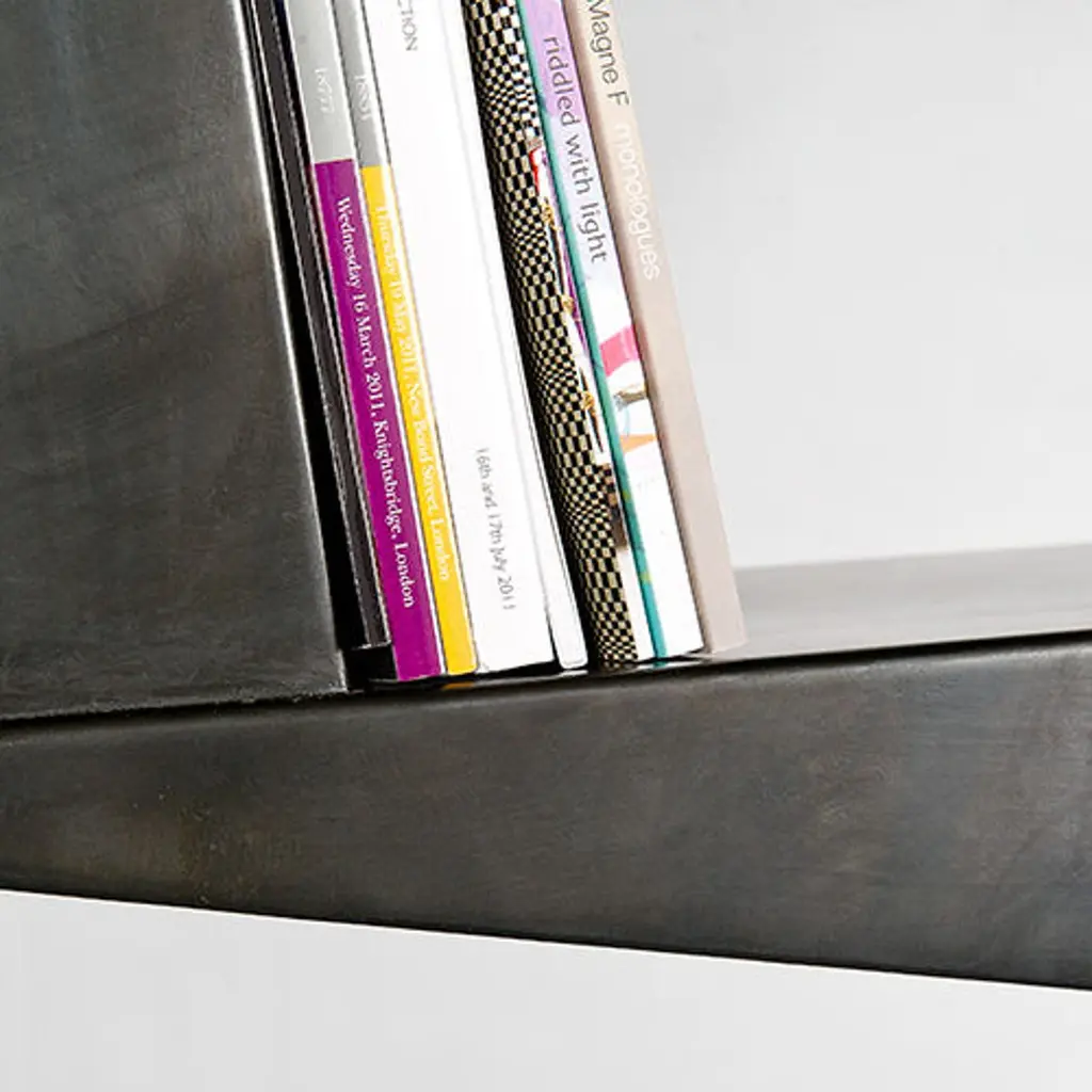 "Biblio John"; steel bookcase by Stephane Ducatteau, signed by artist, France, 2011This bookcase rejects the idea that books and magazines should either stand to attention or lie flat and invites us to allow them to lean elegantly instead. Beautiful enough to be entirely non-functional. Ducatteau is an artist and creator of contemporary furniture working primarily with sheet metal.All Ducatteau pieces are available exclusively from Decoratum and are to order only. Please allow 6-8 weeks for delivery. Exchange rate fluctuations may apply.Ste´phane DUCATTEAUDucatteau is an artist and creator of contemporary furniture working primarily with sheet metal.Although his furniture is about the aesthetic, he never forgets the functional aspects of his pieces. His approach is sculptural, using a pleasurable mix of ergonomics and curves to generate an emotional, almost sensual response in the viewer.The metals Ducatteau uses, take on an almost ebony-like effect thanks to the well-worked patinas that he produces, often treating the metal with acids or minerals; each piece is produced to the same rigorous standards that you would expect from someone with the skills of a wrought iron metal worker combined with the impossibly high standards of an artist.Ducatteau’s background is not what you would expect from an artist, having initially studied engineering. However, over the course of several years he attended evening classes in Paris studying fine arts (drawing, painting, modelling, glasswork, etc) before obtaining a degree in Art Metalwork. After working as an engineer in an architect’s office, he made the decision to devote a full year to further training in the art of metalwork as he no longer wished to merely be a disassociated part of the design process; rather he wanted to be the process, involving himself in the entire project from concept to design to final realisation of the object.His work has developed over time, moving from a more decorative style to simpler creations where he has distilled the very basic essence of design into deceptively pure, functional works of art.A recurring device or theme of his work method is the accumulation or repetition of relatively basic elements whose very repetition creates a rhythm which provides direction for his creativity processes.Ducatteau worked for several years in Roubaix in northern France out of a collective workshop before settling in Normandy in 2003. He has a number of exhibitions and fairs under his belt as can be seen below.ExhibitionsSept/Oct 2009 TALENTS, SHOW-ROOMMay/July 2009 GALERIE EMEURAUDE, Le TouquetJune 2008 VIA, Paris (exposition des LABELS VIA 2008)April 2008 VIA, Milan (exposition des LABELS VIA 2008)Nov 2007 GALERIE LE FEUVRE, se´ries limite´es, ParisSept 2006 LA NUIT BLANCHE, Toronto, ROSELAND GALLERYMay/June 2006 MAATGALLERY, Paris Apr/May 2006 ROSELAND GALLERY, TorontoApril 2006 VIA, Milan (exposition des LABELS VIA 2006)July/Aug 2005 GALERIE EMEURAUDE, Le TouquetFebruary 2005 Maison des architectes de GrenobleJuly 2004 GALERIS S1LIVRE?, Villerville (14) December 2003 CARREFOUR DES ARTS, Brecey (14)Nov/Dec 2003 GALERIE Ateliers d`Art de France, ParisApril 2003 VISIONI, invite´ au sein de la se´lection franaise, FlorenceFairs2001 onwards MAISON ET OBJET / SCENES D`INTERIEUR, 2 fois par an depuis 2001, ParisJan 2005 Salon du meuble, ParisDec 2004/5 Design Louveciennes, LouveciennesDec 2005 RECUP, ParisOctober 2003 HABITER, Jardin des Tuileries, ParisDec 2002 Salon des Antiquaires, Jardin des Tuileries, ParisDec 2003 Carrousel des Me´tiers d`art, Carrousel du Louvres, Paris LABEL VIA 2008, pour JEU DE CARTESLABEL VIA 2006, pour les tabourets TABPRIX "DECOUVERTE" lors du salon Maison et Objet en Septembre 2002.