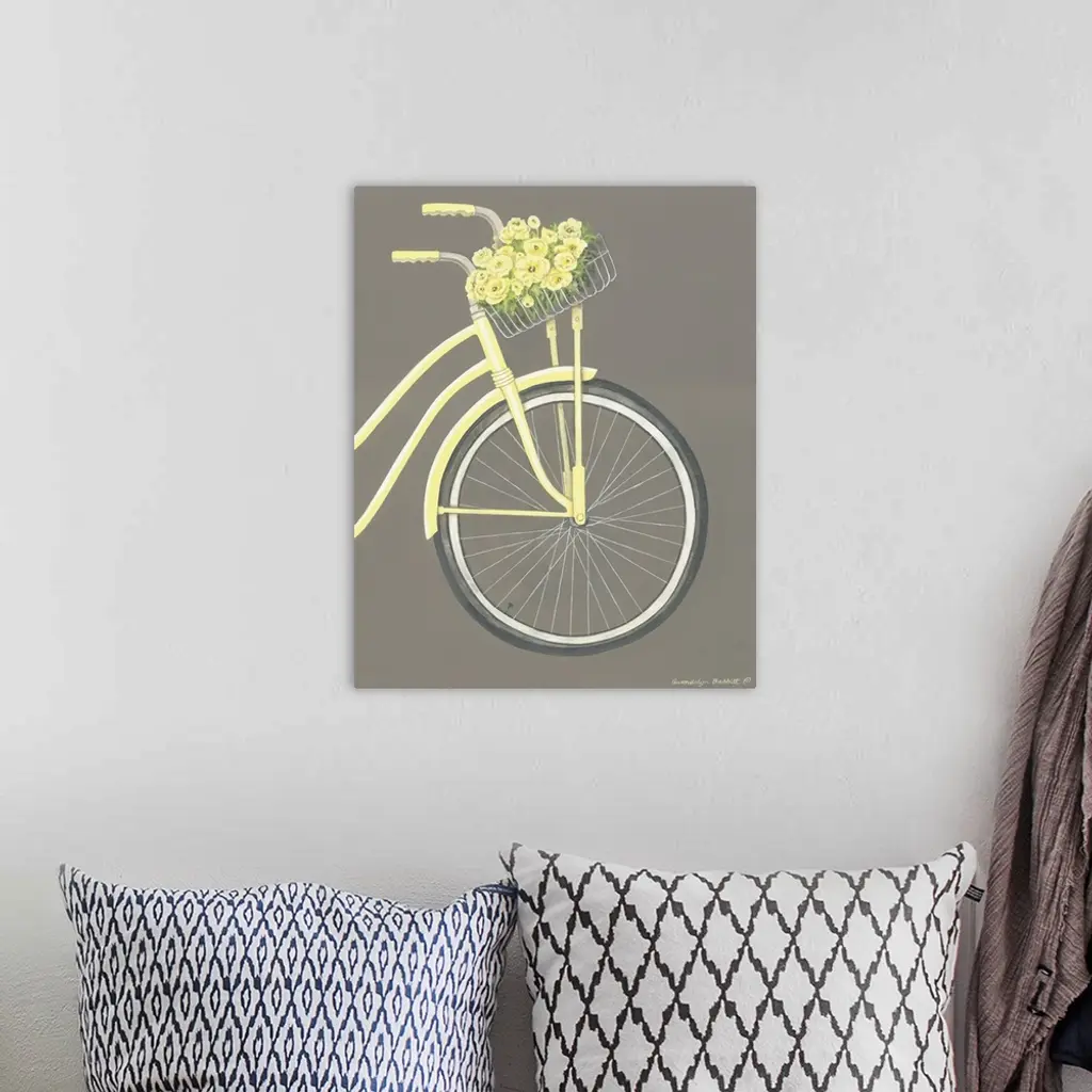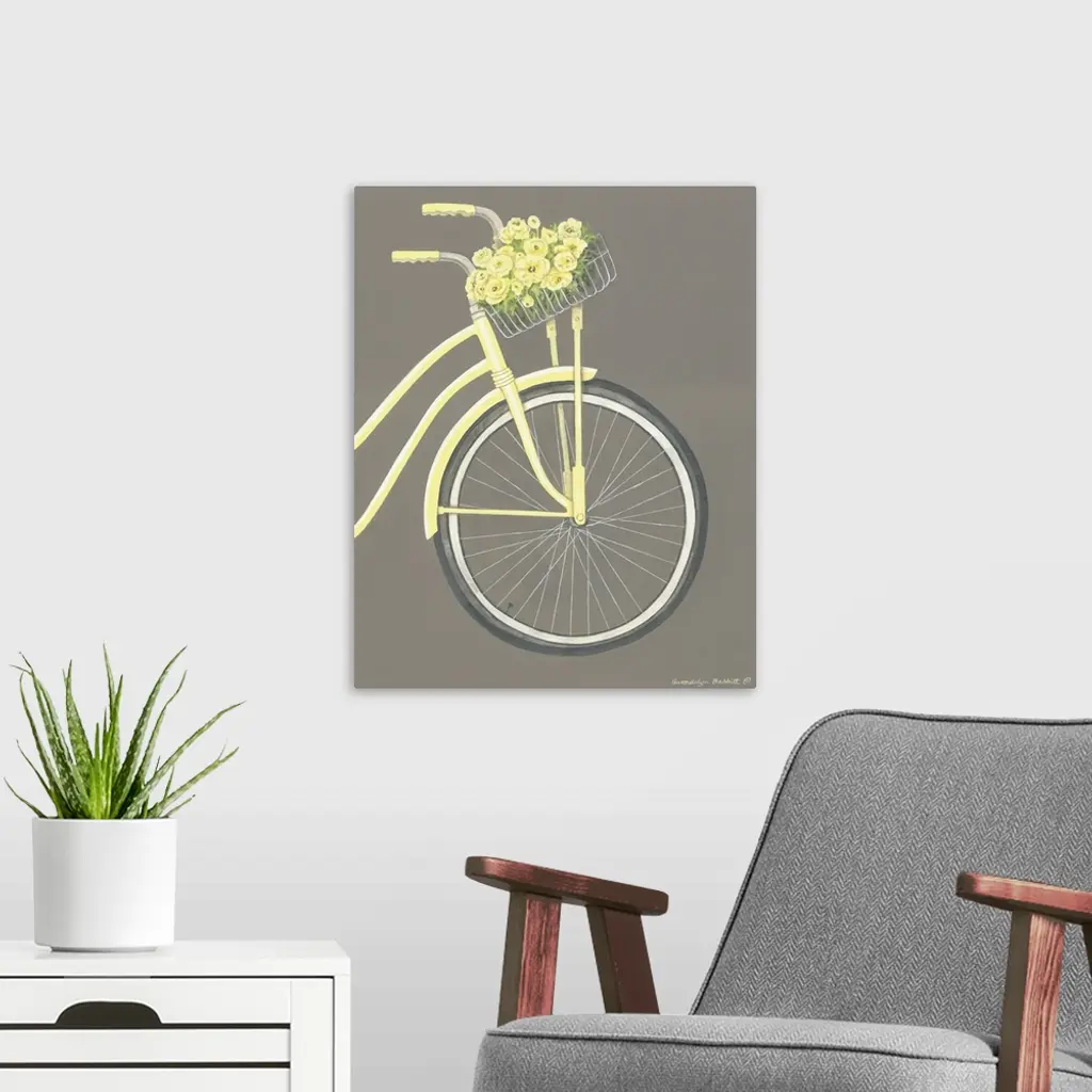 Painting of the front of a pale yellow beach cruiser with a basket full of yellow flowers on a gray background.
