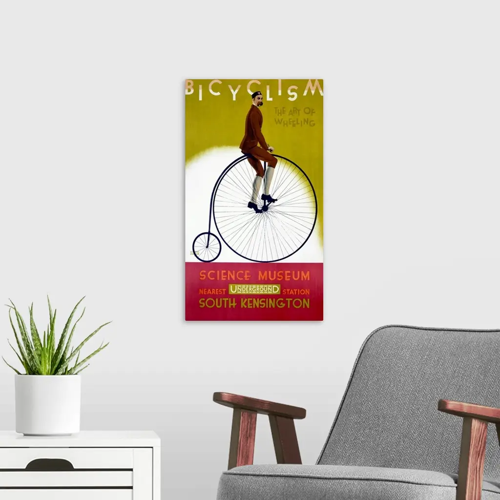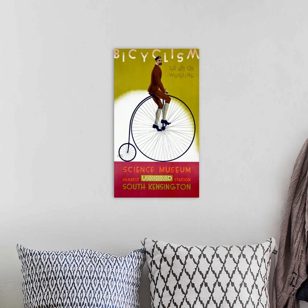 This wall art is a vintage advertising poster for an exhibit about bicycles with artwork depicting a man riding on a penny-farthing or ordinary bicycle.