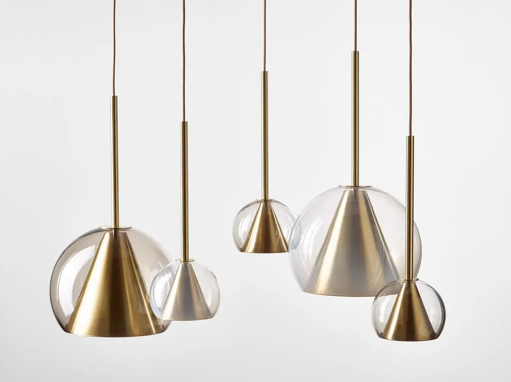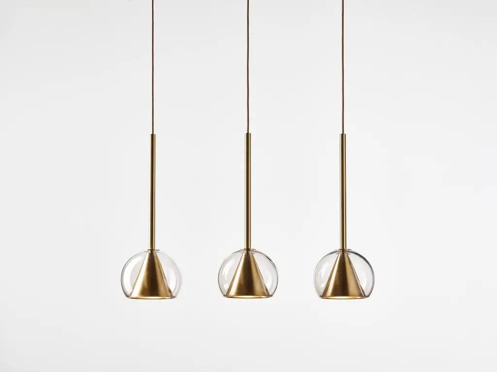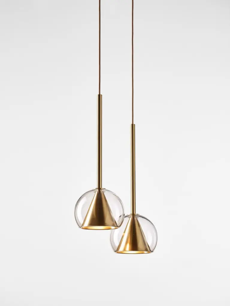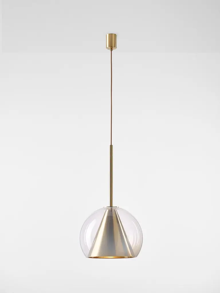 Big Alabaster white Kono pendant light by Dechem StudioDimensions: D 35 x H 75 cmMaterials: brass, glass.Also available: different finishes and colours available,This collection of suspended light fixtures combines the elementary geometric shapes of a hand-blown glass ball and a brass cone inside, creating an almost metaphysical composition. The glass shades are available in crystal clear, alabaster white, smoke grey and neutral nude. The lamp is suspended on a brushed brass fixture with a textile covered cable.Glass, just like people or trees, is perfectly capable of being shaped and formed. One can imprint just about anything into it, give it a form, capture a passing moment, breath a new life into it. Later it stiffens and freezes like a petrified fossil, like magma, like a witness. No one can move it. It is solid as a rock and if you urge it, it rather shatters into pieces than to surrender.We are DECHEM.We are Michaela and Jakub, designers and storytellers in Bohemian glass. Our work is based on contemporary design combined with a mastery of production and a healthy respect for old Central European craft and traditions.We design, produce and sell our collections of lights and decorative glass products. We produce unique light fixtures made from a combination of mouth-blown glass and handcrafted brass. Our glamorous chandeliers light up any space with a playful yet elegant appearance.A significant component of our work is blowing glass into a colour gradient. The wide range of fresh gradient colours is a distinctive feature of the Bandaska vase from our collection. It draws inspiration from traditional milk containers, well-known in Czech village households, and their elegant lines are now coming into modern homes in the form of our glass vases and lights.In addition to our normal production, we love to devise bespoke luminous objects for interiors. They arise from experimenting with unconventional materials and unusual combinations.Along with our own work, we like to be part of special collaborations and exhibitions. We have collaborated with renowned galleries and institutions, and curated and exhibited projects in Milano, London, Frankfurt, Istanbul and several other cities around the world.All of our creations are manufactured with care in Czech workshops using unique methods, including hand-blowing, snapping, cutting, grinding, firing, engraving and glass painting.We founded DECHEM studio in Prague in 2012 as partners in both work and life after years of studying glass craft and design, and we have grown it into a renowned and award-winning design studio.
