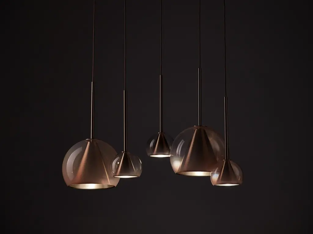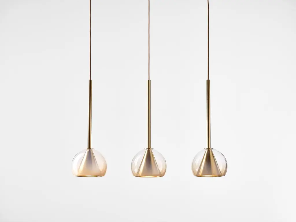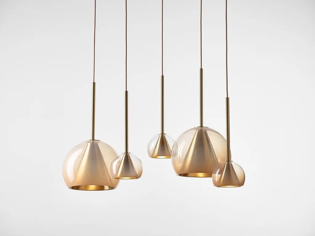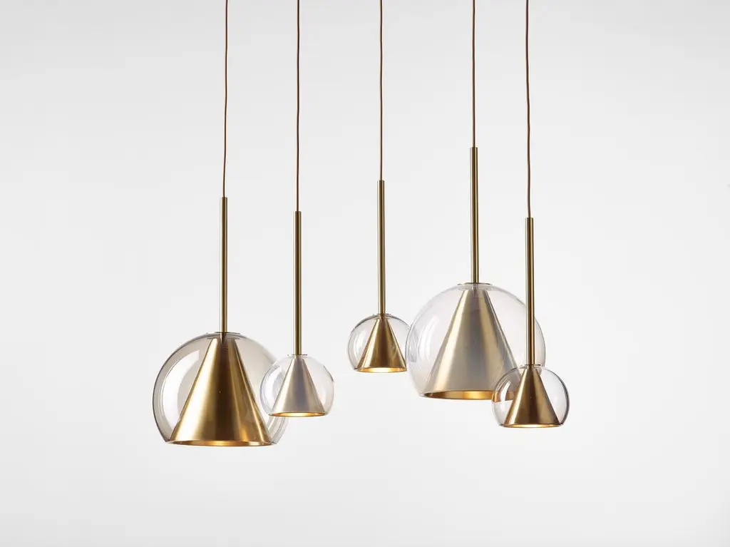 Big Alabaster white Kono pendant light by Dechem StudioDimensions: D 35 x H 75 cmMaterials: brass, glass.Also available: different finishes and colours available,This collection of suspended light fixtures combines the elementary geometric shapes of a hand-blown glass ball and a brass cone inside, creating an almost metaphysical composition. The glass shades are available in crystal clear, alabaster white, smoke grey and neutral nude. The lamp is suspended on a brushed brass fixture with a textile covered cable.Glass, just like people or trees, is perfectly capable of being shaped and formed. One can imprint just about anything into it, give it a form, capture a passing moment, breath a new life into it. Later it stiffens and freezes like a petrified fossil, like magma, like a witness. No one can move it. It is solid as a rock and if you urge it, it rather shatters into pieces than to surrender.We are DECHEM.We are Michaela and Jakub, designers and storytellers in Bohemian glass. Our work is based on contemporary design combined with a mastery of production and a healthy respect for old Central European craft and traditions.We design, produce and sell our collections of lights and decorative glass products. We produce unique light fixtures made from a combination of mouth-blown glass and handcrafted brass. Our glamorous chandeliers light up any space with a playful yet elegant appearance.A significant component of our work is blowing glass into a colour gradient. The wide range of fresh gradient colours is a distinctive feature of the Bandaska vase from our collection. It draws inspiration from traditional milk containers, well-known in Czech village households, and their elegant lines are now coming into modern homes in the form of our glass vases and lights.In addition to our normal production, we love to devise bespoke luminous objects for interiors. They arise from experimenting with unconventional materials and unusual combinations.Along with our own work, we like to be part of special collaborations and exhibitions. We have collaborated with renowned galleries and institutions, and curated and exhibited projects in Milano, London, Frankfurt, Istanbul and several other cities around the world.All of our creations are manufactured with care in Czech workshops using unique methods, including hand-blowing, snapping, cutting, grinding, firing, engraving and glass painting.We founded DECHEM studio in Prague in 2012 as partners in both work and life after years of studying glass craft and design, and we have grown it into a renowned and award-winning design studio.