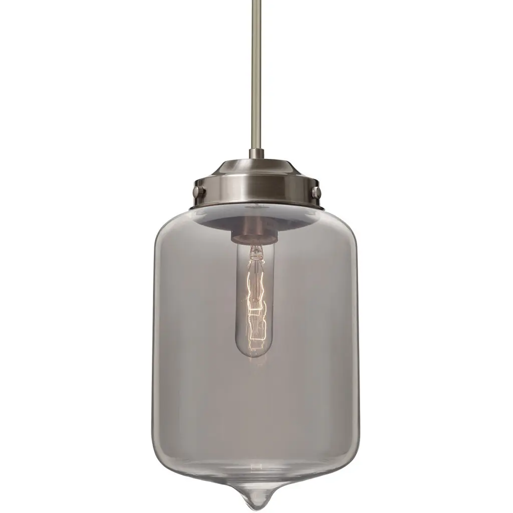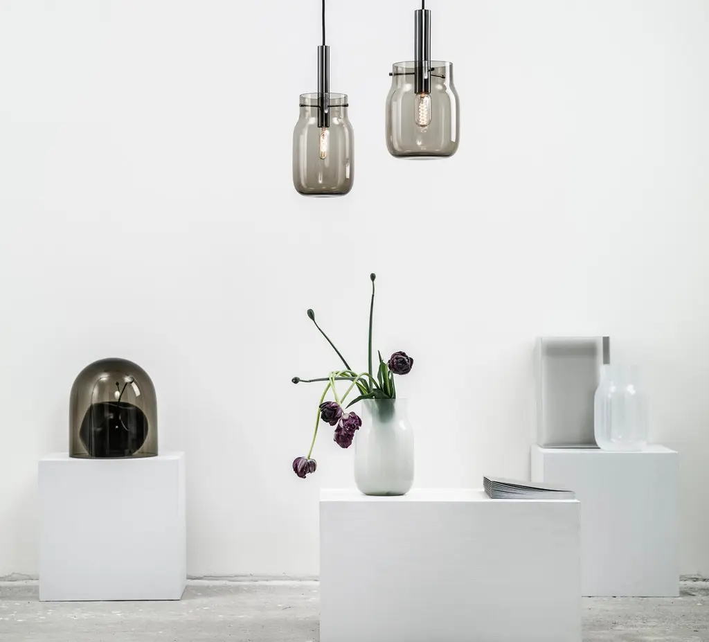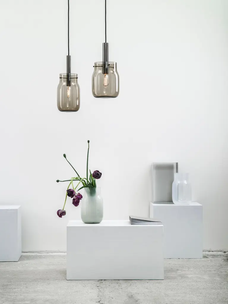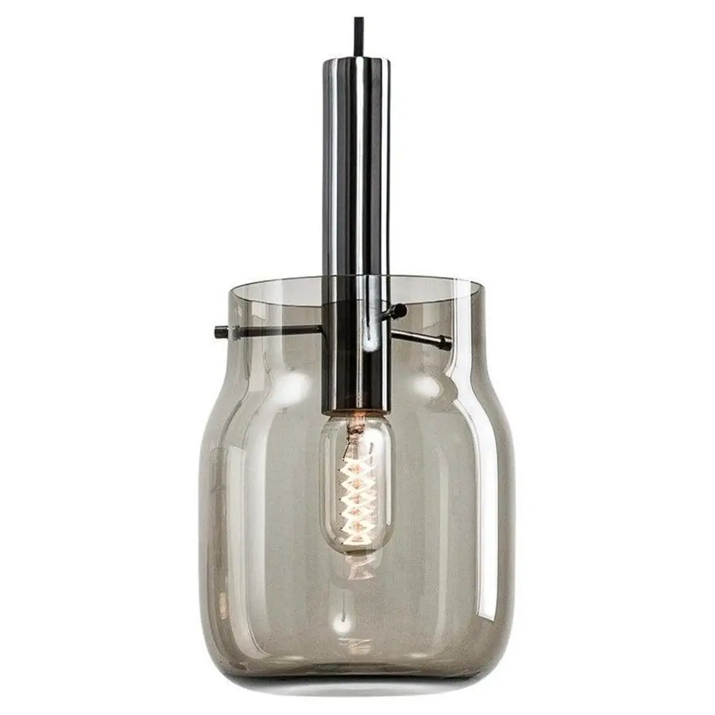 Big Bandaska pendant light by Dechem Studio.Dimensions: D 18 x H 180 cm.Materials: brass, glass.Also available: different colours and sizes available.Hand-blown into beech wood moulds, Bandaska Lights is based on the highly popular Bandaska Vase collection. DECHEM‘s signature shape turns into an elementary suspended lamp whose crystal clear or colour gradient glass shades are complemented by copper, brass or anthracite coated metal fixtures.Glass, just like people or trees, is perfectly capable of being shaped and formed. One can imprint just about anything into it, give it a form, capture a passing moment, breath a new life into it. Later it stiffens and freezes like a petrified fossil, like magma, like a witness. No one can move it. It is solid as a rock and if you urge it, it rather shatters into pieces than to surrender.We are DECHEM.We are Michaela and Jakub, designers and storytellers in Bohemian glass. Our work is based on contemporary design combined with a mastery of production and a healthy respect for old Central European craft and traditions.We design, produce and sell our collections of lights and decorative glass products. We produce unique light fixtures made from a combination of mouth-blown glass and handcrafted brass. Our glamorous chandeliers light up any space with a playful yet elegant appearance.A significant component of our work is blowing glass into a colour gradient. The wide range of fresh gradient colours is a distinctive feature of the Bandaska vase from our collection. It draws inspiration from traditional milk containers, well-known in Czech village households, and their elegant lines are now coming into modern homes in the form of our glass vases and lights.In addition to our normal production, we love to devise bespoke luminous objects for interiors. They arise from experimenting with unconventional materials and unusual combinations.Along with our own work, we like to be part of special collaborations and exhibitions. We have collaborated with renowned galleries and institutions, and curated and exhibited projects in Milano, London, Frankfurt, Istanbul and several other cities around the world.All of our creations are manufactured with care in Czech workshops using unique methods, including hand-blowing, snapping, cutting, grinding, firing, engraving and glass painting.We founded DECHEM studio in Prague in 2012 as partners in both work and life after years of studying glass craft and design, and we have grown it into a renowned and award-winning design studio.