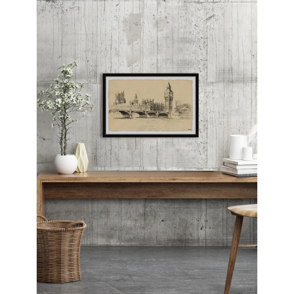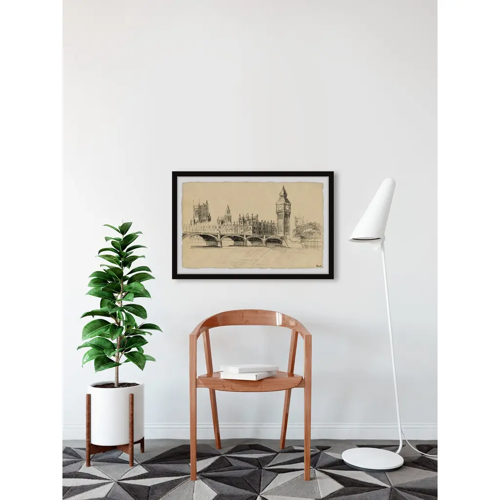 This detailed drawing print features the city of London and Big Ben at the forefront. Proudly printed in the USA, this piece is printed on high quality archive paper and professionally hand-framed. With wall-mounting hooks included, this artful accent is ready to hang up as soon as it reaches your front door. • Top quality Giclee print on high resolution Archive Paper • Hand cut deckled edges • High quality durable non-warping frame • Finished under shatter resistant plexiglass • Arrives ready to hang • Includes a certificate of authenticity • Printed in the USA
