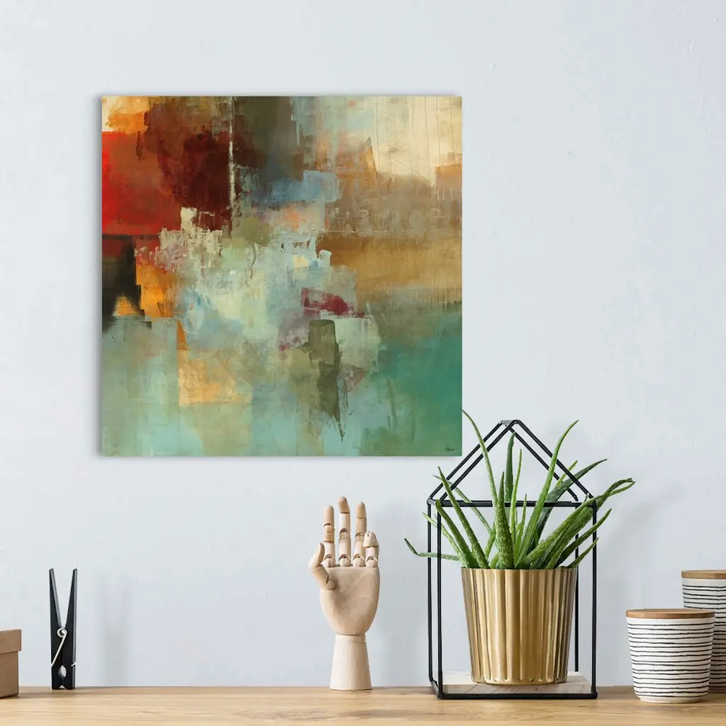 Large, square contemporary painting in a variety of warm and cool colors of patchy, square and rectangular shapes, with sponge like brush strokes.