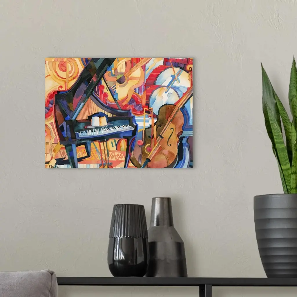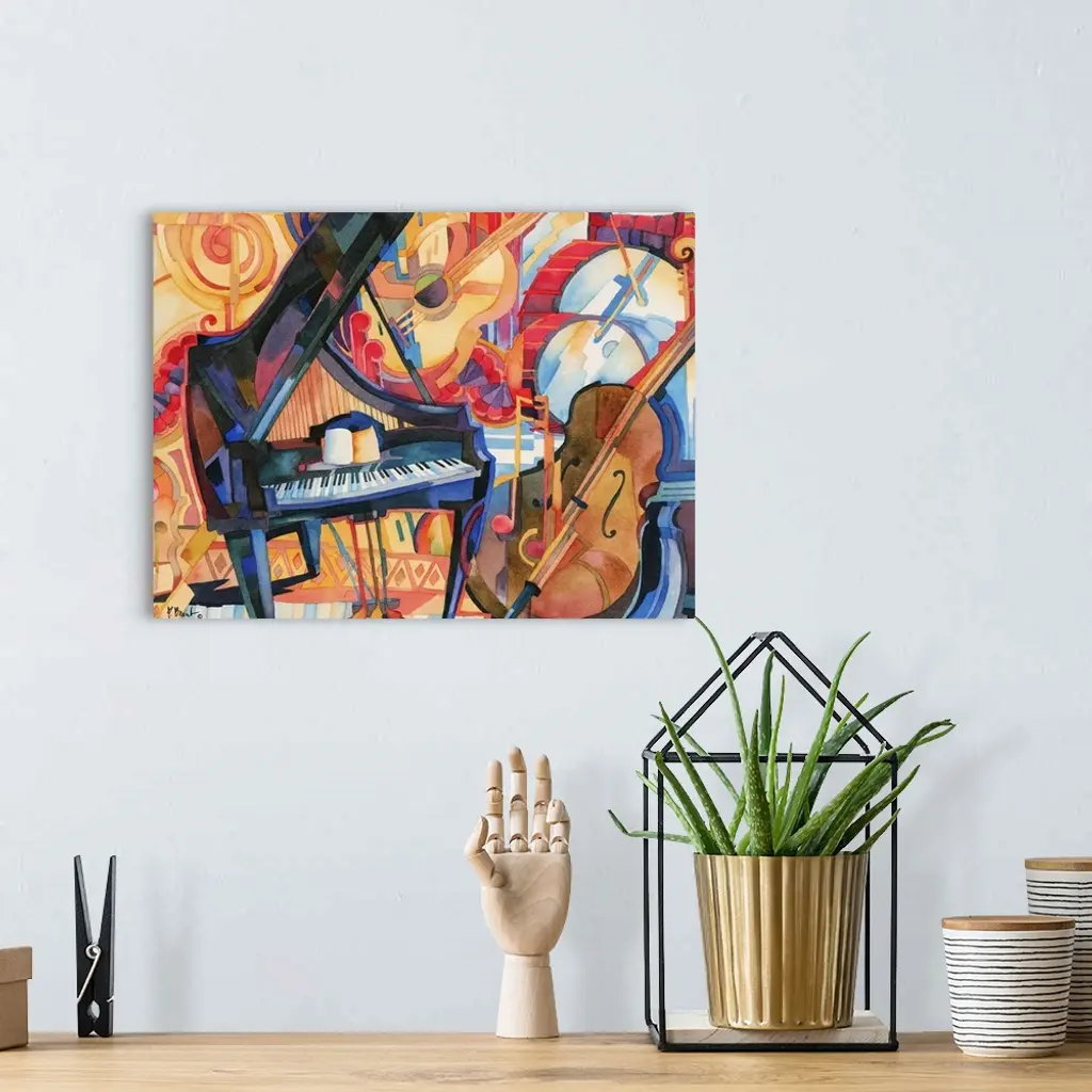 Painting of jazz instruments, including a bass, grand piano, and drum kit.