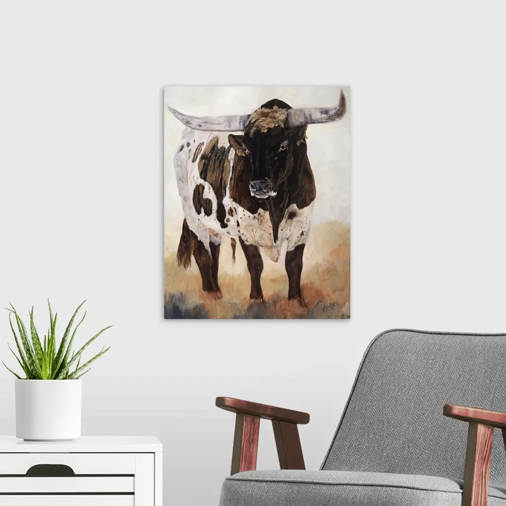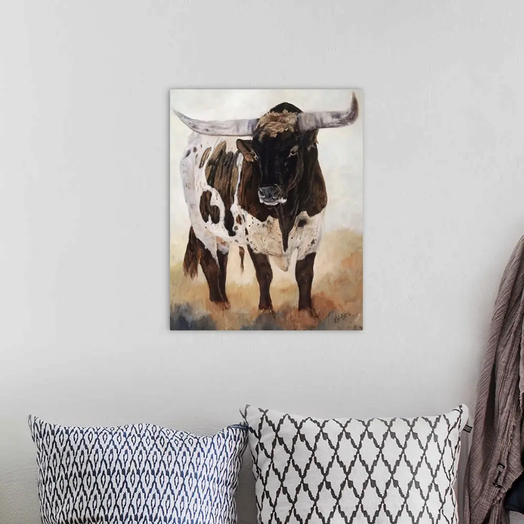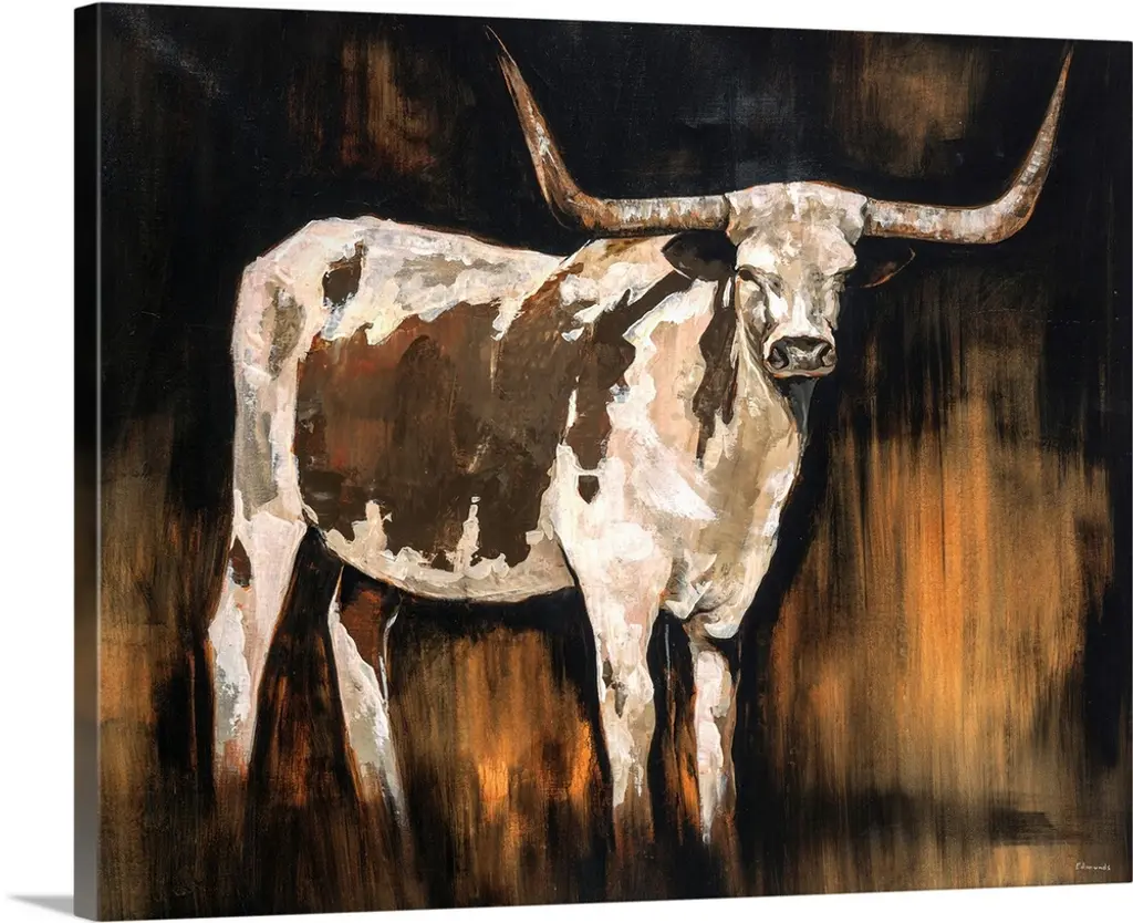 Horizontal contemporary artwork of a longhorn cow grazing on a field in warm tones.