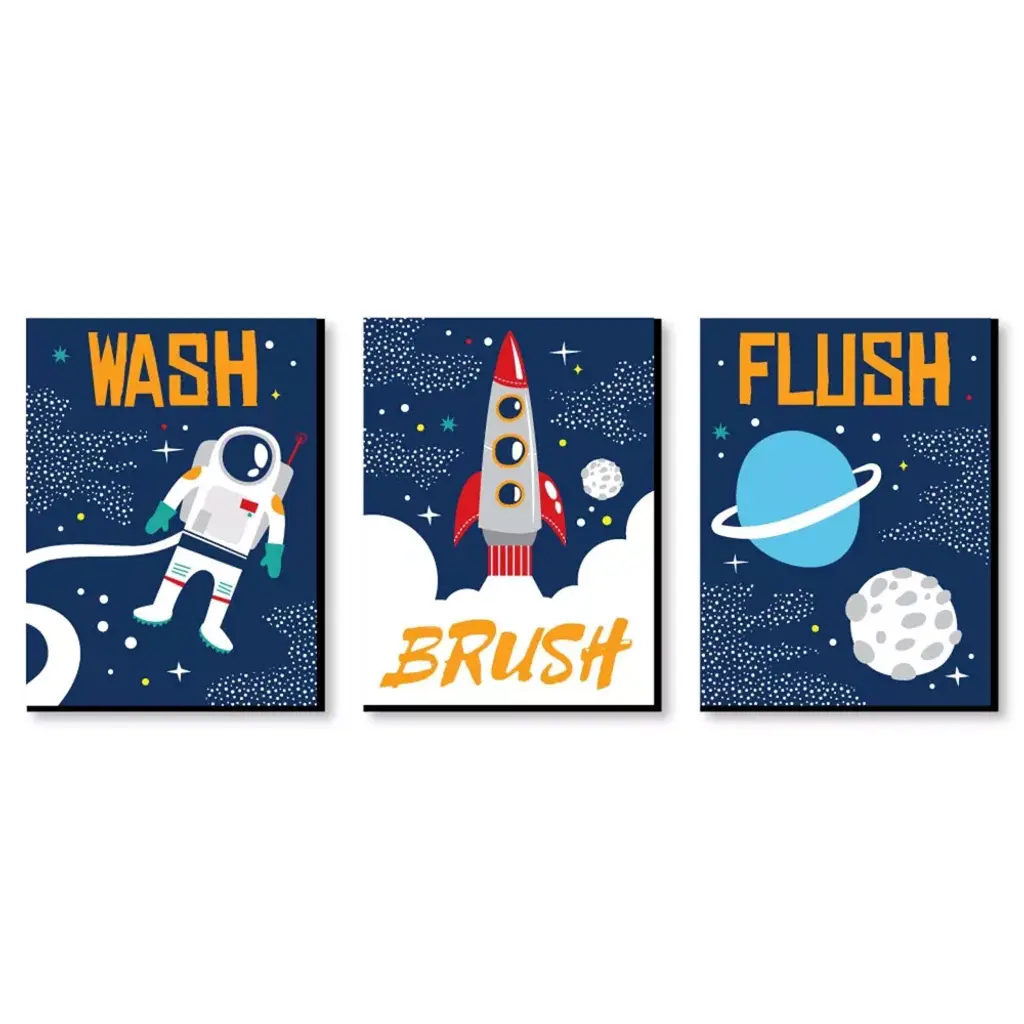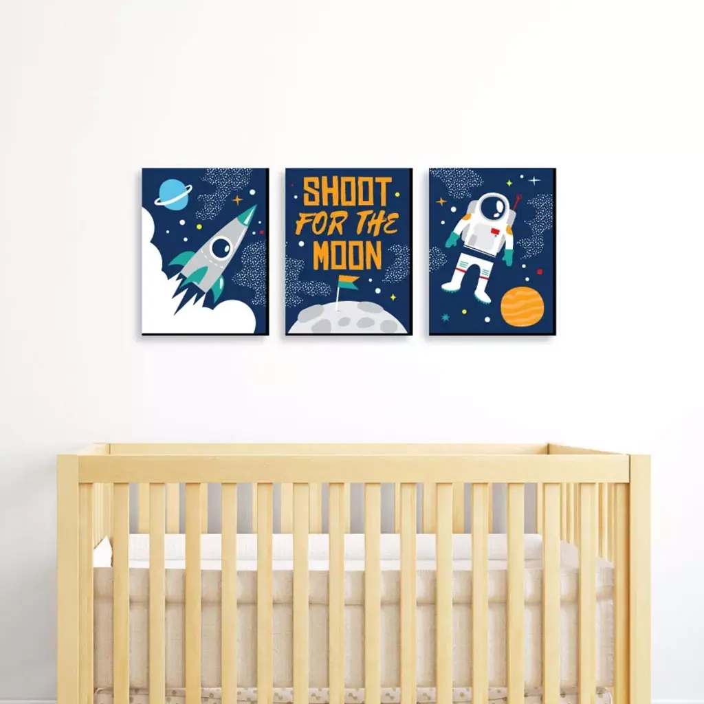 Blast Off to Outer Space Wall Art Set INCLUDES 3 ready-to-hang baby shower or birthday themed panels and non-marking wall mounts for easy hanging. Blast Off to Outer Space artwork is perfect for a nursery, kids room or playroom. Blast Off to Outer Space Wall Art & Kids Room Decor SIZE each 10 inches high x 7.5 inches wide x .5 inches thick. Boy or Girl lightweight art prints will arrive ready to use - no frame needed. The black edge gives each print a modern, finished look. EASY TO HANG: Simply attach a non-marking wall mount (included) to each corner of a Blast Off to Outer Space art panel and press to hang in desired location. Wall mounts are repositionable, so you can redesign your artwork display at any time. PREMIUM HOME DECOR: 3-piece Blast Off to Outer Space Wall Art Set is professionally printed on thick material with a black edge. You will not need to frame this set of rocket ship room decor. Each standout print is ready to hang and will add a contemporary touch to any room. MADE IN THE USA: Blast Off to Outer Space Nursery Wall Art & Kids Room Decor is designed and manufactured at our Wisconsin facility using materials that are Made in the USA.