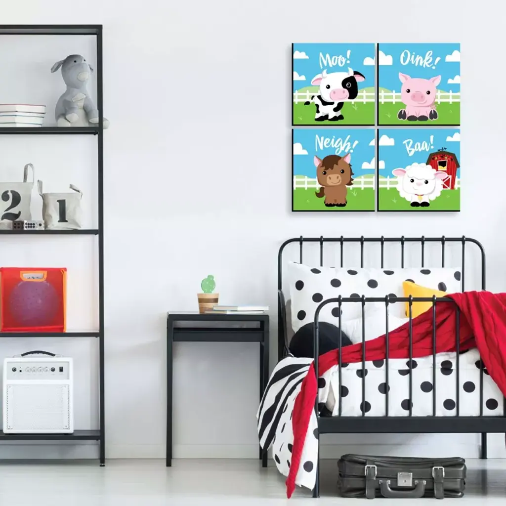 Farm Animals Wall Art Set INCLUDES 4 ready-to-hang barnyard themed panels and non-marking wall mounts for easy hanging. Farm Animals artwork is perfect for home decor. Farm Animals Kids Room, Nursery and Home Decor SIZE each 10 inches high x 7.5 inches wide x .5 inches thick. Barnyard lightweight art prints will arrive ready to use - no frame needed. The black edge gives each print a modern, finished look. EASY TO HANG: Simply attach a non-marking wall mount (included) to each corner of a Farm Animals art panel and press to hang in desired location. Wall mounts are repositionable, so you can redesign your artwork display at any time. PREMIUM HOME DECOR: 4-piece Farm Animals Wall Art Set is professionally printed on thick material with a black edge. You will not need to frame this set of barnyard room decor. Each standout print is ready to hang and will add a contemporary touch to any room. MADE IN THE USA: Farm Animals Room Decor is designed and manufactured at our Wisconsin facility using materials that are Made in the USA.