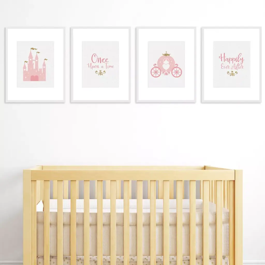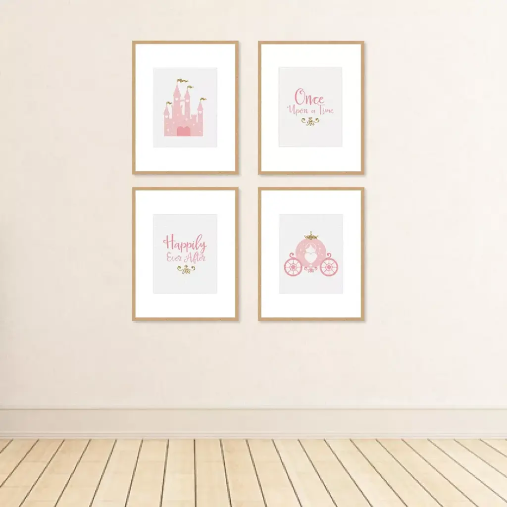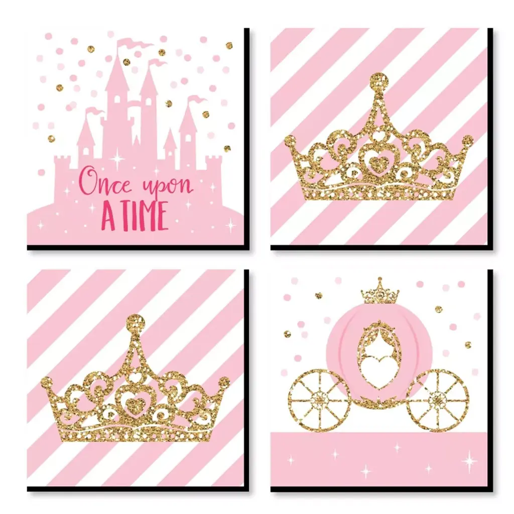 Little Princess Crown Artisms INCLUDES: Set of 4 linen paper wall art prints. Each print SIZE 8 inches x 10 inches. These 4 unframed prints are perfect home decor for Child's nursery, playroom, bathroom or bedroom. WALL ART SET: Pink and gold unframed prints are a coordinating set of 4 prints that will give your wall a pulled together look. This set is printed for vertical wall art display. Choose to display as gallery wall set or use each print to style 4 individual moments throughout your home. HOME DECOR: Give your home a contemporary room update with Little Princess Crown art prints. This set of 4 Child's nursery, playroom, bathroom or bedroom design prints feature a castle, carriage, "Once Upon a Time", and "Happily Ever After". HIGH-QUALITY ART PRINTS: Little Princess Crown vertical wall art prints are professionally printed one-sided on textured linen paper. Linen paper gives these prints a fine finish. Set of 4 wall art prints will come unframed, giving you the creative direction to display how you like. Each linen paper print measures 8 inches x 10 inches. MADE IN THE USA: Little Princess Crown linen paper wall art set is designed and manufactured at our Wisconsin facility using materials that are Made in the USA. Little Princess Crown art prints use a No-Mess Glitter Print: Our unframed wall art prints are designed with a printed image of glitter, eliminating glitter flake while maximizing bling effect!