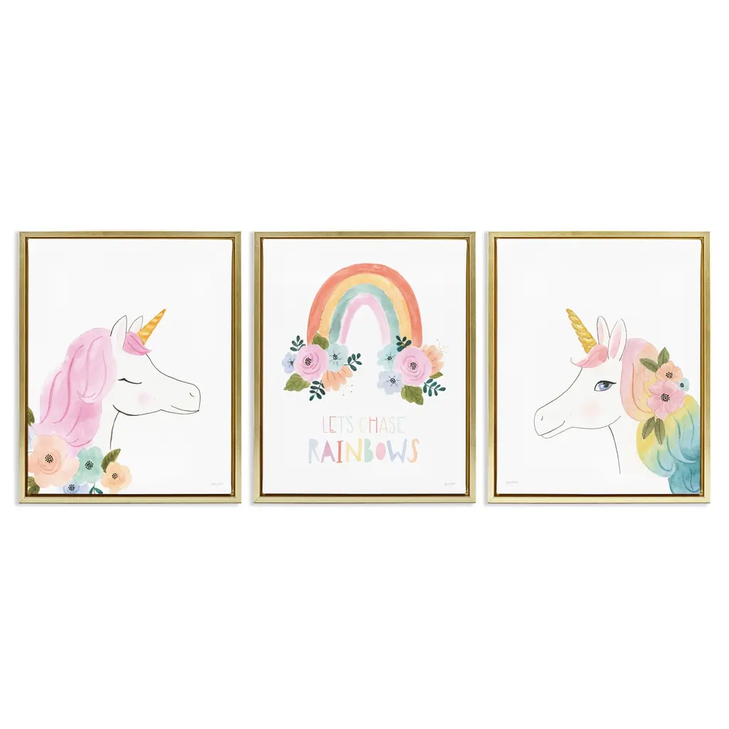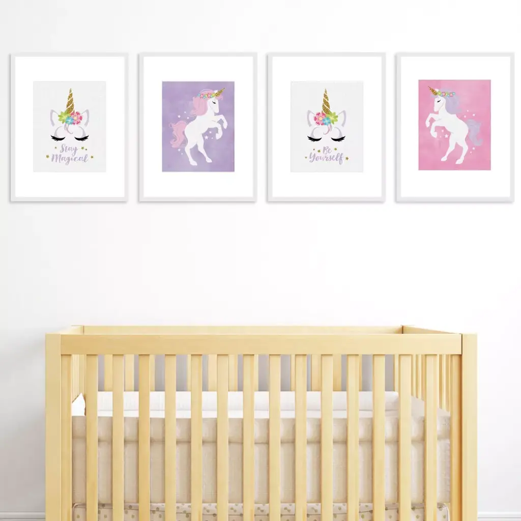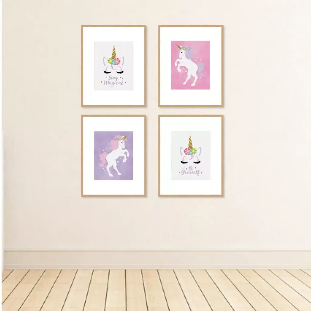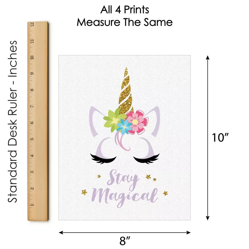 Rainbow Unicorn Artisms INCLUDES: Set of 4 linen paper wall art prints. Each print SIZE 8 inches x 10 inches. These 4 unframed prints are perfect home decor for Child's nursery, playroom, bathroom or bedroom. WALL ART SET: Magical unicorn unframed prints are a coordinating set of 4 prints that will give your wall a pulled together look. This set is printed for vertical wall art display. Choose to display as gallery wall set or use each print to style 4 individual moments throughout your home. HOME DECOR: Give your home a contemporary room update with Rainbow Unicorn art prints. This set of 4 Child's nursery, playroom, bathroom or bedroom design prints feature unicorns, "Stay Magical", and "Be Yourself". HIGH-QUALITY ART PRINTS: Rainbow Unicorn vertical wall art prints are professionally printed one-sided on textured linen paper. Linen paper gives these prints a fine finish. Set of 4 wall art prints will come unframed, giving you the creative direction to display how you like. Each linen paper print measures 8 inches x 10 inches. MADE IN THE USA: Rainbow Unicorn linen paper wall art set is designed and manufactured at our Wisconsin facility using materials that are Made in the USA. Rainbow Unicorn art prints use a No-Mess Glitter Print: Our unframed wall art prints are designed with a printed image of glitter, eliminating glitter flake while maximizing bling effect!