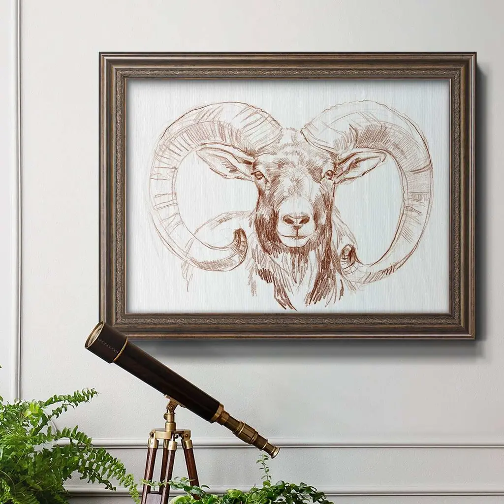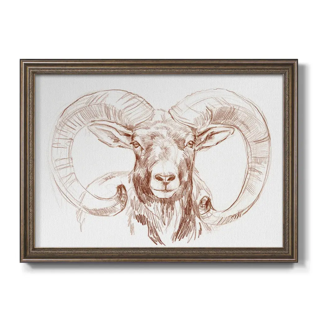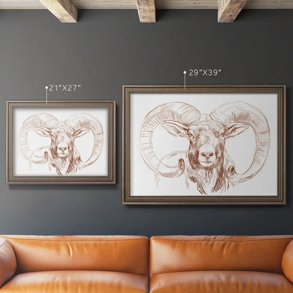 Big Horn Sheep I Premium Framed Canvas- Ready to Hang A Premium Framed Canvas created to last. Framed in distressed wood and available in an array of sizes and colors Featuring a beveled a solid wood stretcher bar, each piece comes ready to hand 3 SIZES AVAILABLE 16''X20'' - Overall Size 18'X27'' - Overall Size 24''x36'' - Overall Size Each piece is made to order. Each piece comes with hanging hardware. Made in the USA Ready to Hang Giclee Paper Print Acrylic Glass Beveled Matt Board