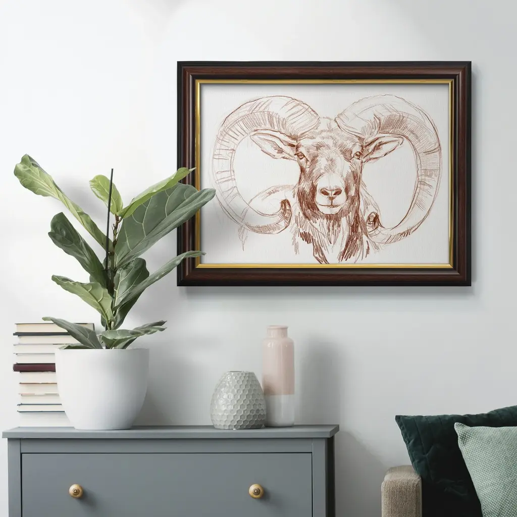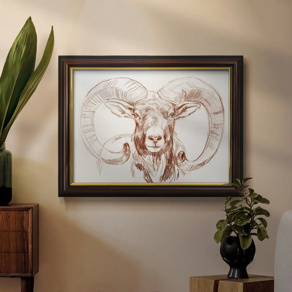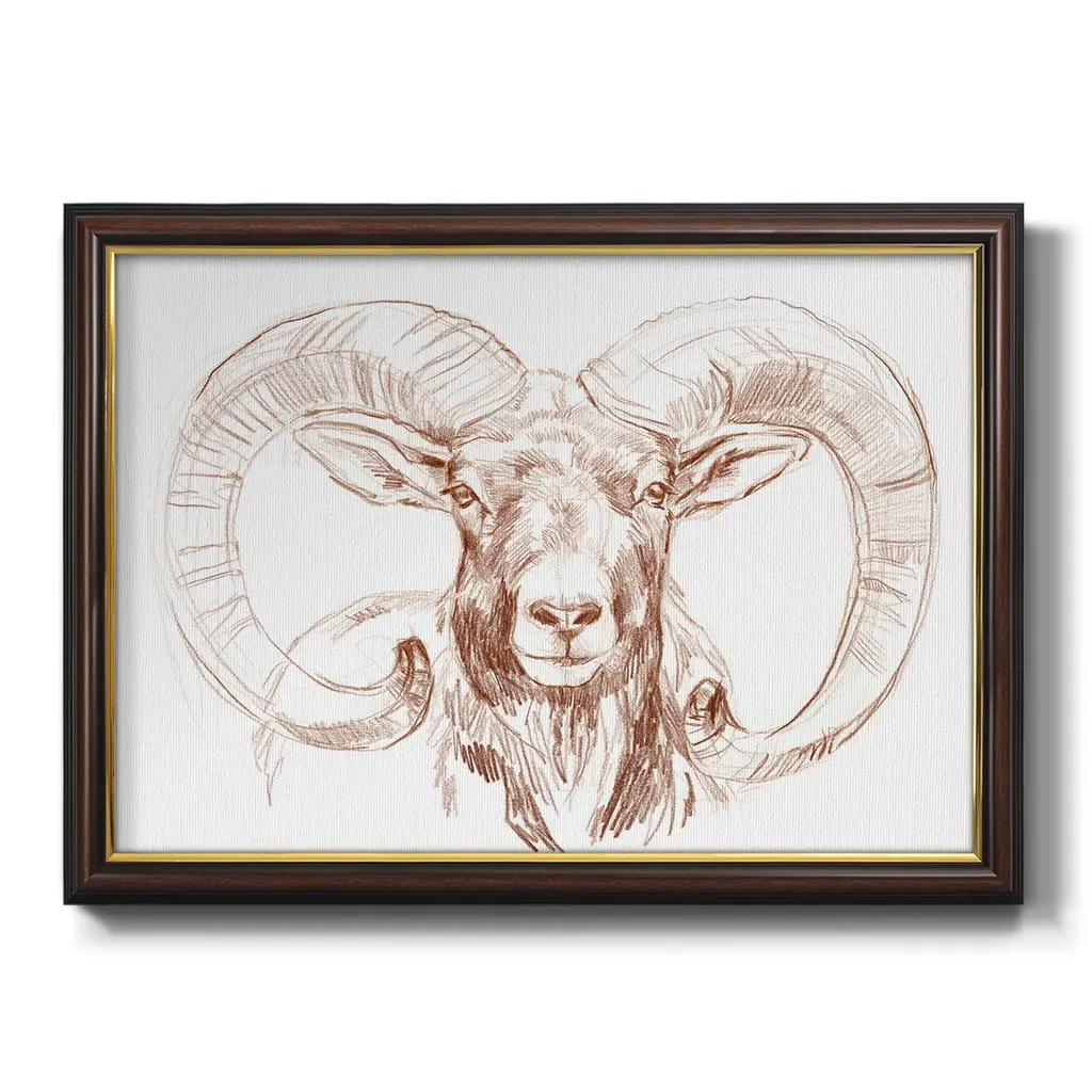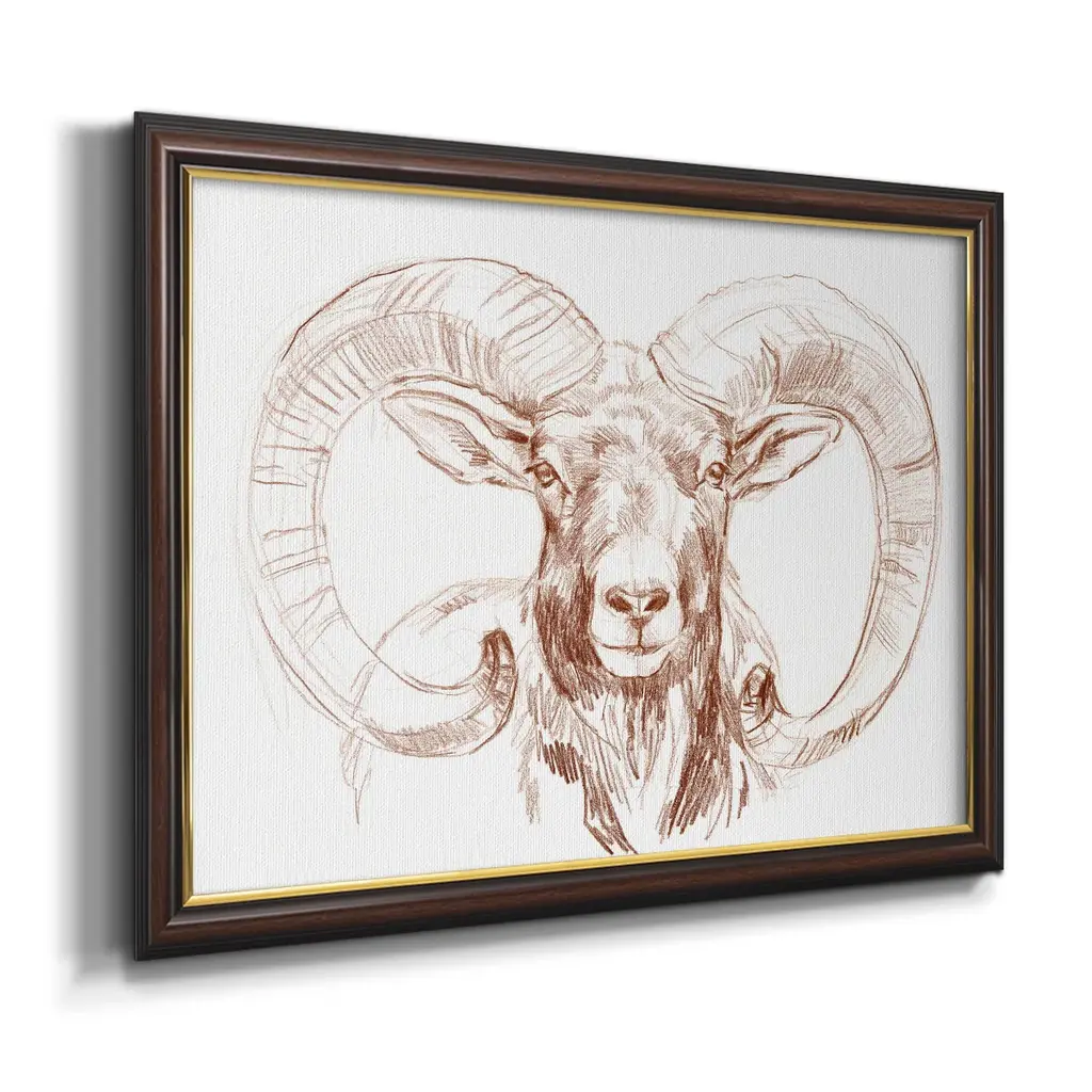 Big Horn Sheep I Premium Framed Canvas- Ready to Hang A Premium Framed Canvas created to last. Framed in distressed wood and available in an array of sizes and colors Featuring a beveled a solid wood stretcher bar, each piece comes ready to hand 3 SIZES AVAILABLE 16''X20'' - Overall Size 18'X27'' - Overall Size 24''x36'' - Overall Size Each piece is made to order. Each piece comes with hanging hardware. Made in the USA Ready to Hang Giclee Paper Print Acrylic Glass Beveled Matt Board