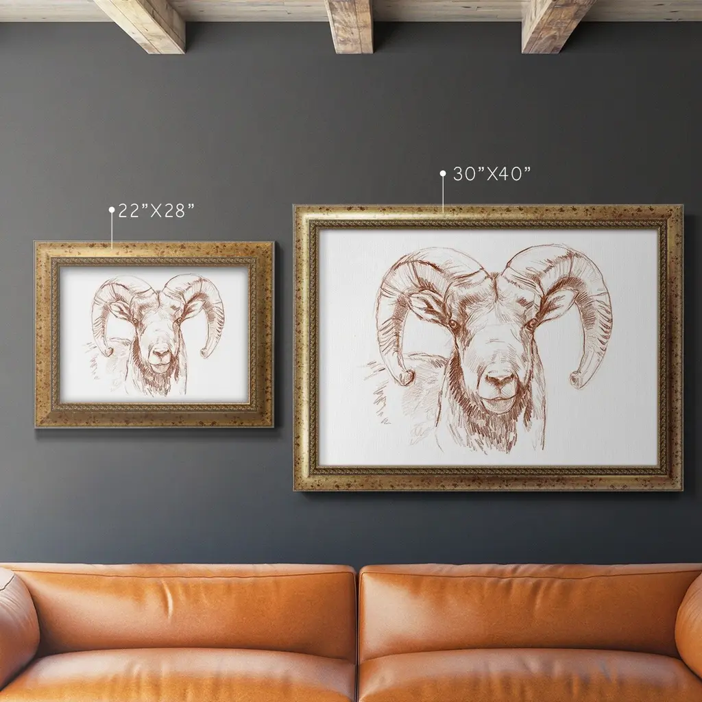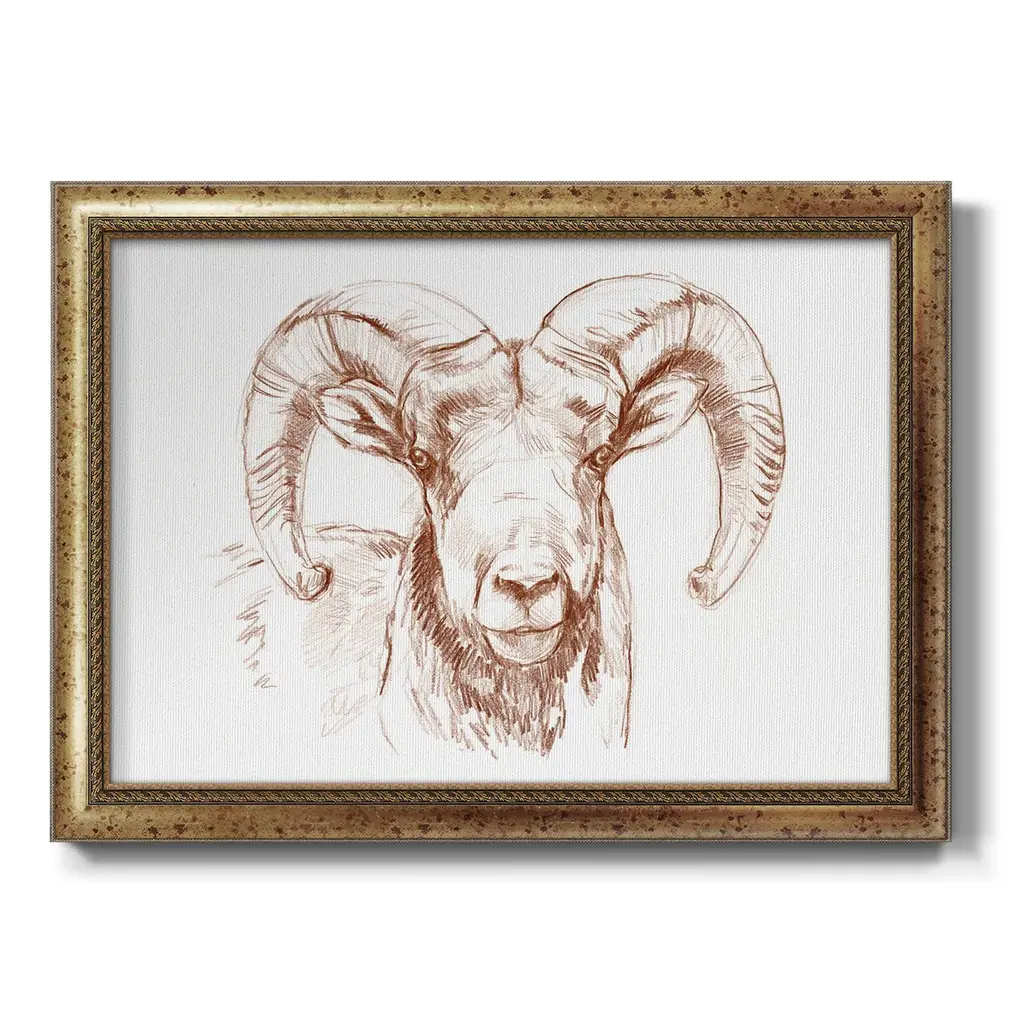 Big Horn Sheep II Premium Framed Canvas- Ready to Hang A Premium Framed Canvas created to last. Framed in distressed wood and available in an array of sizes and colors Featuring a beveled a solid wood stretcher bar, each piece comes ready to hand 3 SIZES AVAILABLE 16''X20'' - Overall Size 18'X27'' - Overall Size 24''x36'' - Overall Size Each piece is made to order. Each piece comes with hanging hardware. Made in the USA Ready to Hang Giclee Paper Print Acrylic Glass Beveled Matt Board