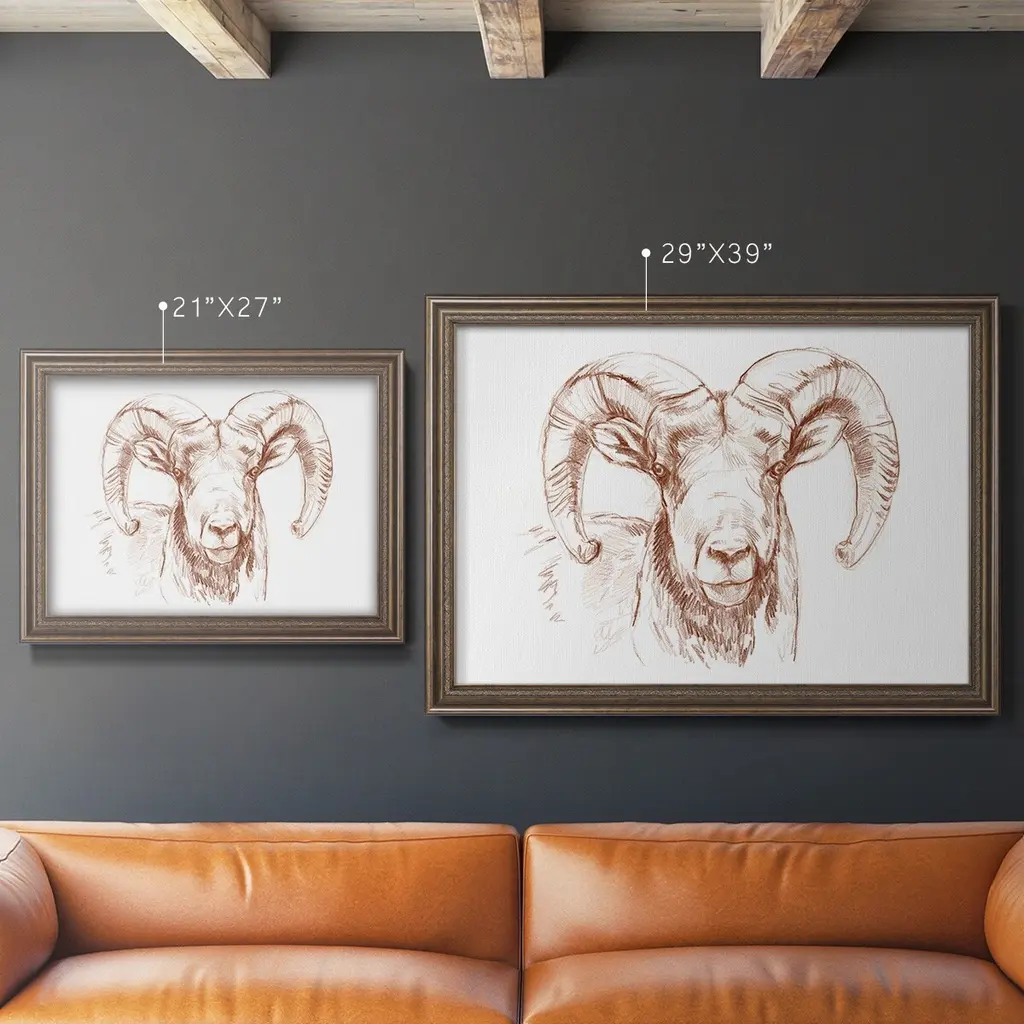 Big Horn Sheep II Premium Framed Canvas- Ready to Hang A Premium Framed Canvas created to last. Framed in distressed wood and available in an array of sizes and colors Featuring a beveled a solid wood stretcher bar, each piece comes ready to hand 3 SIZES AVAILABLE 16''X20'' - Overall Size 18'X27'' - Overall Size 24''x36'' - Overall Size Each piece is made to order. Each piece comes with hanging hardware. Made in the USA Ready to Hang Giclee Paper Print Acrylic Glass Beveled Matt Board