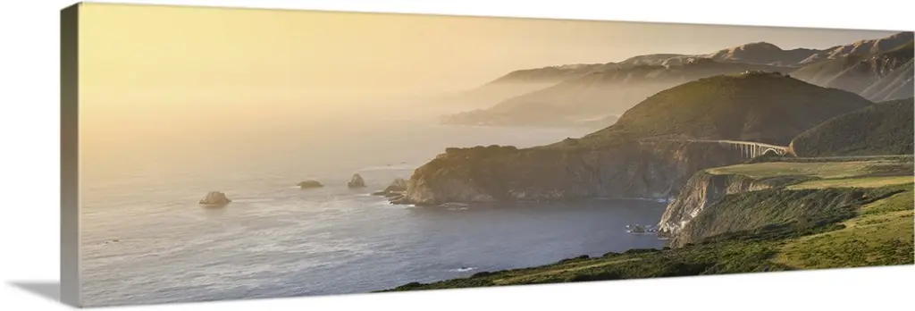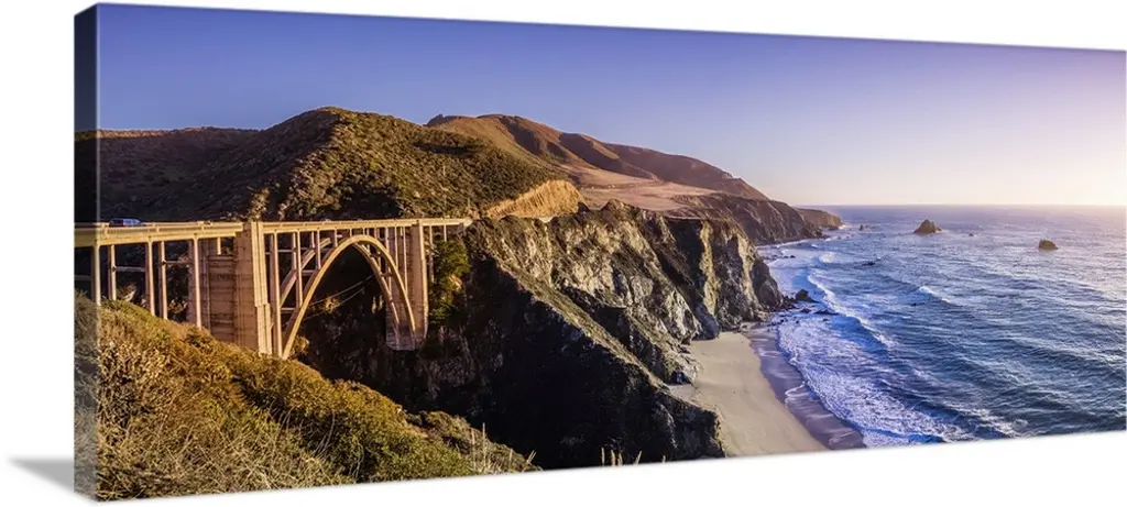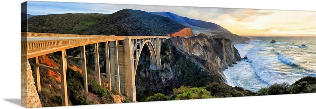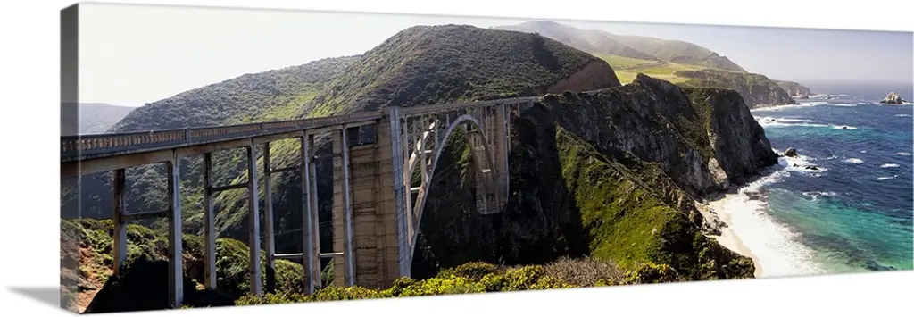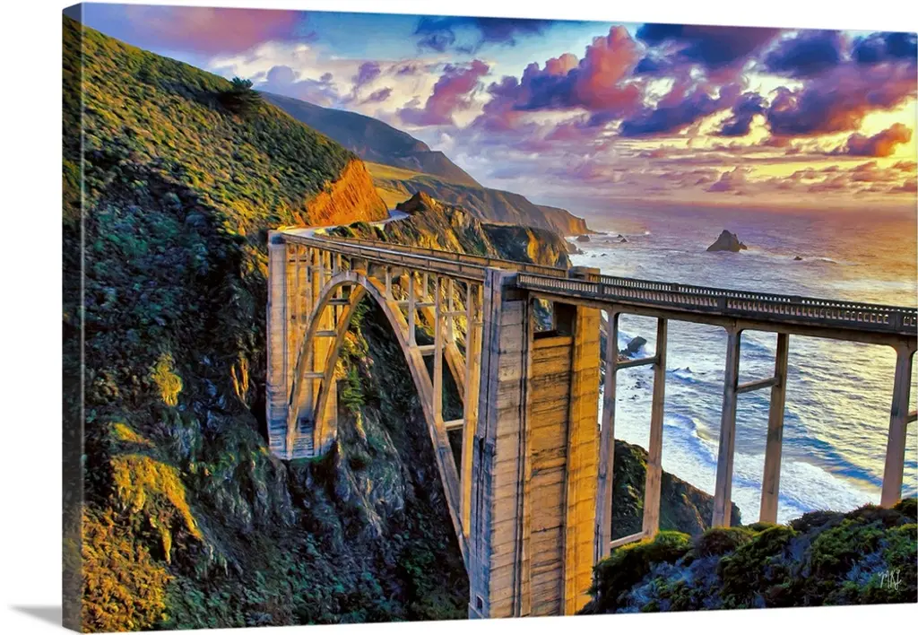 Title: Big Sur - Bixby Bridge - California-IIArtist: David AyashProduct Type: Canvas ArtSize: 30" x 47"Made in the USA.Masters Fine Art is a company that travels around the world to bring the best in fine art from different lands. They believe that art is the soul of the world and that it represents our human essence. MFA works mostly with Latin American art. It portrays a happy view of life, represented with bright beautiful colors, music, dance, love, hope and happiness, giving us the feeling that we can overcome all hardships with all the beautiful things we still have in life. Colorful, contemporary, sexy, emotional, musical, and romantic are all words to describe the art Masters Fine Art carries.This 30" x 47" canvas art is ready to hang. Giclee (jee-clay) is an advanced printmaking process for creating high quality fine art reproductions. The attainable excellence that Giclee printmaking affords makes the reproduction virtually indistinguishable from the original piece. The result is wide acceptance of Giclee by galleries, museums, and private collectors. Gallery wrap is a method of stretching an artist's canvas so that the canvas wraps around the sides and is secured to a hidden, wooden frame. This method of stretching and preparing a canvas allows for a frameless presentation of the finished print.