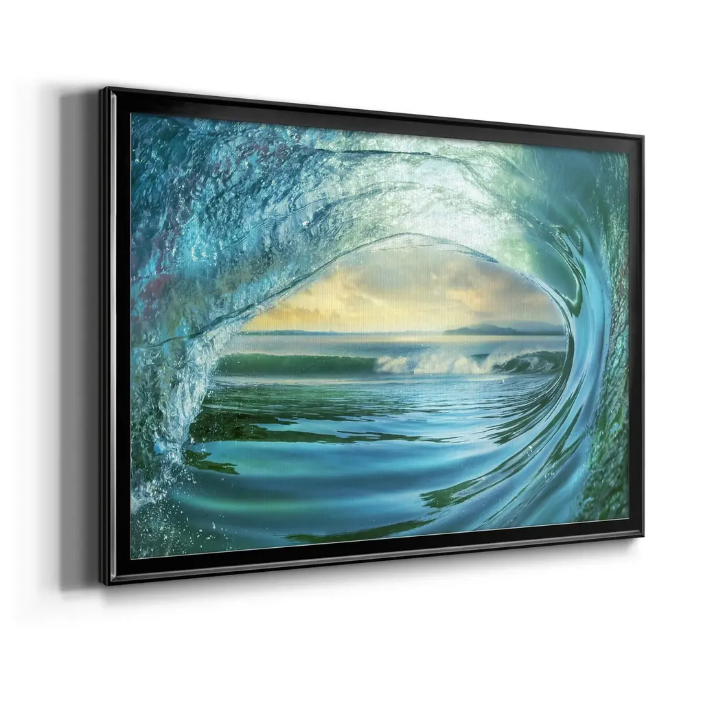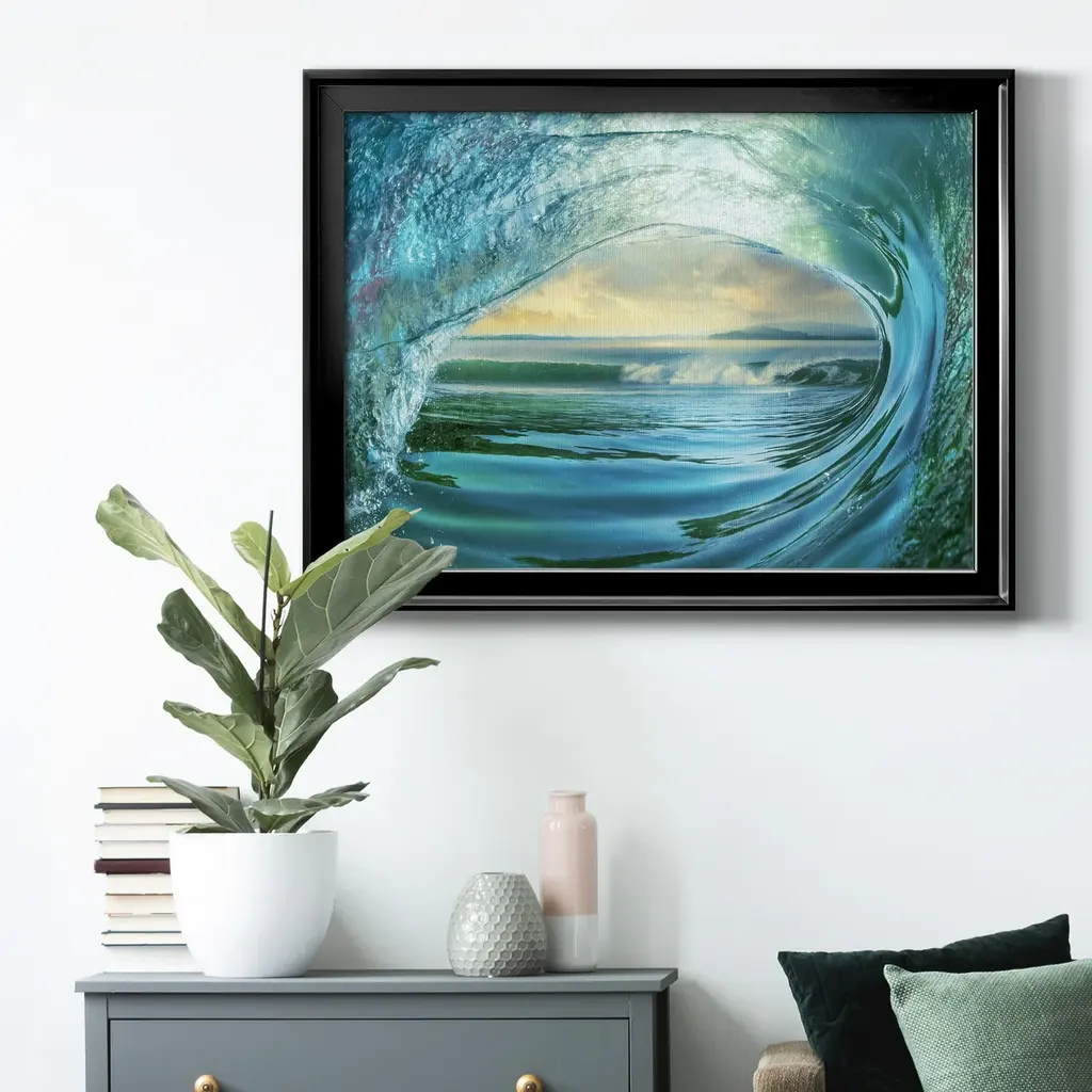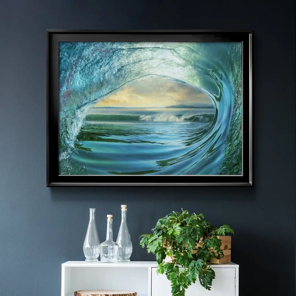 Big Wave Premium Framed Canvas - Ready to Hang A Premium Framed Canvas created to last. Framed in distressed wood and available in an array of sizes and colors Featuring a beveled a solid wood stretcher bar, each piece comes ready to hand 4 SIZES AVAILABLE 30.5''X42.5'' - Overall Size 26.5'X36.5'' - Overall Size 22''x30'' - Overall Size 18''x24'' - Overall Size Each piece is made to order. Each piece comes with hanging hardware. Made in the USA Ready to Hang Giclee Paper Print Acrylic Glass Beveled Matt Board