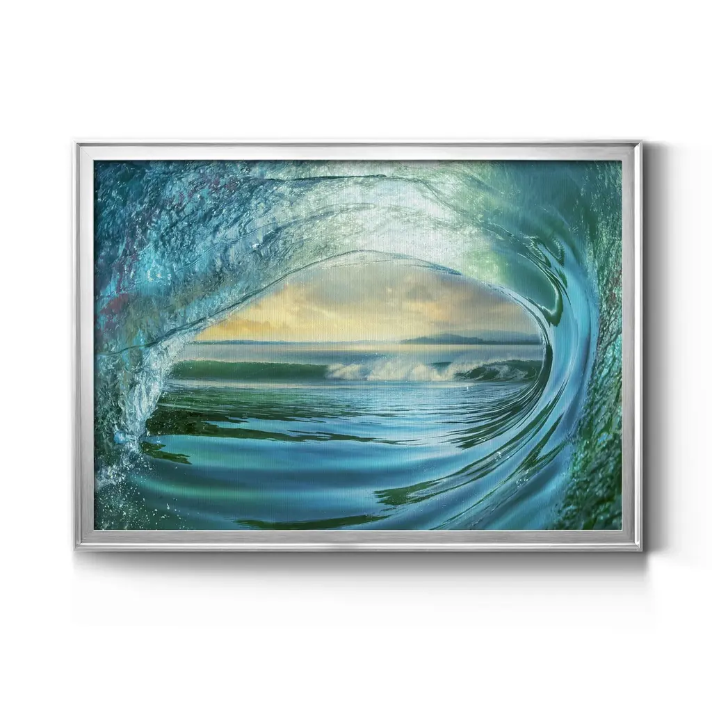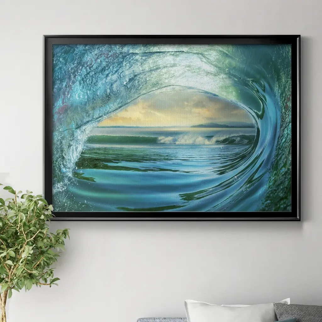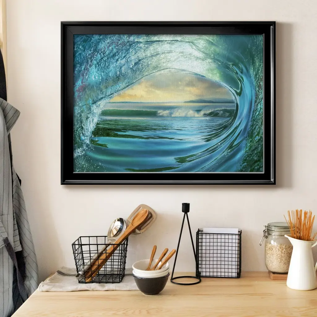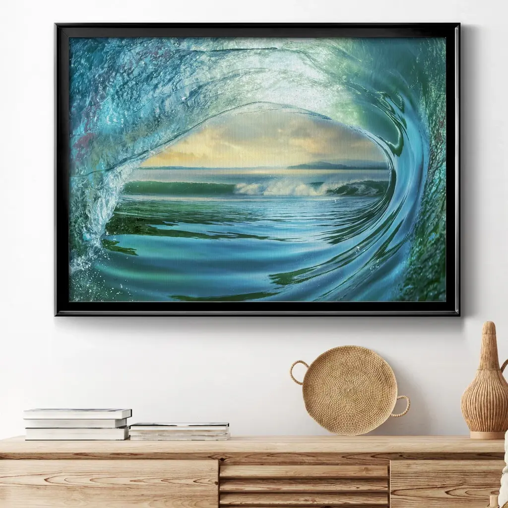 Big Wave Premium Framed Canvas - Ready to Hang A Premium Framed Canvas created to last. Framed in distressed wood and available in an array of sizes and colors Featuring a beveled a solid wood stretcher bar, each piece comes ready to hand 4 SIZES AVAILABLE 30.5''X42.5'' - Overall Size 26.5'X36.5'' - Overall Size 22''x30'' - Overall Size 18''x24'' - Overall Size Each piece is made to order. Each piece comes with hanging hardware. Made in the USA Ready to Hang Giclee Paper Print Acrylic Glass Beveled Matt Board