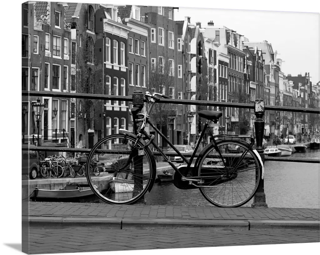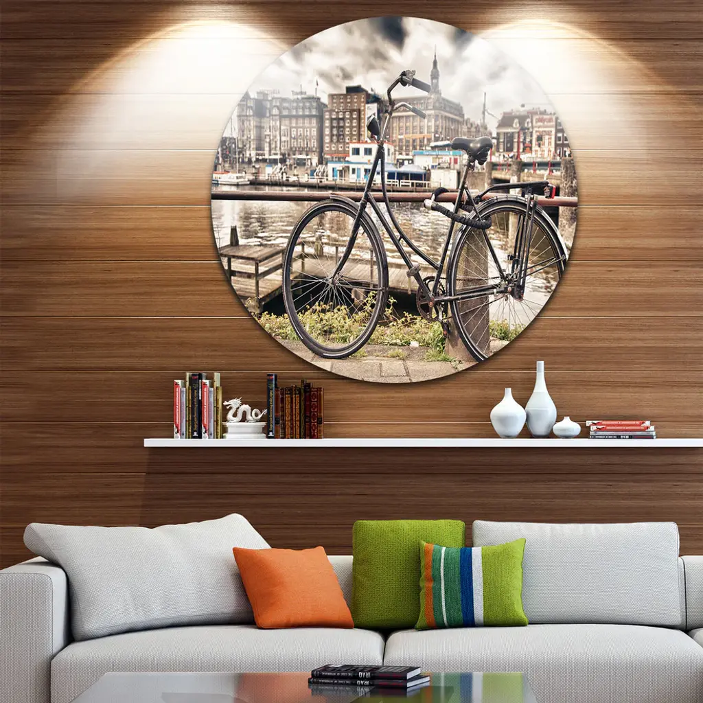 Bike Over Bridge In Amsterdam, Cityscape Photo Round Metal Artwork, 36"