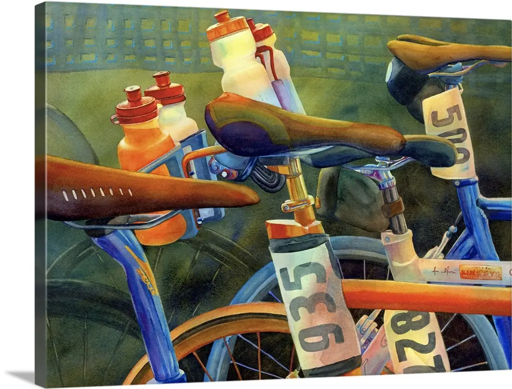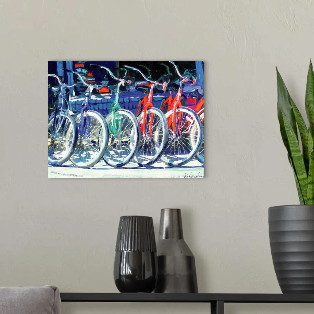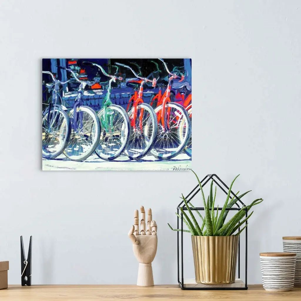 Contemporary painting of colorful bicycles parked in a row outside of a shop.