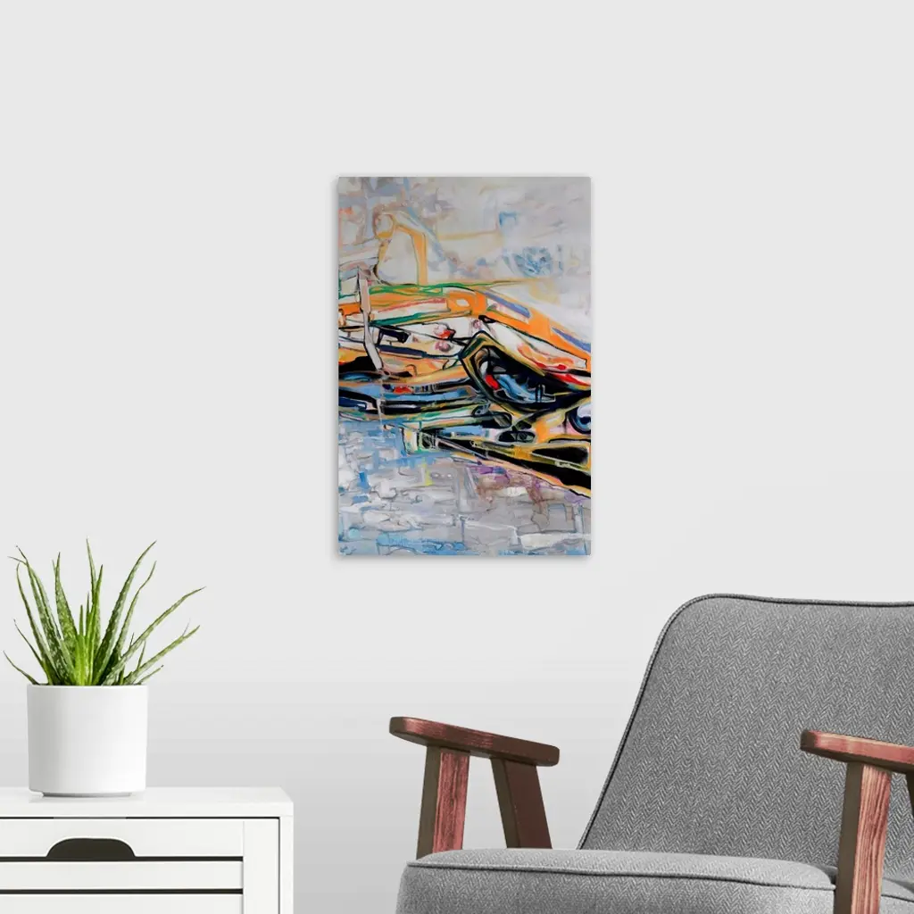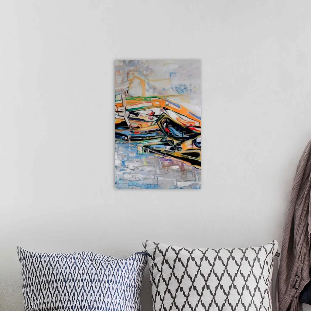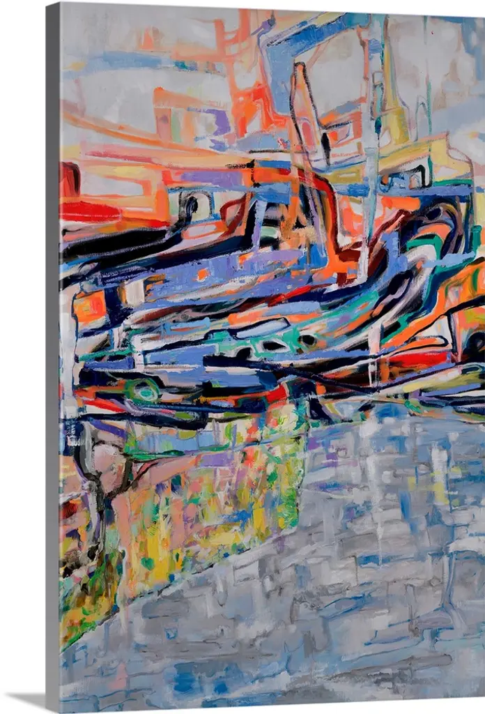 An abstract painting inspired by the Australian landscape of a cool billabong nestled amongst rugged terrain.