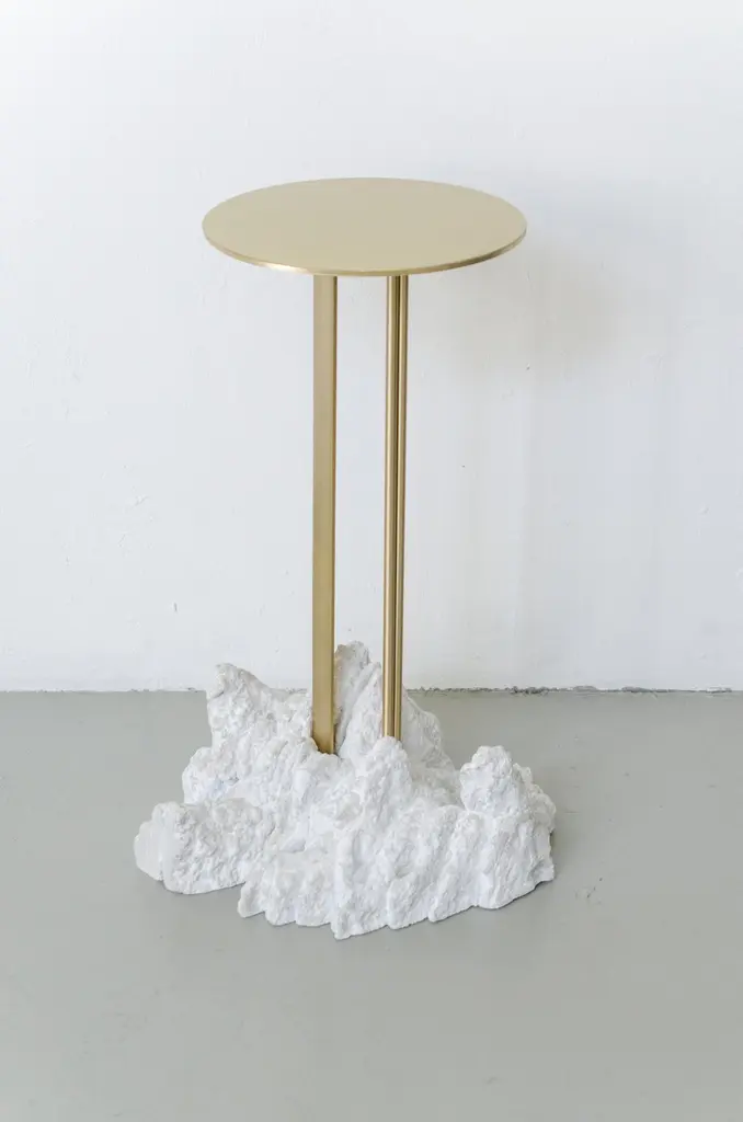 Binary brass gueridon by Adam Ruiz & Robin HervéDimensions: 70 x 45 x 45 cmMaterials: Sculpted brass and concreteHand-sculptedLimited, signed and numbered from an edition of 10.Curiosity and the common desire to develop a contemporary practice of their professions led them to enrich their projects by the diversification of techniques and the exchange of know-how. It is in this dynamic that they created sculptural objects, exploring the possible balances between their two universes and identities.Metal and concrete are very commonly used together. Adam and Robin have diverted these materials, to make them rediscover the aesthetic potential. They propose a re-reading by bringing a sensitive character, thus nourishing a dialogue with contemporary architecture.Consisting of a gueridon table and two mirrors, this series is based on contrasts that have been refined by choices of materials, surface conditions and volume equilibrium. The resulting objects establish an exchange between the crude, the random and the successful, the mastered. From these two aesthetics that oppose and complement each other, they create a language that recalls architecture and evokes the transformation of matter. This collection has been named "Binary" in reference to the combination of the two universes, techniques and materials that compose it.The GueridonIt seems fixed on the ground by a mineral mass, complex and animated. It extends, rises, and appears to emerge from the surface where it takes place. This ascension is extended by straight and vertical lines, which emerge from the mineral and break with the random shapes of the base. Affirmed by the voluminous base, their finesse reinforces the impression of elevation of the plateau which overhangs the whole. The presence of naturalness that emanates from the concrete forms is put in tension with the geometrical rigor of the metallic elements. Frank and mastered, they evoke an architectural rigor. In opposition, the mineral part inspires a raw material, with the tormented evolution. The rugged reliefs and the accumulation of strata reflect a long transformation, while the taut lines and the flat surfaces reveal an immutable state.With all these contrasts, the pedestal table integrates with contemporary architecture, while affirming its unique presence. Furniture and sculpture, he animates the space that welcomes him and constitutes an unusual pedestal for what he supports.Adam RuizWith a background in Product design and his enthusiasm for metal, a simple but demanding material, Adam studied metal arts and crafts at the ENSAAMA Olivier de Serres. Thanks to these skills, he expresses his passion for design and makes by hand every objects he presents, from the original idea to the fabrication. His items reflect his strong attachment to hand work and craftsmanship, which is illustrated by his constant willingness to establish a dialogue between the fabrication process, and a minimal and contemporary aestheticism.You’ll find his hallmark, the three letters ARZ, minted on each of his pieces.Robin HervéFollowing a course oriented towards the image and the drawing, Robin initiates craft techniques of lime during his diploma offresco-mosaic crafts at ENSAAMA. A training complementary allows it to enrich these skills by otherstechniques of traditional and contemporary decor. It opens then at the work of the volume through the concrete sculpture.Through surface coatings, sculptures and decorative objects, he is conducting research on the balance between natural and artificial within the habitat. The aesthetics he creates are inspired by the observation of "natural" phenomena. They mention in particularthe movements of matter, raw or shaped, and the impact of time on this one.Alternating workshop and on-site work, Robin now designs contemporary architectural decor elements. These coatings andvolume creations combine lime plaster, fresco painting and decorative masonry in concrete. He also collaborates withother craftsmen, for the realization of architectural decorations and painted decorations.DSAA Crafts, ENSAAMA Olivier de SerresDMA Fresco-Mosaic, ENSAAMA Olivier of greenhouses.BTS Graphic Design-Publishing-Advertising, Lycée Jean-Pierre Vernant, Sèvres.