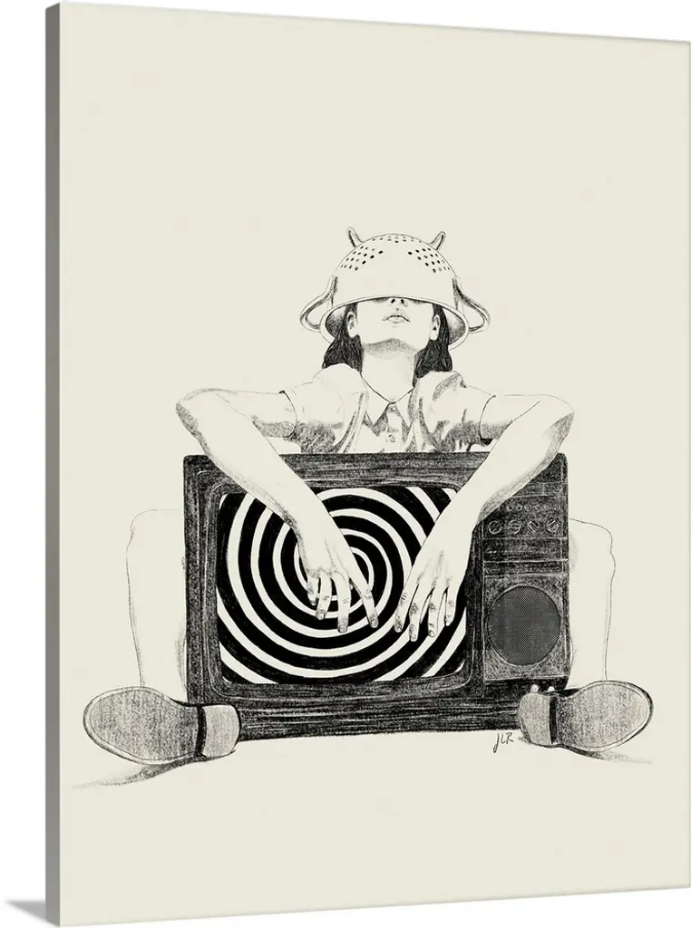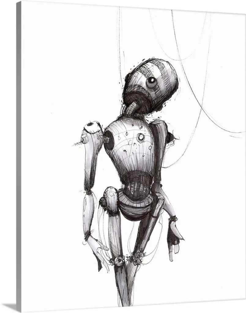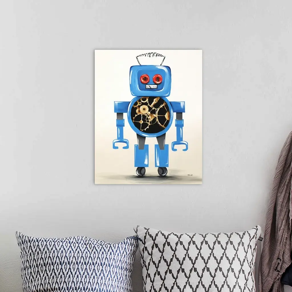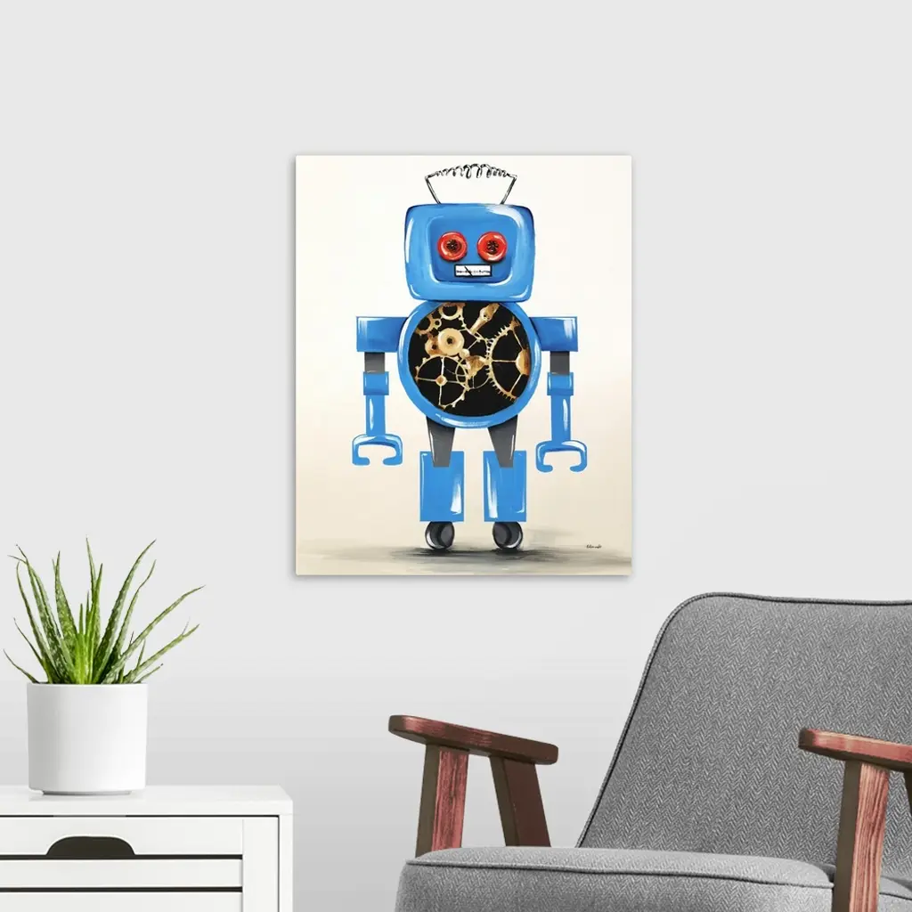 Contemporary painting of a blue robot with red button eyes and gold mechanical wheels in its stomach on a neutral colored background.
