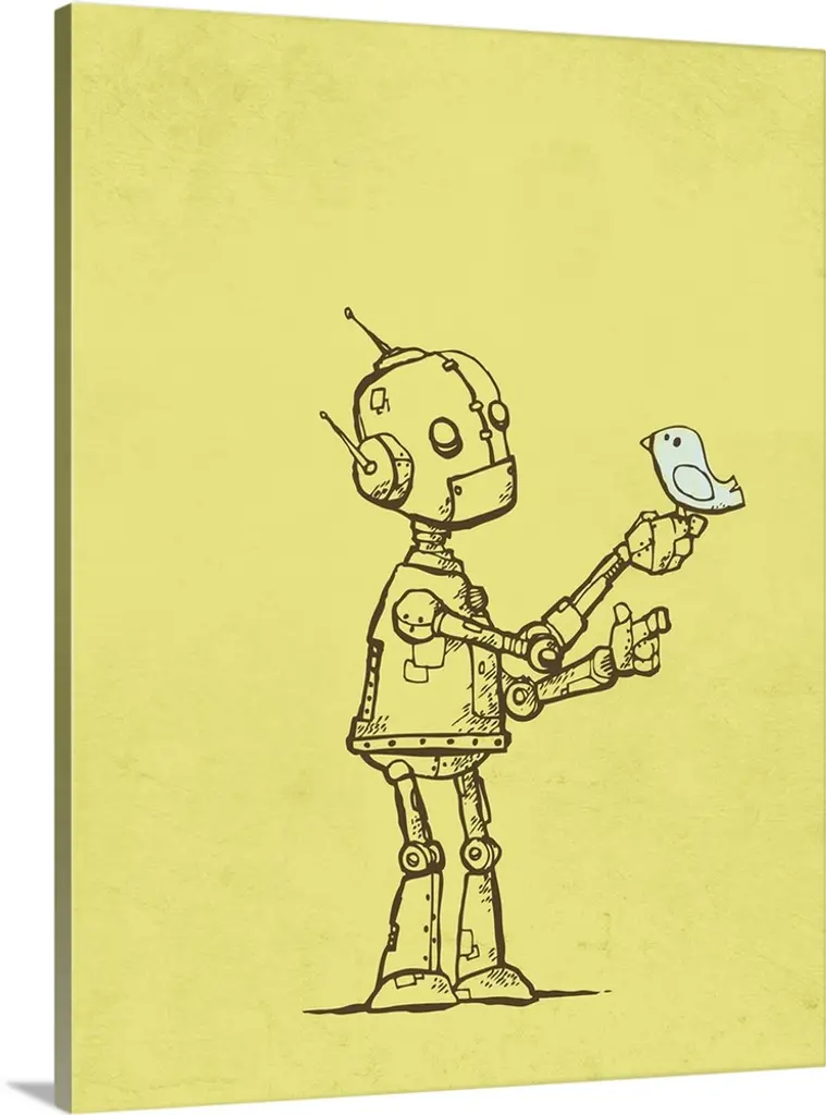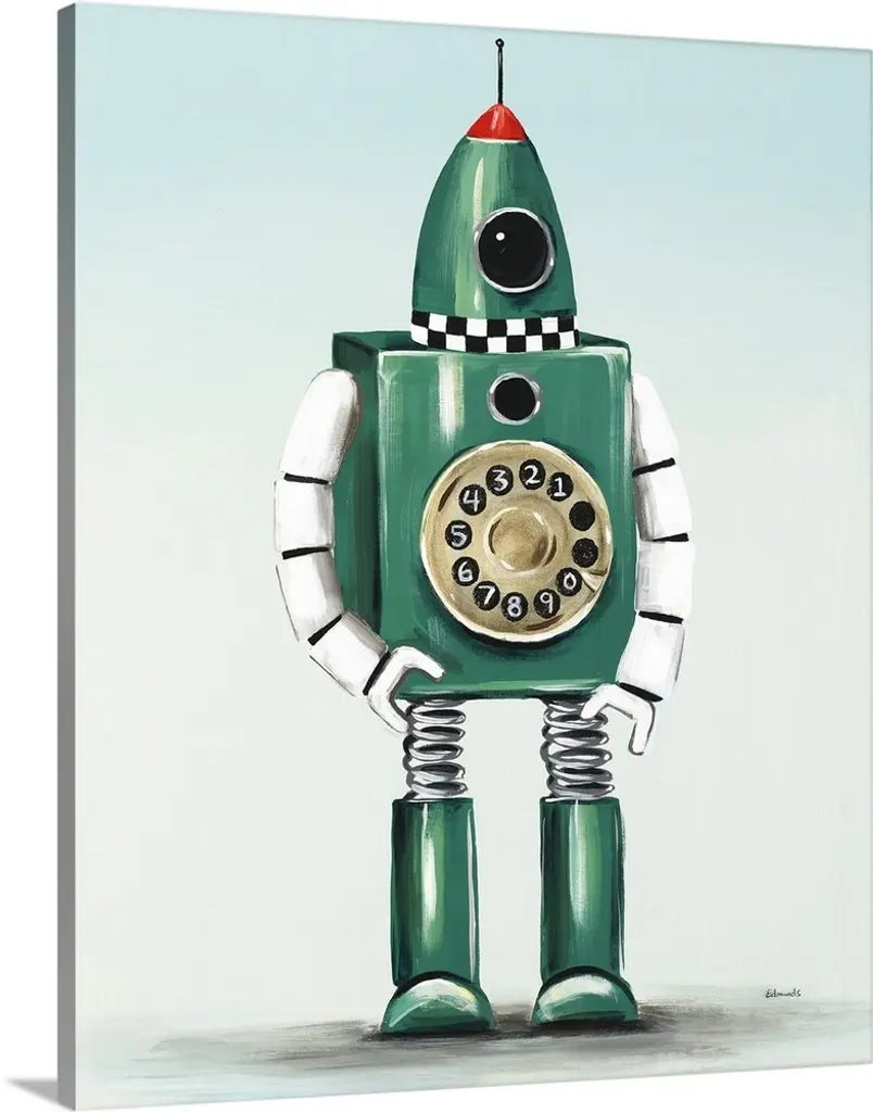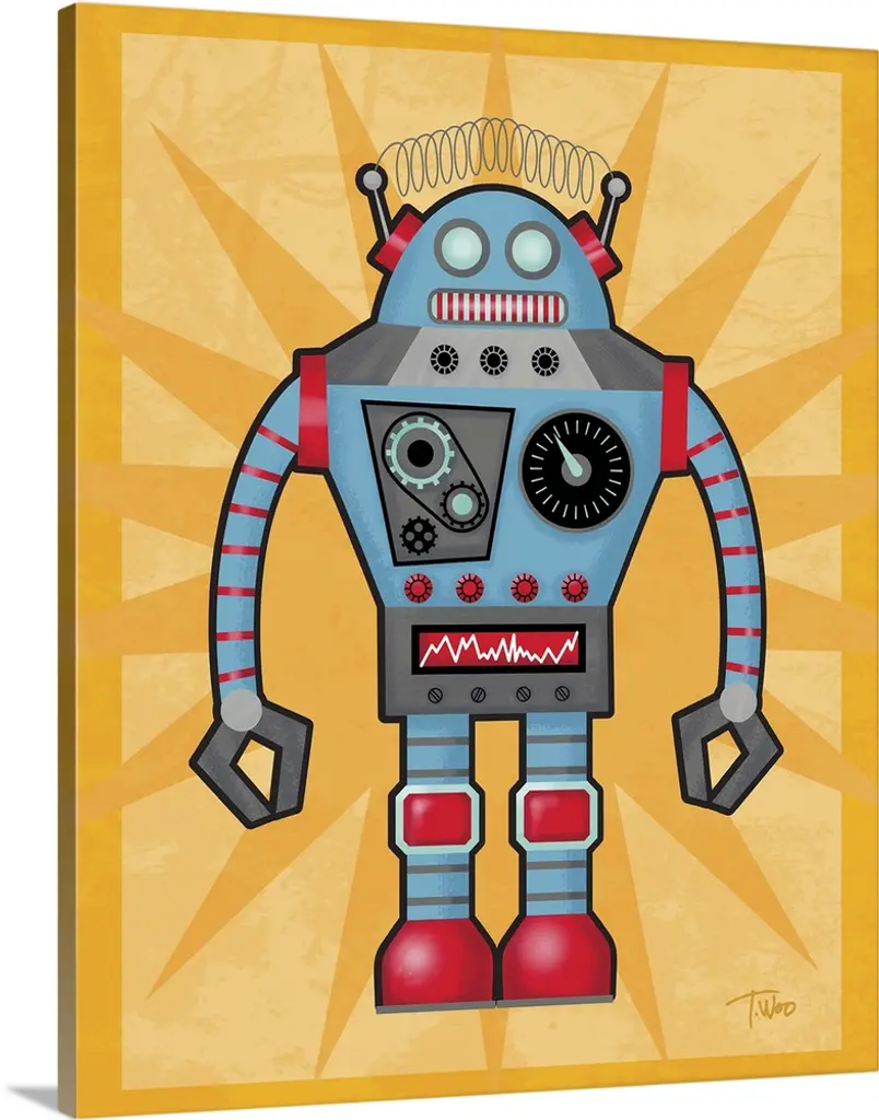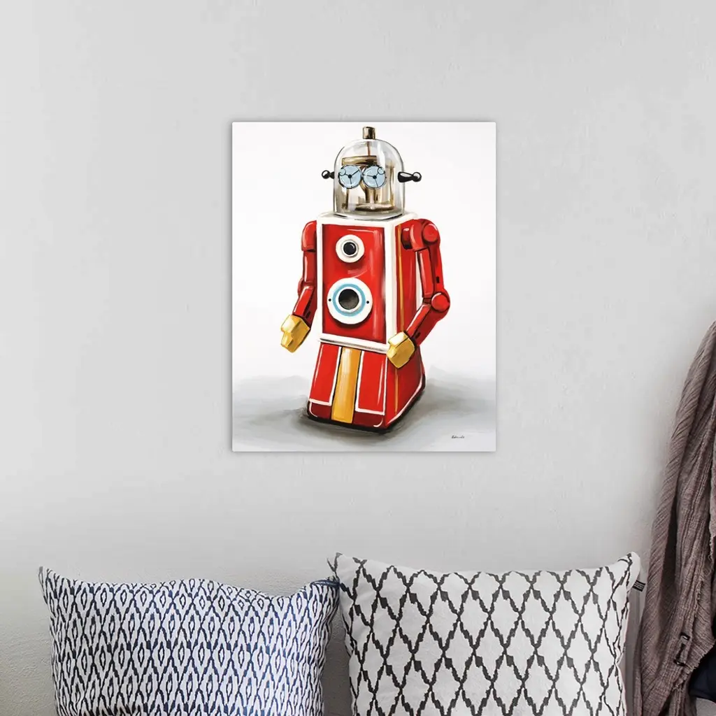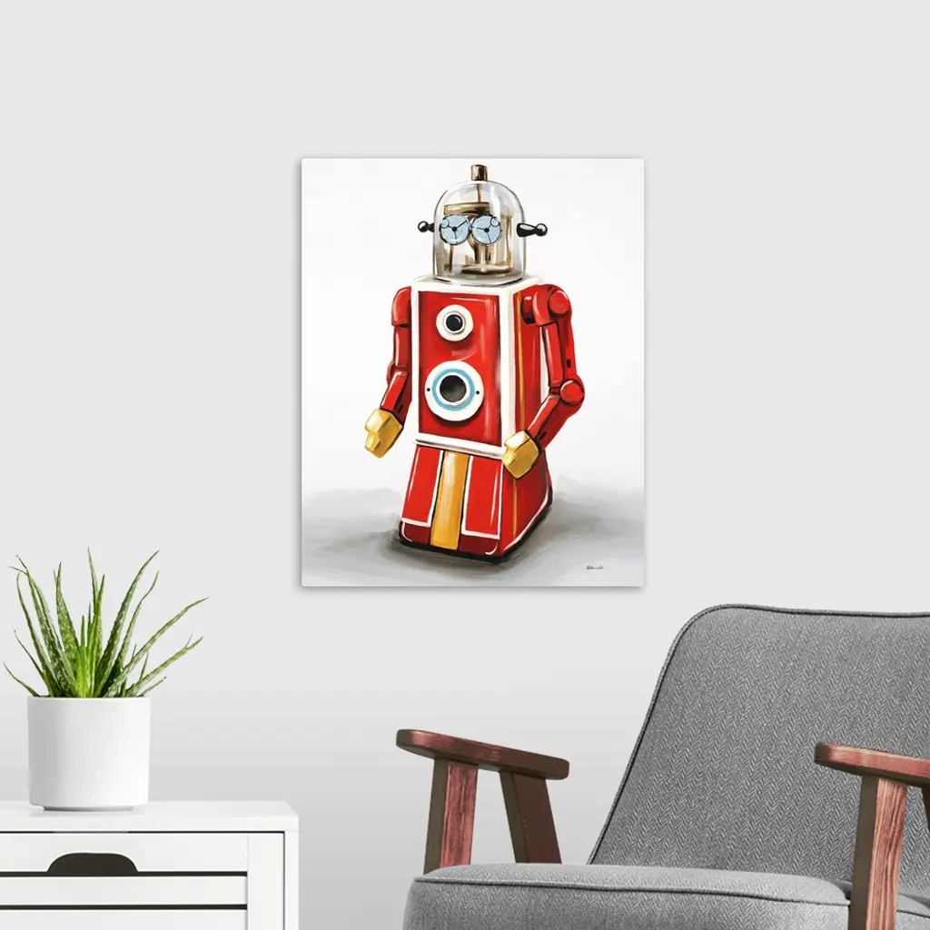 Contemporary painting of a red and yellow robot with blue eyes on a white and gray background.