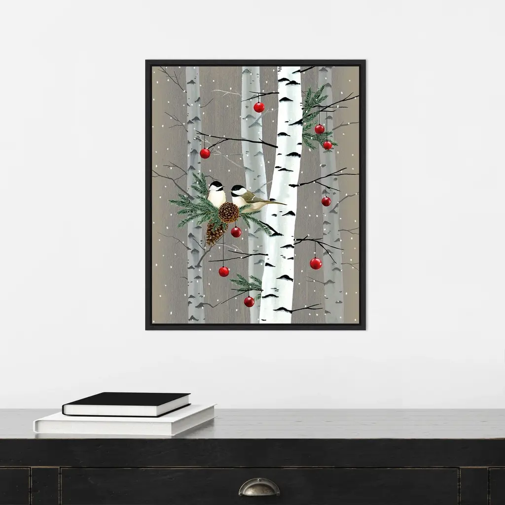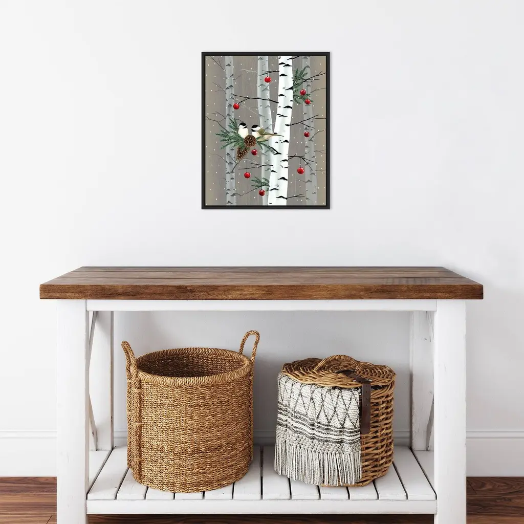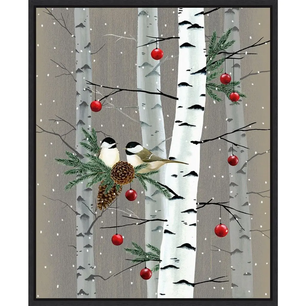 ART DESCRIPTION: Tis the season for all things merry and bright! Add holiday cheer to your home with this seasonal reminder of winter celebrations that bring together family and friends. This Amanti Art canvas art print was created by Grace Popp and printed by Amanti Art in Madison WI. The canvas is stretched by hand and finished with a float frame. Individually made using traditional custom framing techniques, it has the quality you would expect from your local frame shop. Features: CUSTOM CANVAS ARTWORK DETAILS: Birch Birds II by Grace Popp. ART DESCRIPTION: Tis the season for all things merry and bright! Add holiday cheer to your home with this seasonal reminder of winter celebrations that bring together family and friends. ARTIST BIO: Her primary mediums are oil paint, printmaking, and watercolor which she supplements with various other materials. Grace is inspired by nature, films, history, current events, and other artists both past and present. FRAME DETAILS: The canvas is framed in the Sylvie Black frame, which is a modern, black float frame with woodgrain textured surfaces and dramatic depth. The frame measures 1 in. wide and stands 2 in. off the wall. The canvas appears as if it is floating in the frame because it has a narrow gap between the edge of the canvas and the frame. The overall size of this framed canvas print measures 16 in. W x 20 in. H. QUALITY AND AUTHENTICITY: Canvas is printed with high-quality, fade-resistant inks for picture-perfect detail and incredible depth of color. Canvas is stretched across a solid surface to resist sagging. We use only premium, high-tension canvas. Our exclusive stretching techniques hide corner folds and provide a taut canvas surface. The artwork is authentically licensed. HASSLE-FREE HANGING: Ready to hang for easy installation. ASSEMBLED IN THE USA: Each piece is assembled to order in Madison, WI USA. FOR HOME OR COMMERCIAL USE: Because of our attention to detail and focus on artistry, architects, interior designers, and homeowners alike choose this framed canvas artwork to create beautiful living spaces.