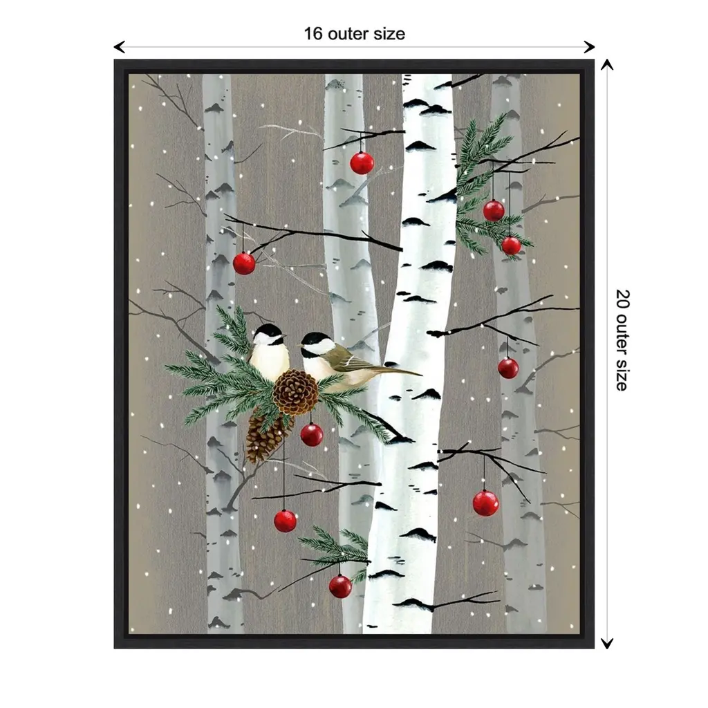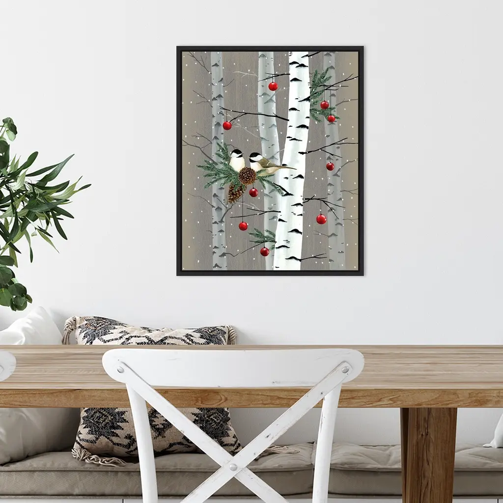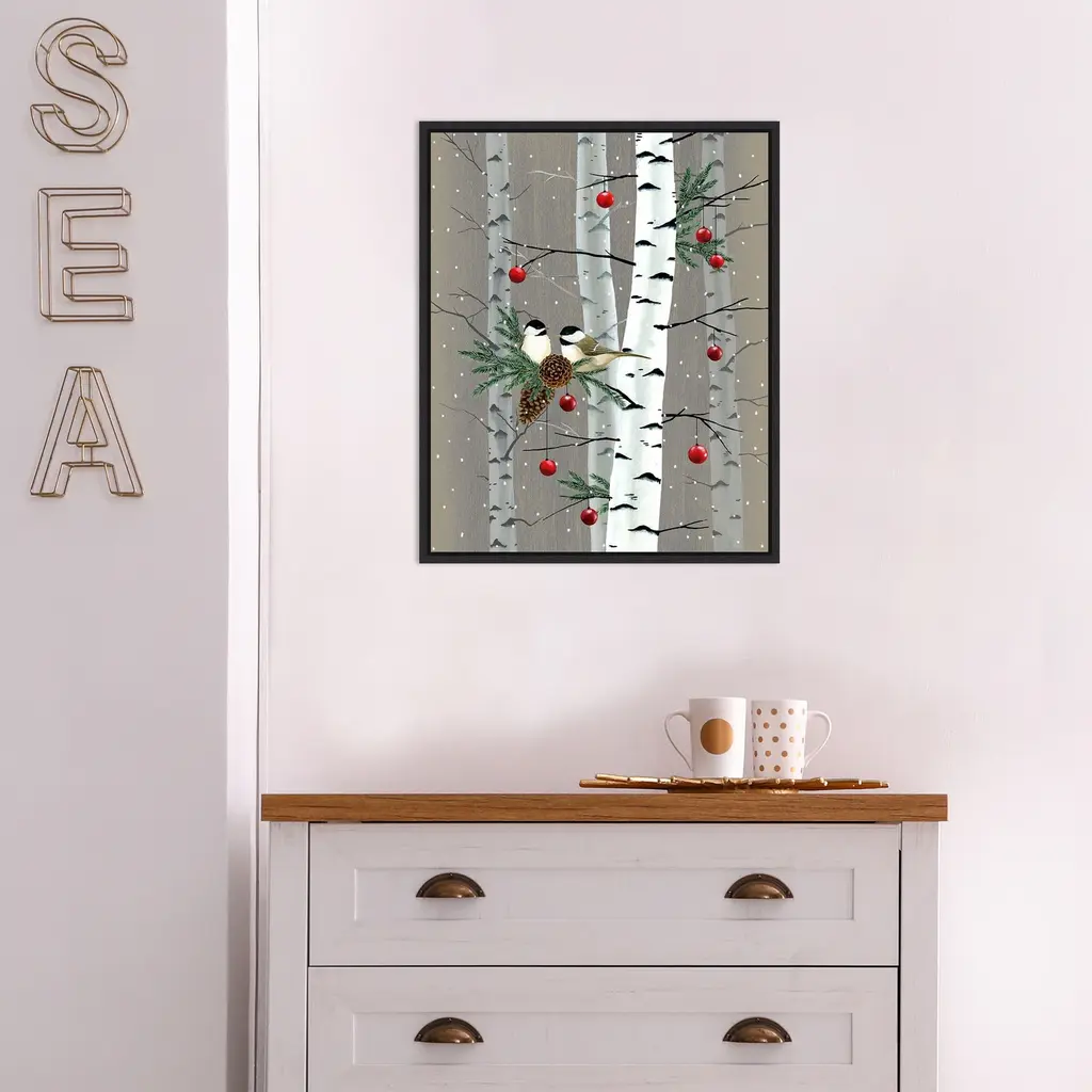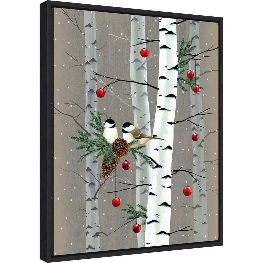 ART DESCRIPTION: Tis the season for all things merry and bright! Add holiday cheer to your home with this seasonal reminder of winter celebrations that bring together family and friends. This Amanti Art canvas art print was created by Grace Popp and printed by Amanti Art in Madison WI. The canvas is stretched by hand and finished with a float frame. Individually made using traditional custom framing techniques, it has the quality you would expect from your local frame shop. Features: CUSTOM CANVAS ARTWORK DETAILS: Birch Birds II by Grace Popp. ART DESCRIPTION: Tis the season for all things merry and bright! Add holiday cheer to your home with this seasonal reminder of winter celebrations that bring together family and friends. ARTIST BIO: Her primary mediums are oil paint, printmaking, and watercolor which she supplements with various other materials. Grace is inspired by nature, films, history, current events, and other artists both past and present. FRAME DETAILS: The canvas is framed in the Sylvie Black frame, which is a modern, black float frame with woodgrain textured surfaces and dramatic depth. The frame measures 1 in. wide and stands 2 in. off the wall. The canvas appears as if it is floating in the frame because it has a narrow gap between the edge of the canvas and the frame. The overall size of this framed canvas print measures 16 in. W x 20 in. H. QUALITY AND AUTHENTICITY: Canvas is printed with high-quality, fade-resistant inks for picture-perfect detail and incredible depth of color. Canvas is stretched across a solid surface to resist sagging. We use only premium, high-tension canvas. Our exclusive stretching techniques hide corner folds and provide a taut canvas surface. The artwork is authentically licensed. HASSLE-FREE HANGING: Ready to hang for easy installation. ASSEMBLED IN THE USA: Each piece is assembled to order in Madison, WI USA. FOR HOME OR COMMERCIAL USE: Because of our attention to detail and focus on artistry, architects, interior designers, and homeowners alike choose this framed canvas artwork to create beautiful living spaces.