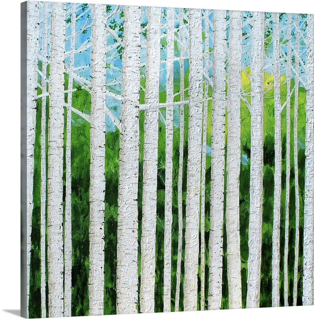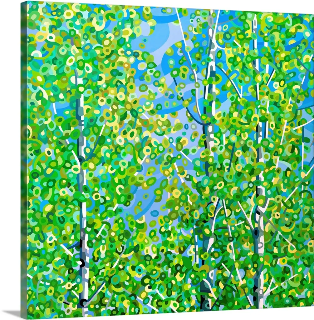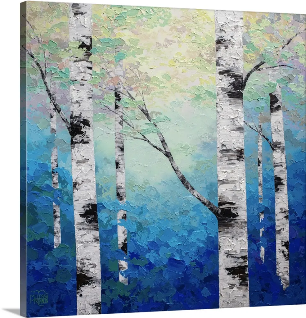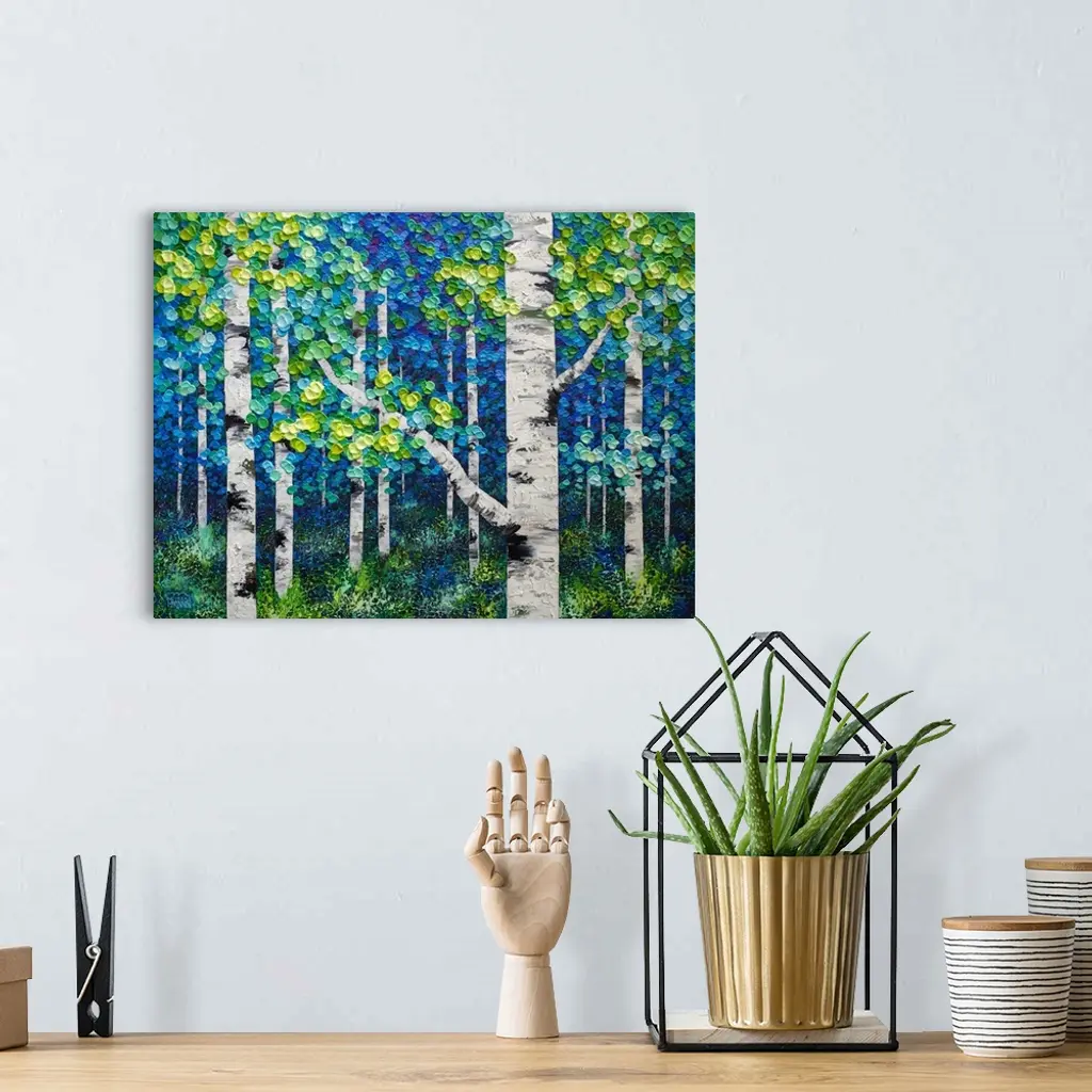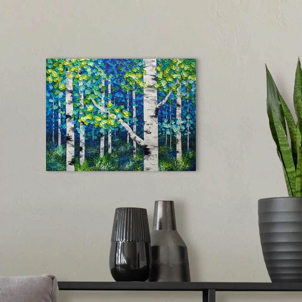 Large original painting of green, blue, yellow aspen trees and birch trees in autumn forest by Canadian abstract landscape artist Melissa McKinnon created with a palette knife and thick texture