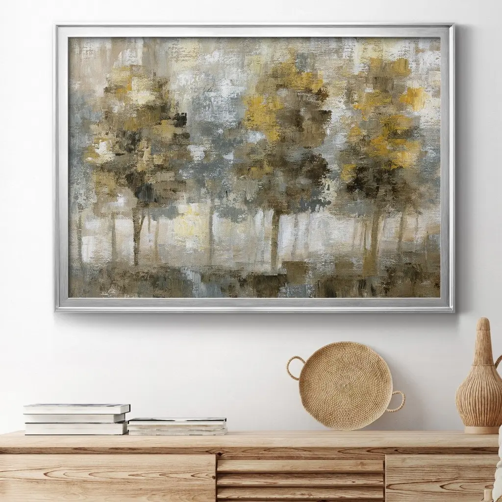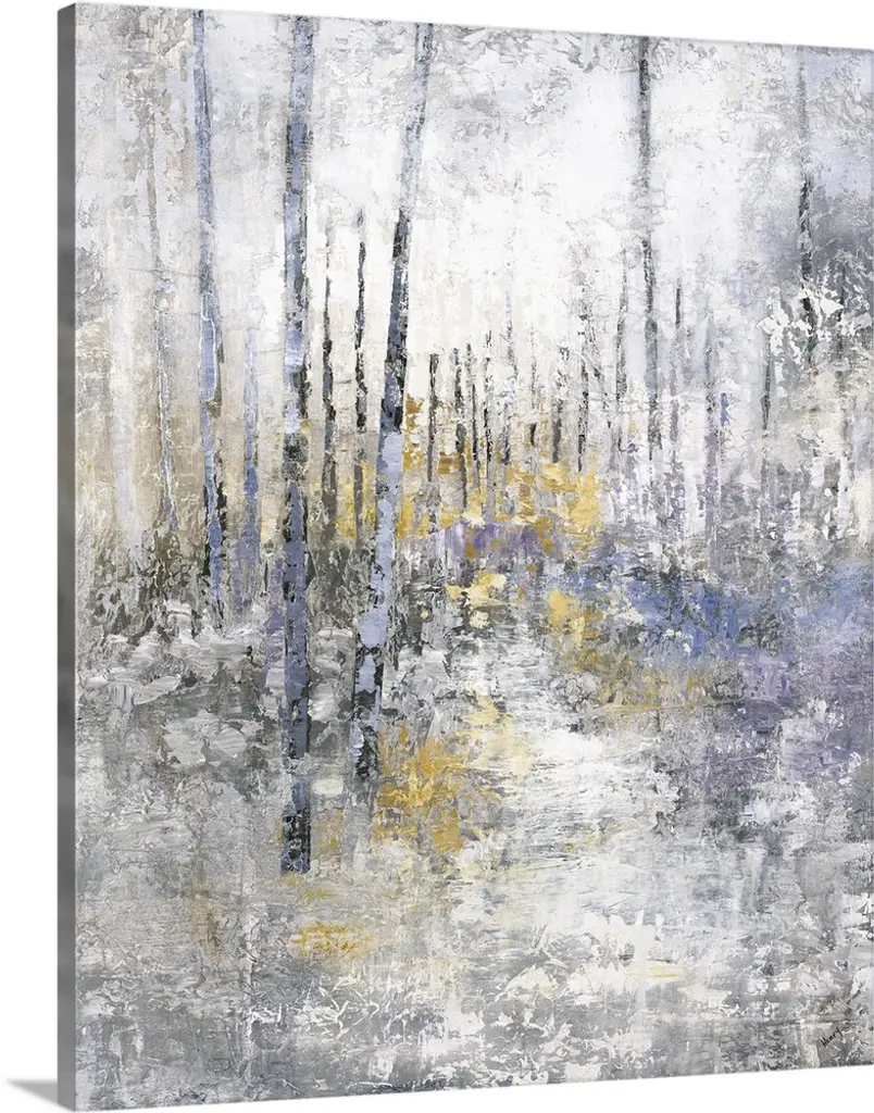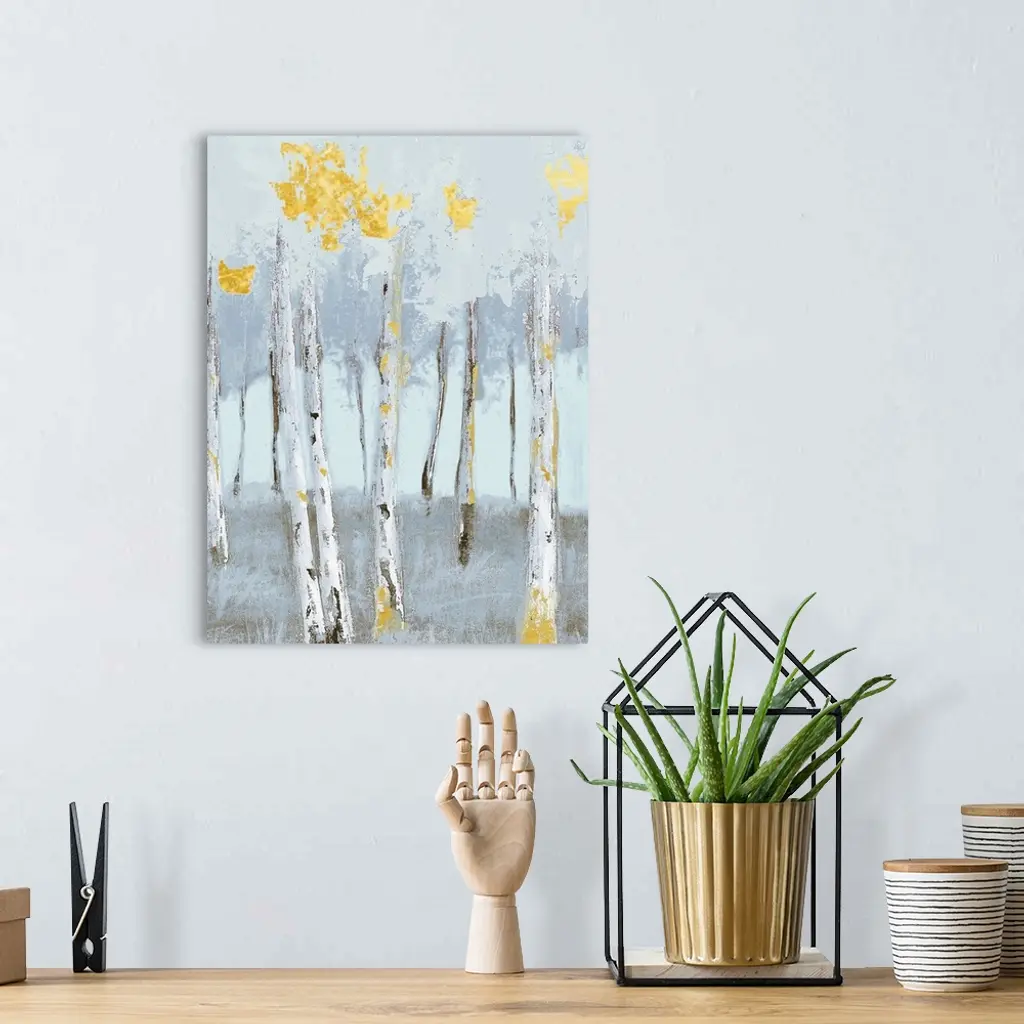 Contemporary painting of a grove of grey birch trees with bright gold leaves.