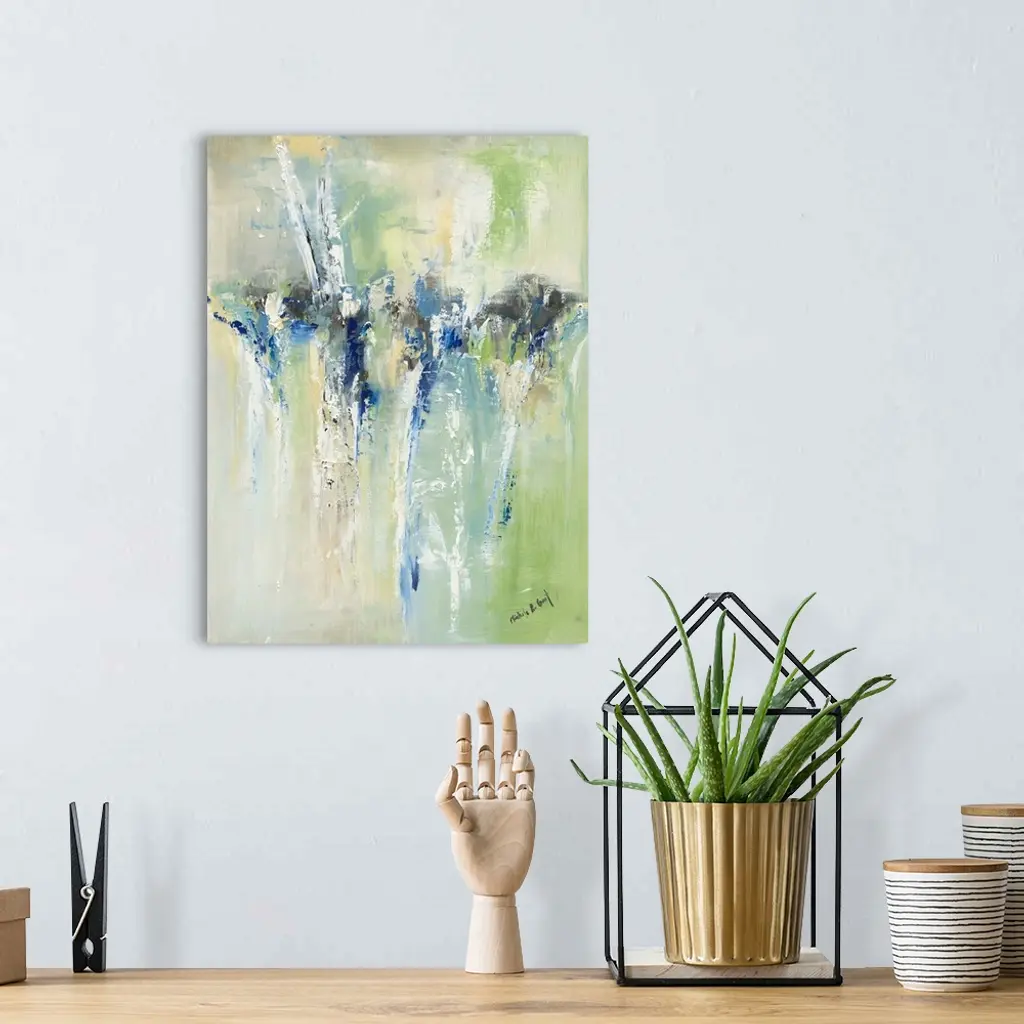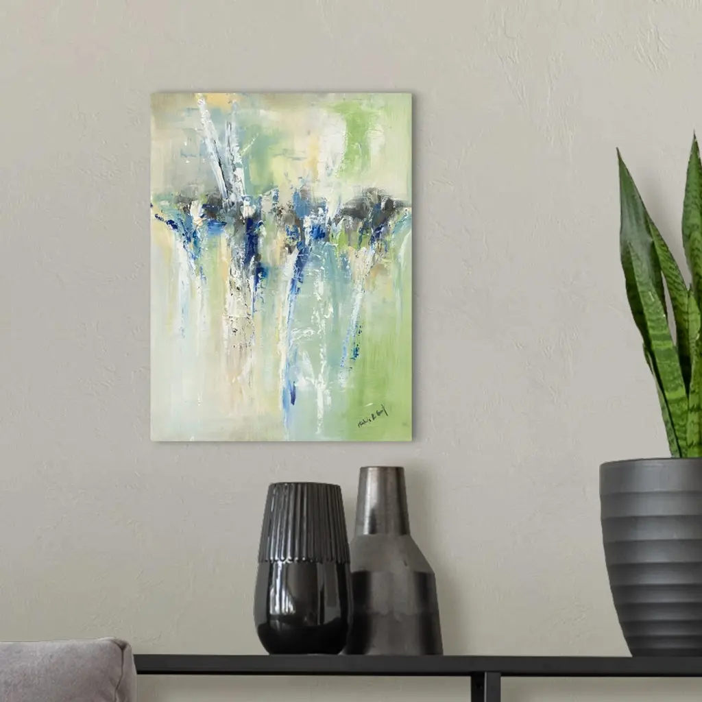 Large abstract painting in blue, green, yellow, gray, ad white hues.