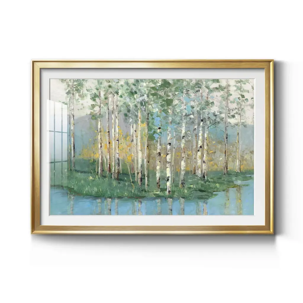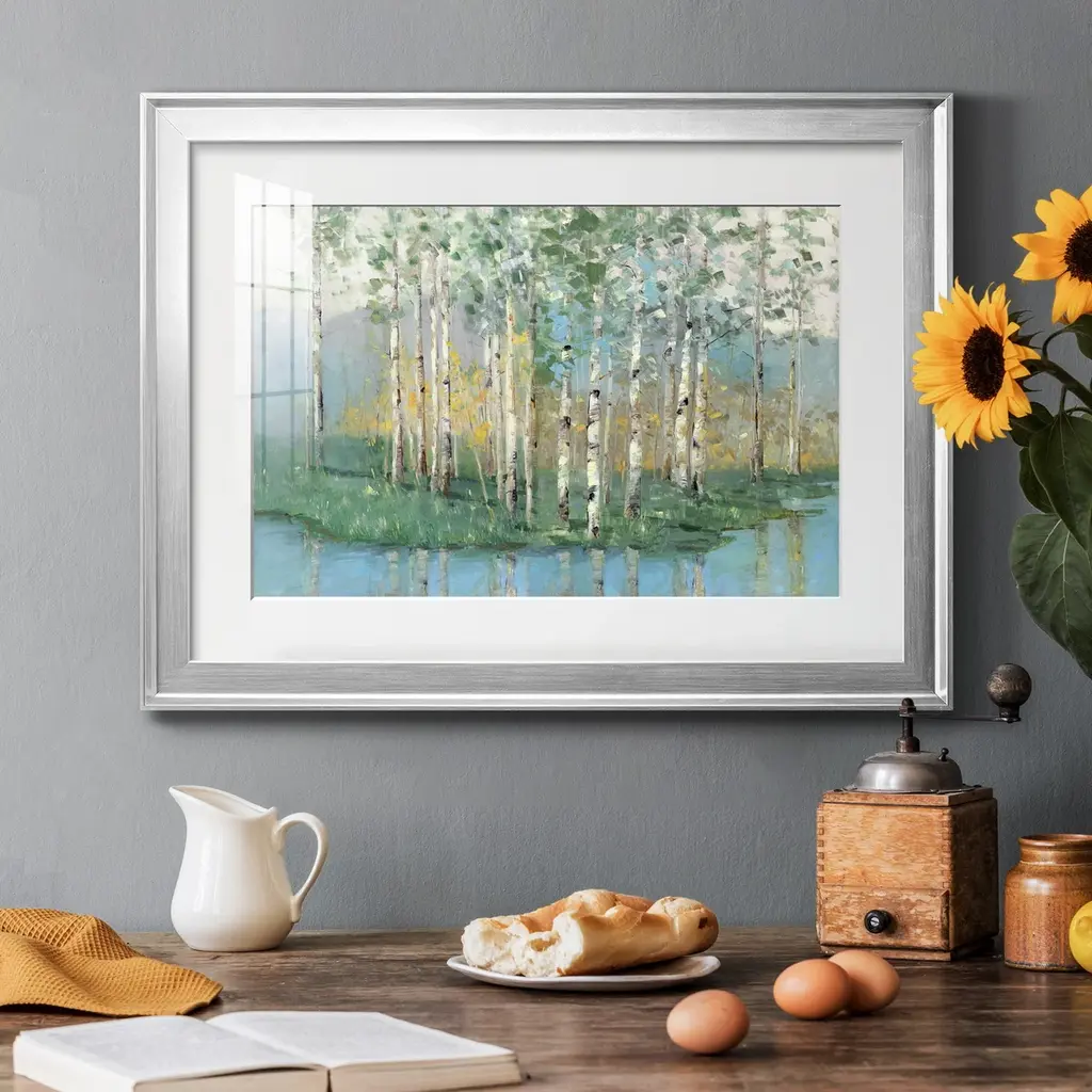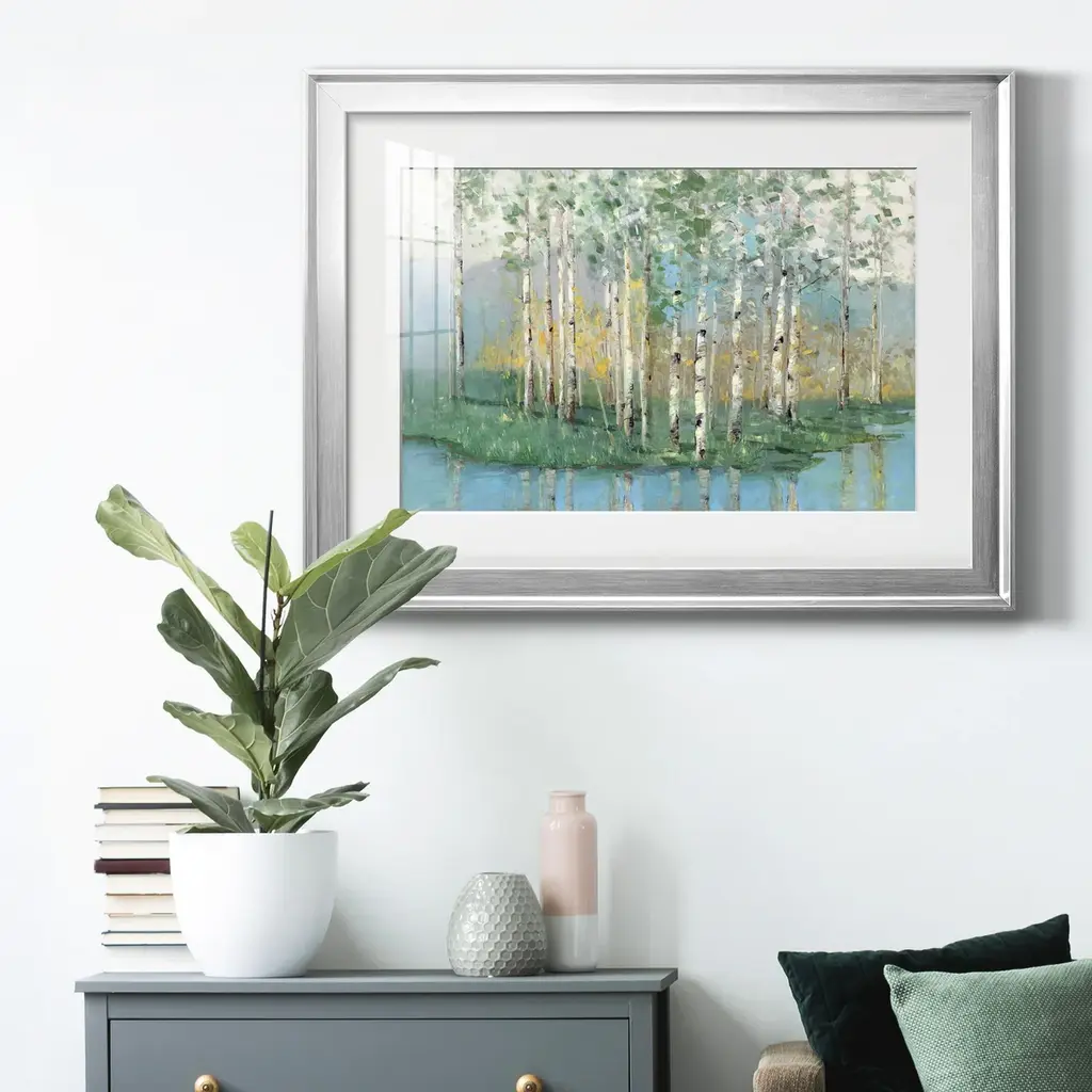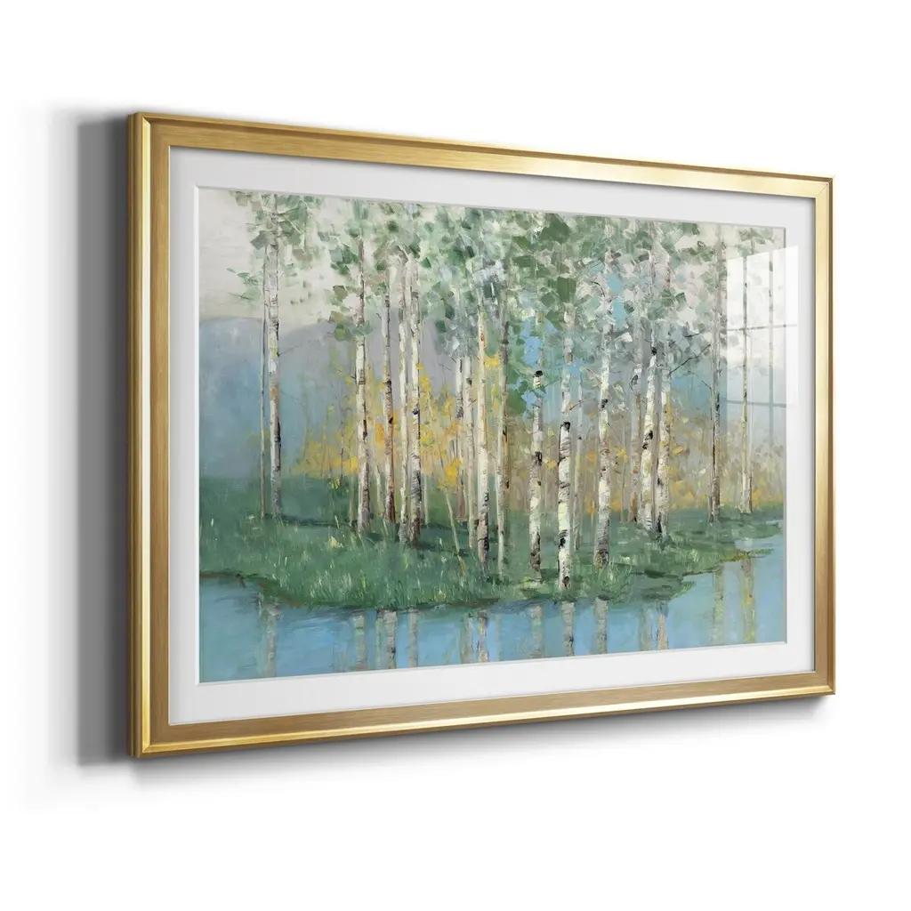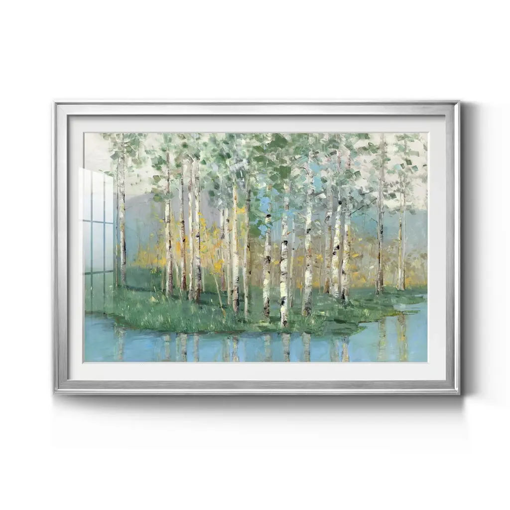 Birch Reflections Revisited Premium Framed Print - Ready to Hang A Premium Framed Print created to last. Framed in distressed wood and available in an array of sizes and colors Featuring a beveled a solid wood stretcher bar, each piece comes ready to hand 4 SIZES AVAILABLE 30.5''X42.5'' - Overall Size 26.5'X36.5'' - Overall Size 22''x30'' - Overall Size 18''x24'' - Overall Size Each piece is made to order. Each piece comes with hanging hardware. Made in the USA Ready to Hang Giclee Paper Print Acrylic Glass Beveled Matt Board
