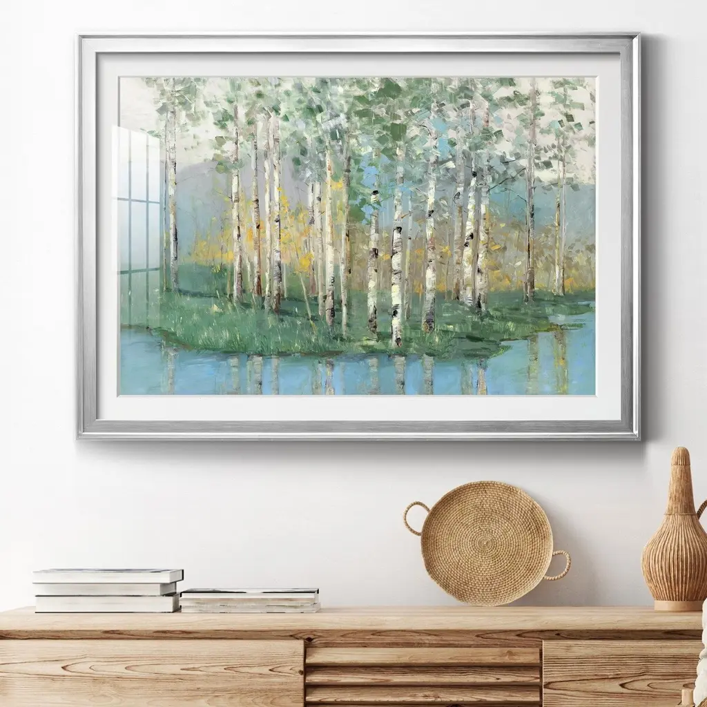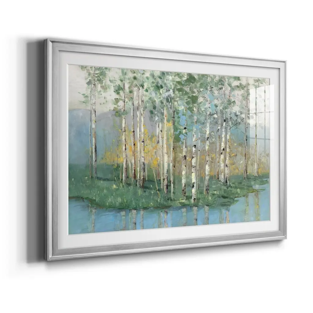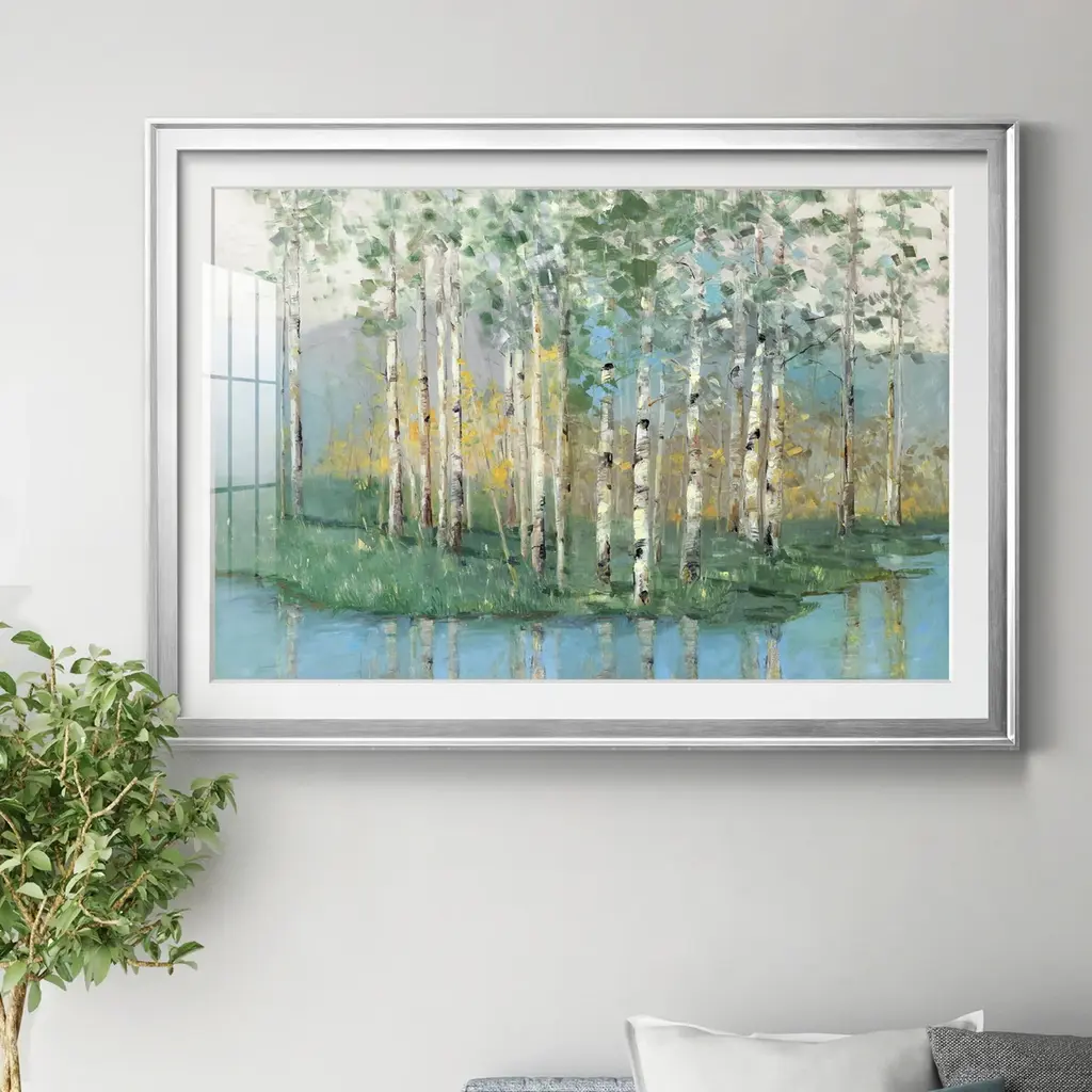 Birch Reflections Revisited Premium Framed Print - Ready to Hang A Premium Framed Print created to last. Framed in distressed wood and available in an array of sizes and colors Featuring a beveled a solid wood stretcher bar, each piece comes ready to hand 4 SIZES AVAILABLE 30.5''X42.5'' - Overall Size 26.5'X36.5'' - Overall Size 22''x30'' - Overall Size 18''x24'' - Overall Size Each piece is made to order. Each piece comes with hanging hardware. Made in the USA Ready to Hang Giclee Paper Print Acrylic Glass Beveled Matt Board