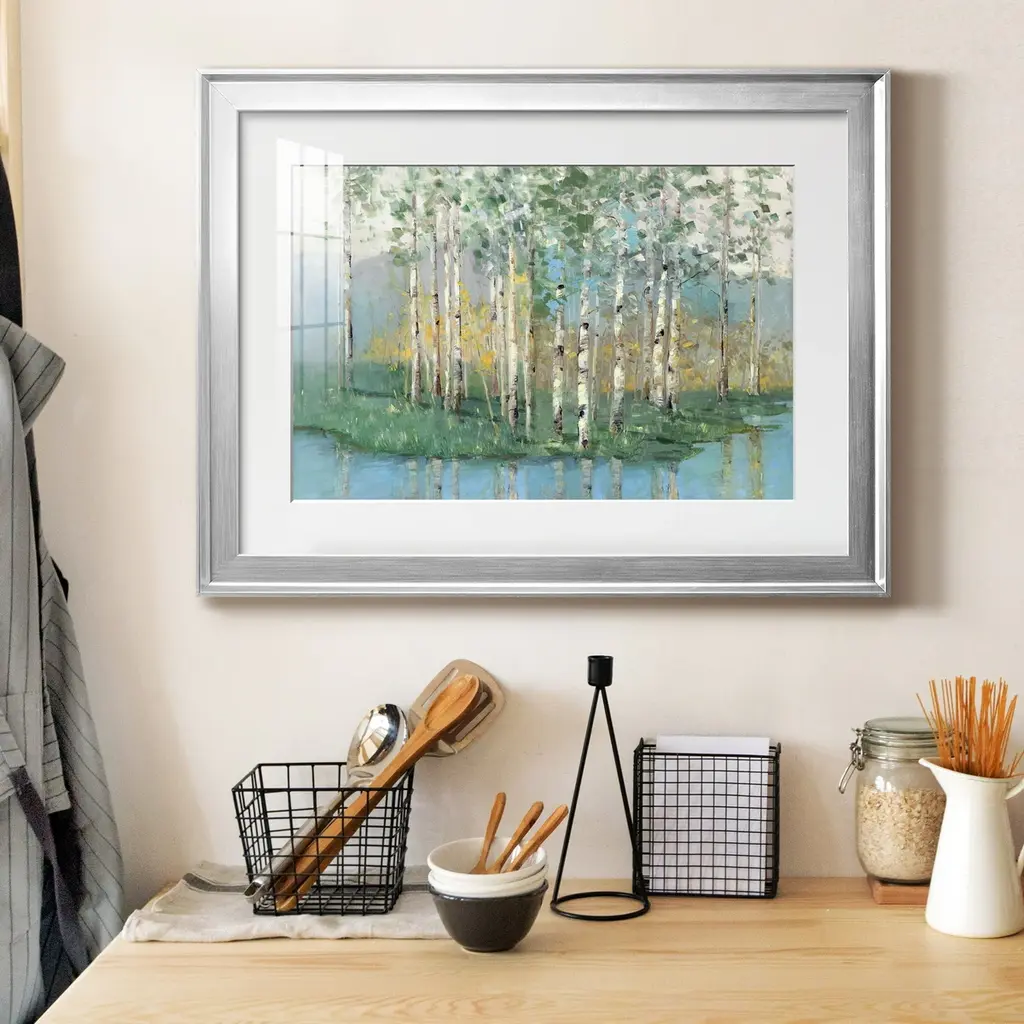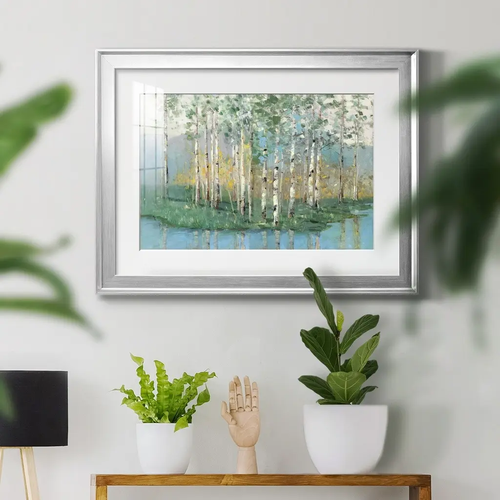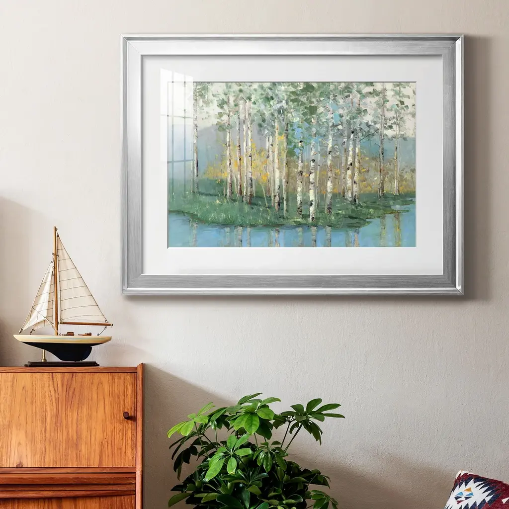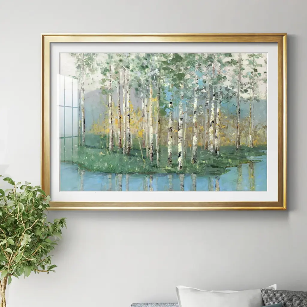 Birch Reflections Revisited Premium Framed Print - Ready to Hang A Premium Framed Print created to last. Framed in distressed wood and available in an array of sizes and colors Featuring a beveled a solid wood stretcher bar, each piece comes ready to hand 4 SIZES AVAILABLE 30.5''X42.5'' - Overall Size 26.5'X36.5'' - Overall Size 22''x30'' - Overall Size 18''x24'' - Overall Size Each piece is made to order. Each piece comes with hanging hardware. Made in the USA Ready to Hang Giclee Paper Print Acrylic Glass Beveled Matt Board
