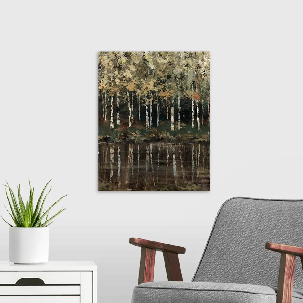 Artwork of birch trees near the shores of a lake in mostly neutral tones.
