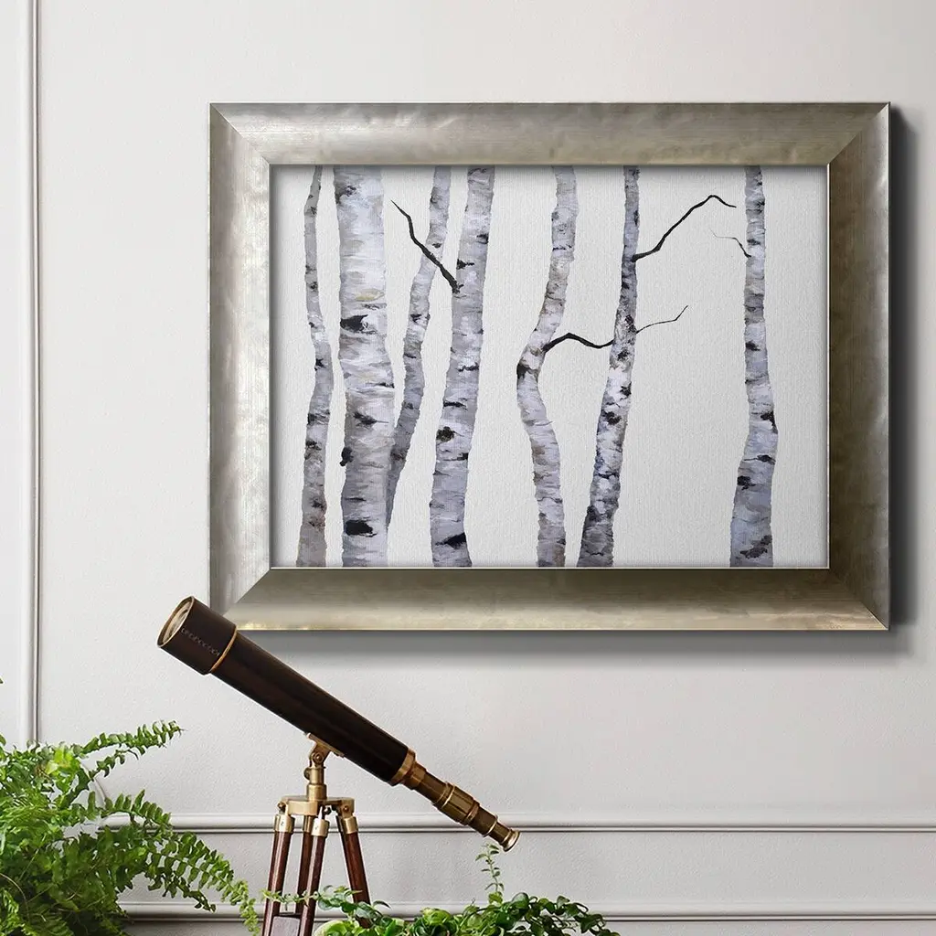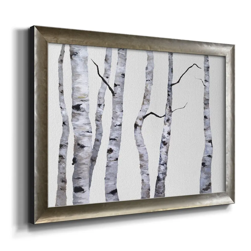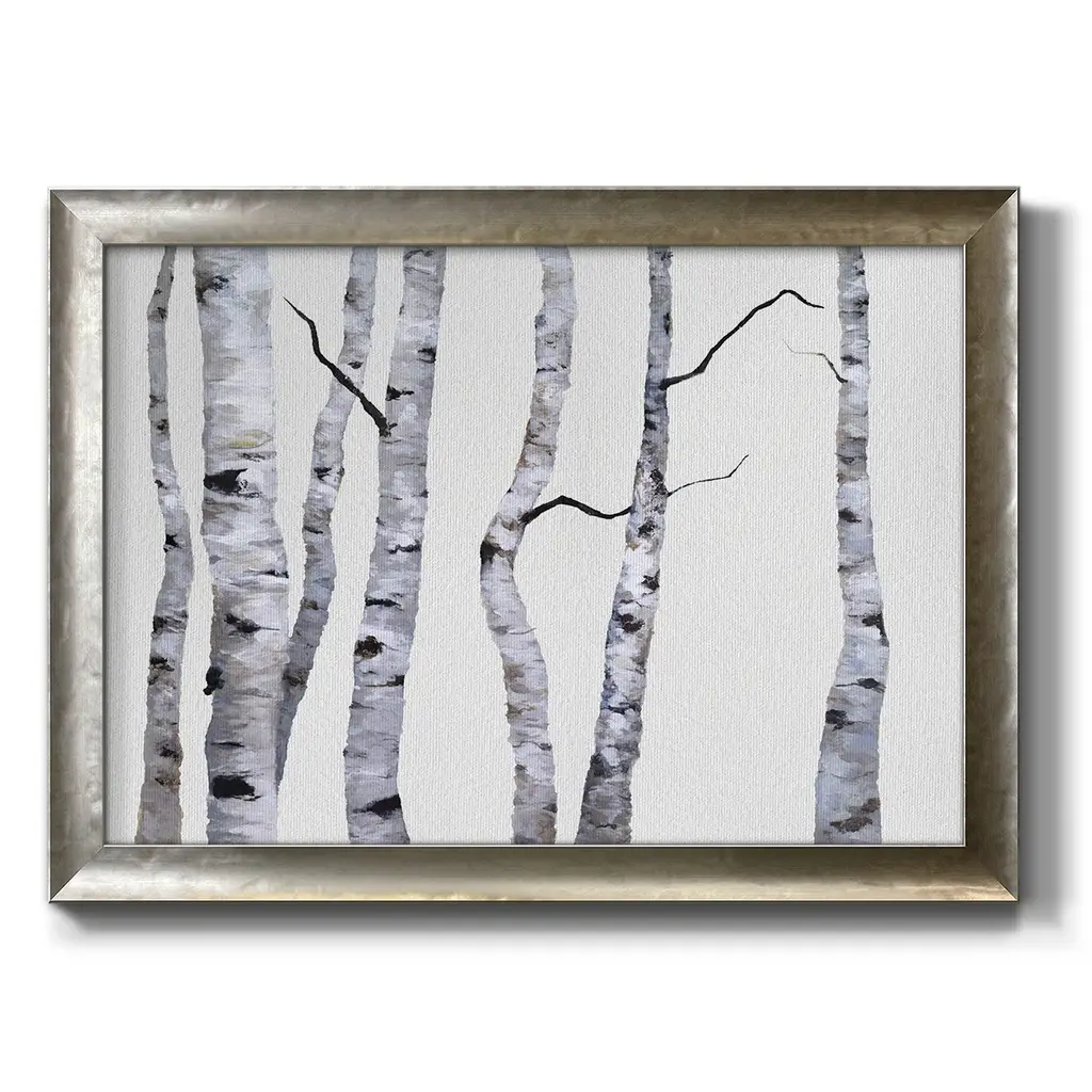 Birch Trees I Premium Framed Canvas- Ready to Hang A Premium Framed Canvas created to last. Framed in distressed wood and available in an array of sizes and colors Featuring a beveled a solid wood stretcher bar, each piece comes ready to hand 3 SIZES AVAILABLE 16''X20'' - Overall Size 18'X27'' - Overall Size 24''x36'' - Overall Size Each piece is made to order. Each piece comes with hanging hardware. Made in the USA Ready to Hang Giclee Paper Print Acrylic Glass Beveled Matt Board