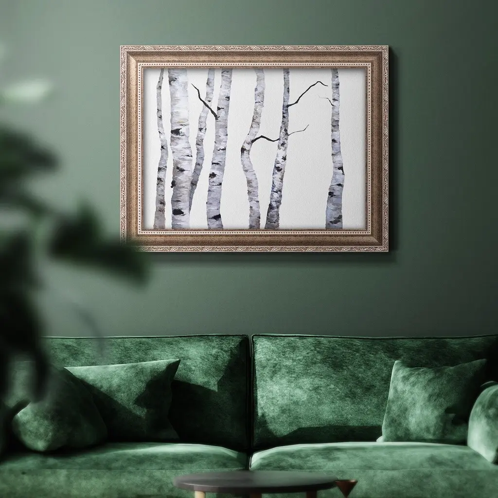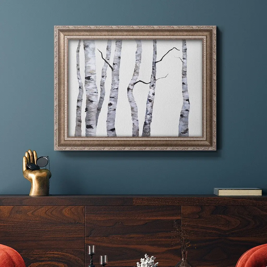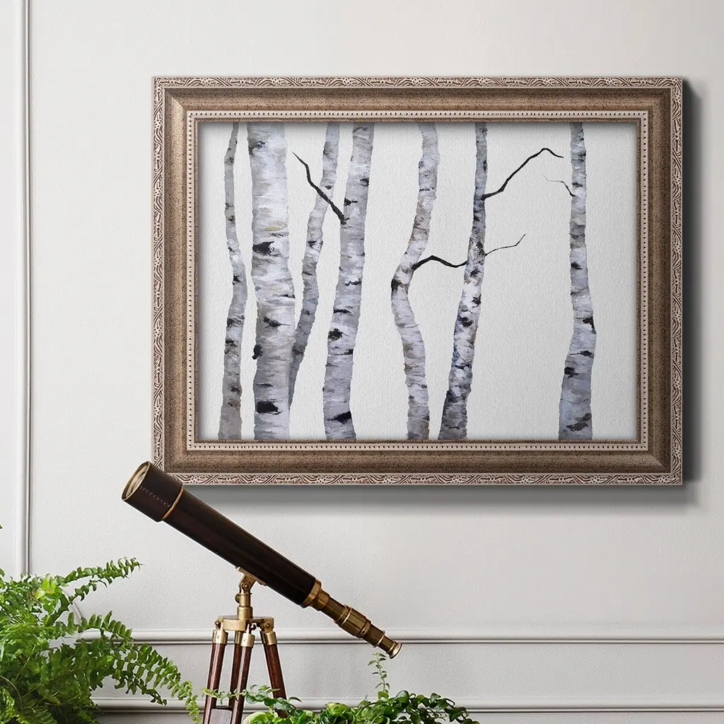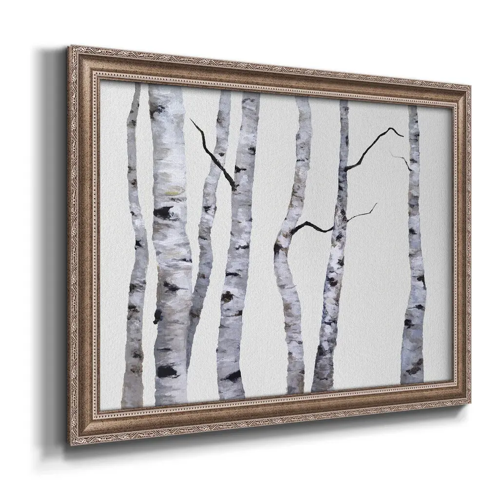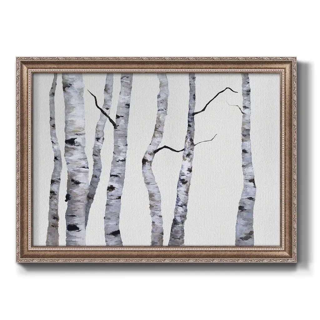 Birch Trees I Premium Framed Canvas- Ready to Hang A Premium Framed Canvas created to last. Framed in distressed wood and available in an array of sizes and colors Featuring a beveled a solid wood stretcher bar, each piece comes ready to hand 3 SIZES AVAILABLE 16''X20'' - Overall Size 18'X27'' - Overall Size 24''x36'' - Overall Size Each piece is made to order. Each piece comes with hanging hardware. Made in the USA Ready to Hang Giclee Paper Print Acrylic Glass Beveled Matt Board