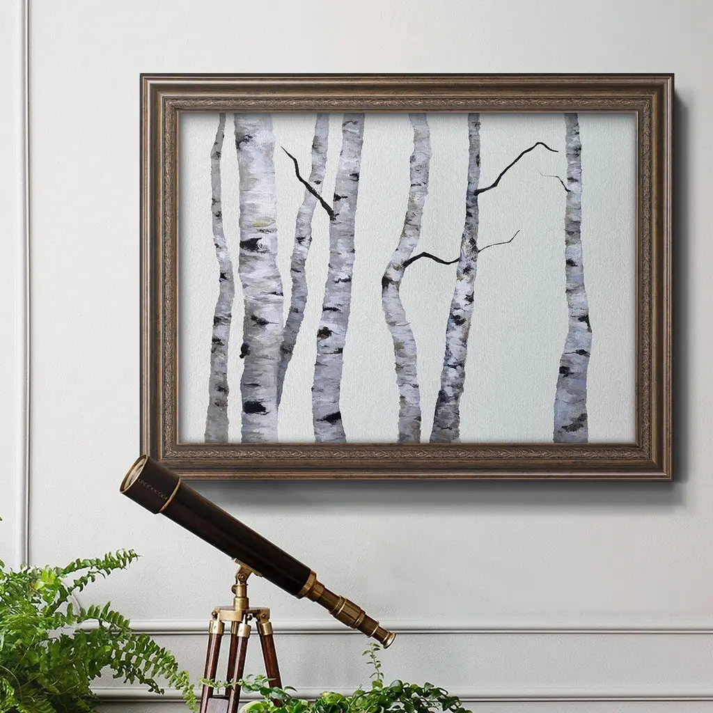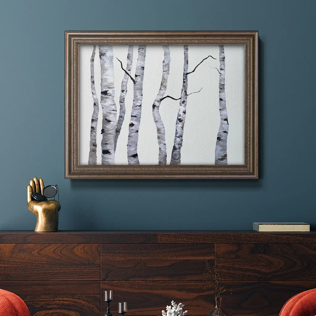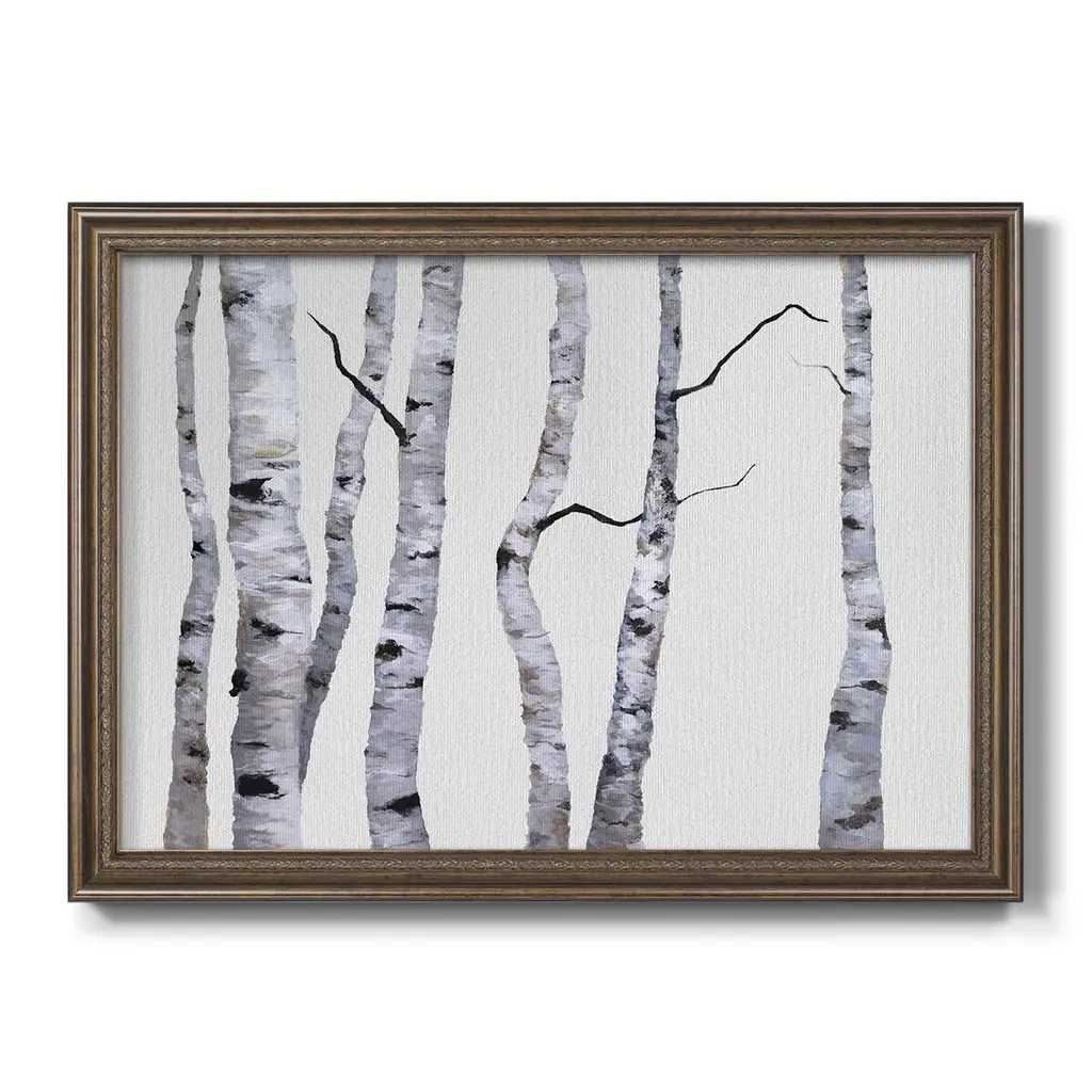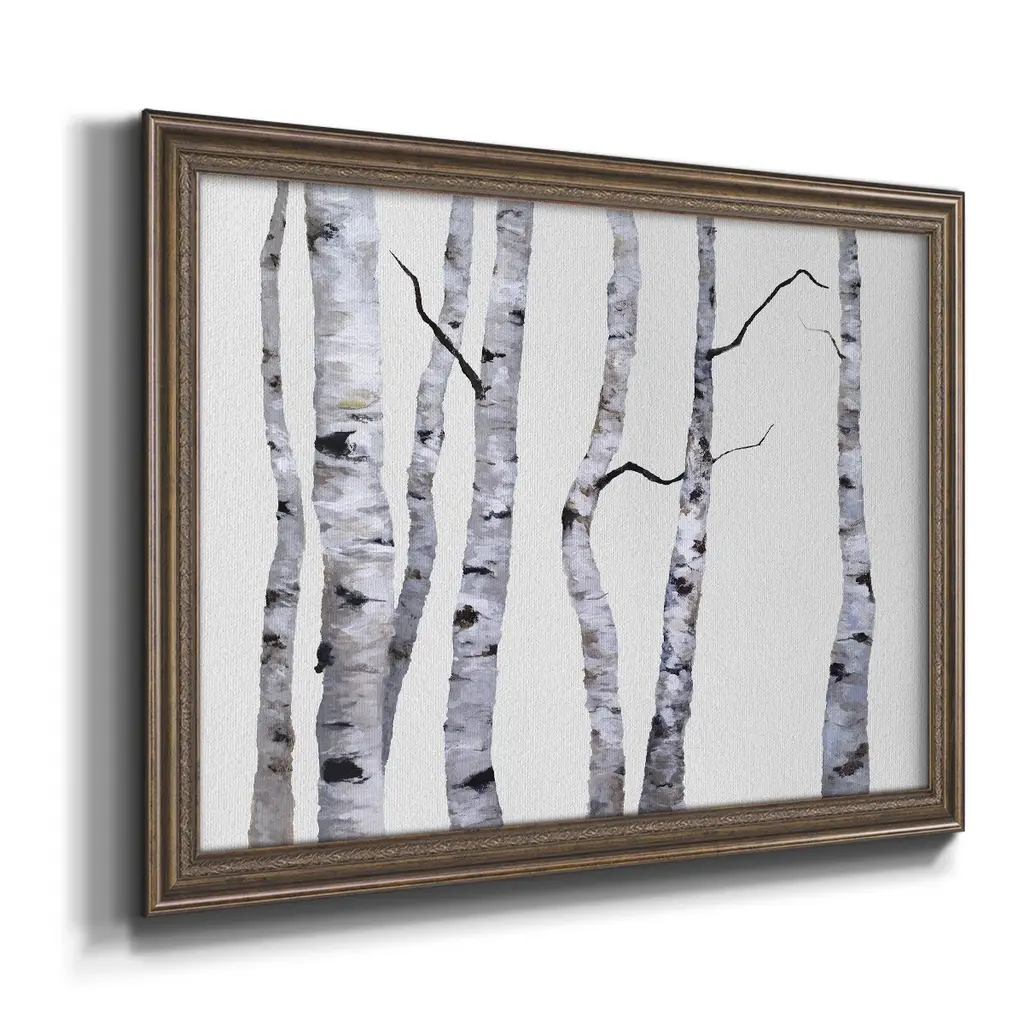 Birch Trees I Premium Framed Canvas- Ready to Hang A Premium Framed Canvas created to last. Framed in distressed wood and available in an array of sizes and colors Featuring a beveled a solid wood stretcher bar, each piece comes ready to hand 3 SIZES AVAILABLE 16''X20'' - Overall Size 18'X27'' - Overall Size 24''x36'' - Overall Size Each piece is made to order. Each piece comes with hanging hardware. Made in the USA Ready to Hang Giclee Paper Print Acrylic Glass Beveled Matt Board