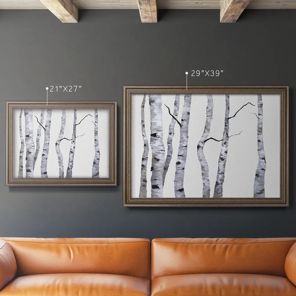 Birch Trees I Premium Framed Canvas- Ready to Hang A Premium Framed Canvas created to last. Framed in distressed wood and available in an array of sizes and colors Featuring a beveled a solid wood stretcher bar, each piece comes ready to hand 3 SIZES AVAILABLE 16''X20'' - Overall Size 18'X27'' - Overall Size 24''x36'' - Overall Size Each piece is made to order. Each piece comes with hanging hardware. Made in the USA Ready to Hang Giclee Paper Print Acrylic Glass Beveled Matt Board