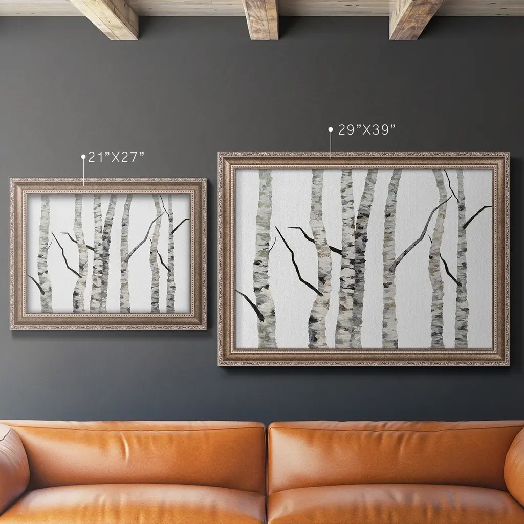 Birch Trees II Premium Framed Canvas- Ready to Hang A Premium Framed Canvas created to last. Framed in distressed wood and available in an array of sizes and colors Featuring a beveled a solid wood stretcher bar, each piece comes ready to hand 3 SIZES AVAILABLE 16''X20'' - Overall Size 18'X27'' - Overall Size 24''x36'' - Overall Size Each piece is made to order. Each piece comes with hanging hardware. Made in the USA Ready to Hang Giclee Paper Print Acrylic Glass Beveled Matt Board
