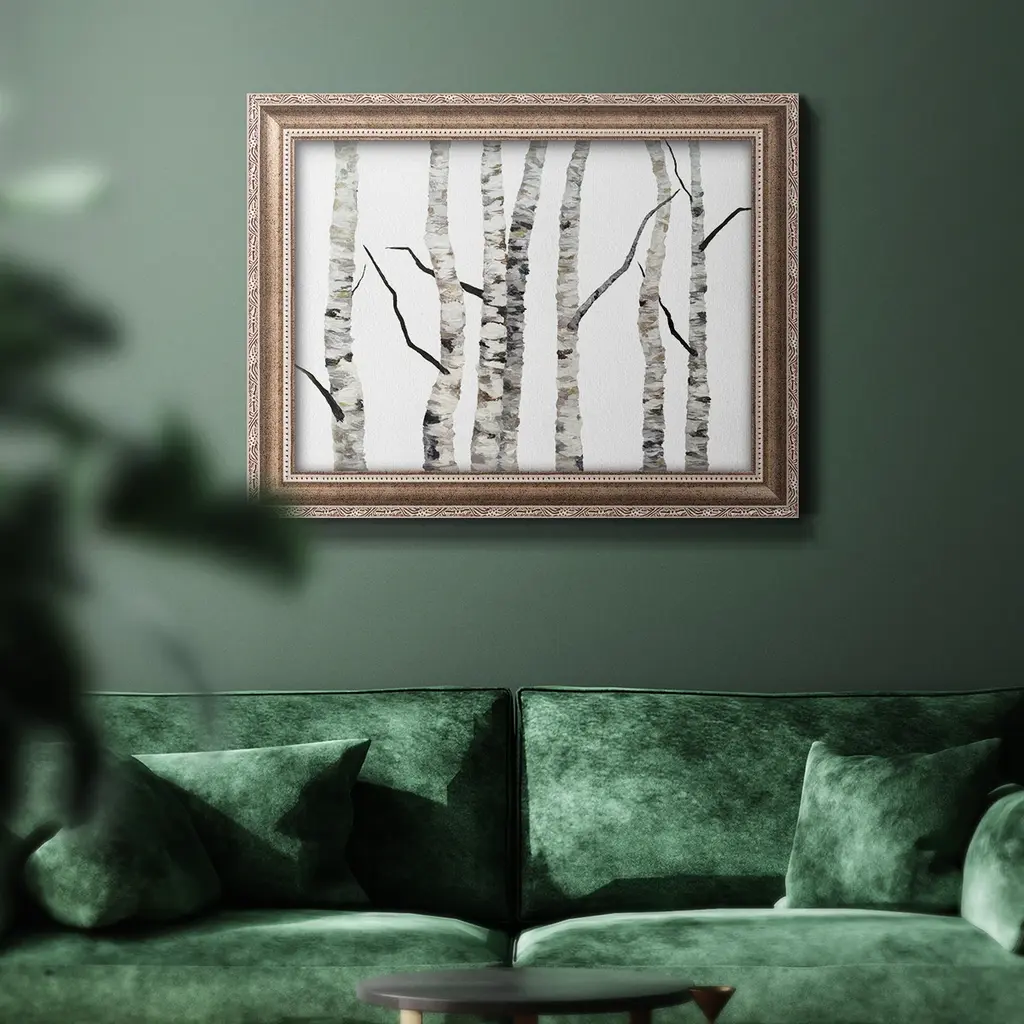 Birch Trees II Premium Framed Canvas- Ready to Hang A Premium Framed Canvas created to last. Framed in distressed wood and available in an array of sizes and colors Featuring a beveled a solid wood stretcher bar, each piece comes ready to hand 3 SIZES AVAILABLE 16''X20'' - Overall Size 18'X27'' - Overall Size 24''x36'' - Overall Size Each piece is made to order. Each piece comes with hanging hardware. Made in the USA Ready to Hang Giclee Paper Print Acrylic Glass Beveled Matt Board