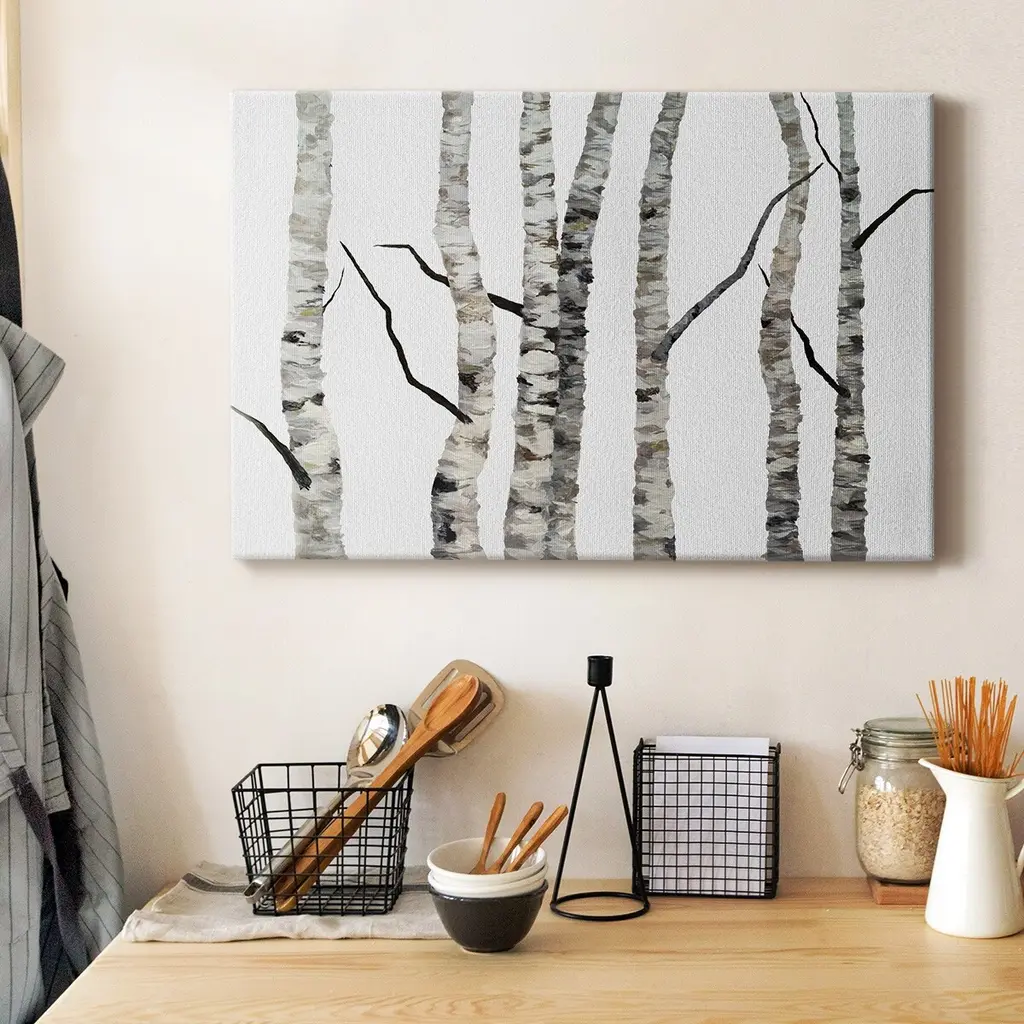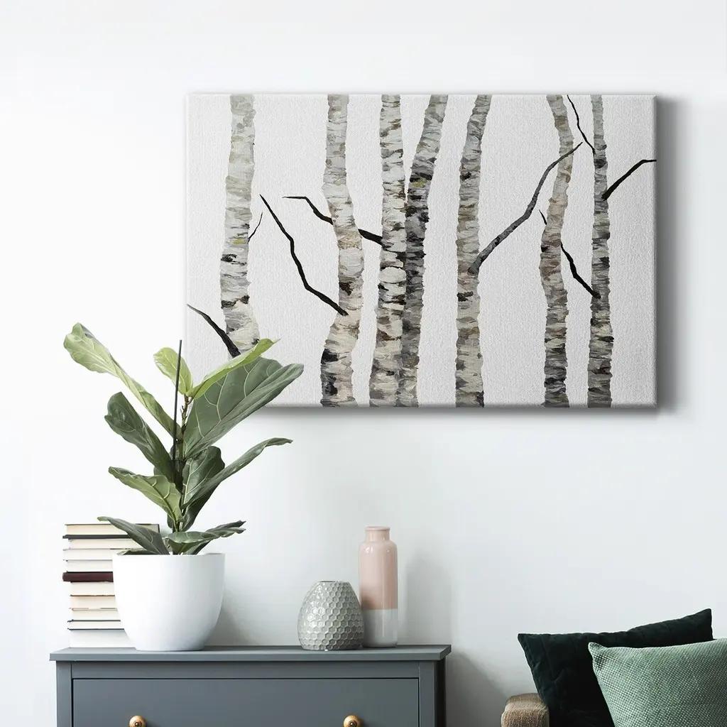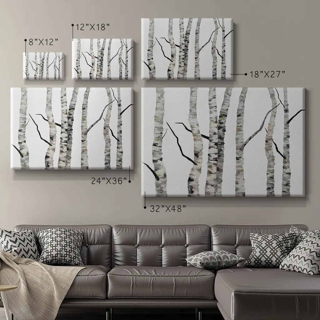 Birch Trees II Premium Gallery Wrapped Canvas - Ready to Hang A premium hand stretched gallery wrapped canvas print created to last. Featuring a beveled a solid wood stretcher bar, each piece comes ready to hand 6 SIZES AVAILABLE 8''X12'' - Overall Size 12''X18'' - Overall Size 18''X27'' - Overall Size 24''x36'' - Overall Size 32''x48'' - Overall Size 40''x60'' - Overall Size Each piece is made to order. Built to Last Each piece comes ready to hang Solid wood stretcher Fade and Water resistant Made domestically