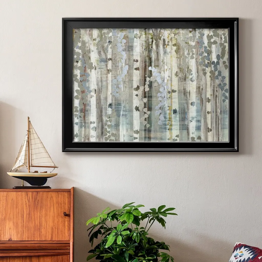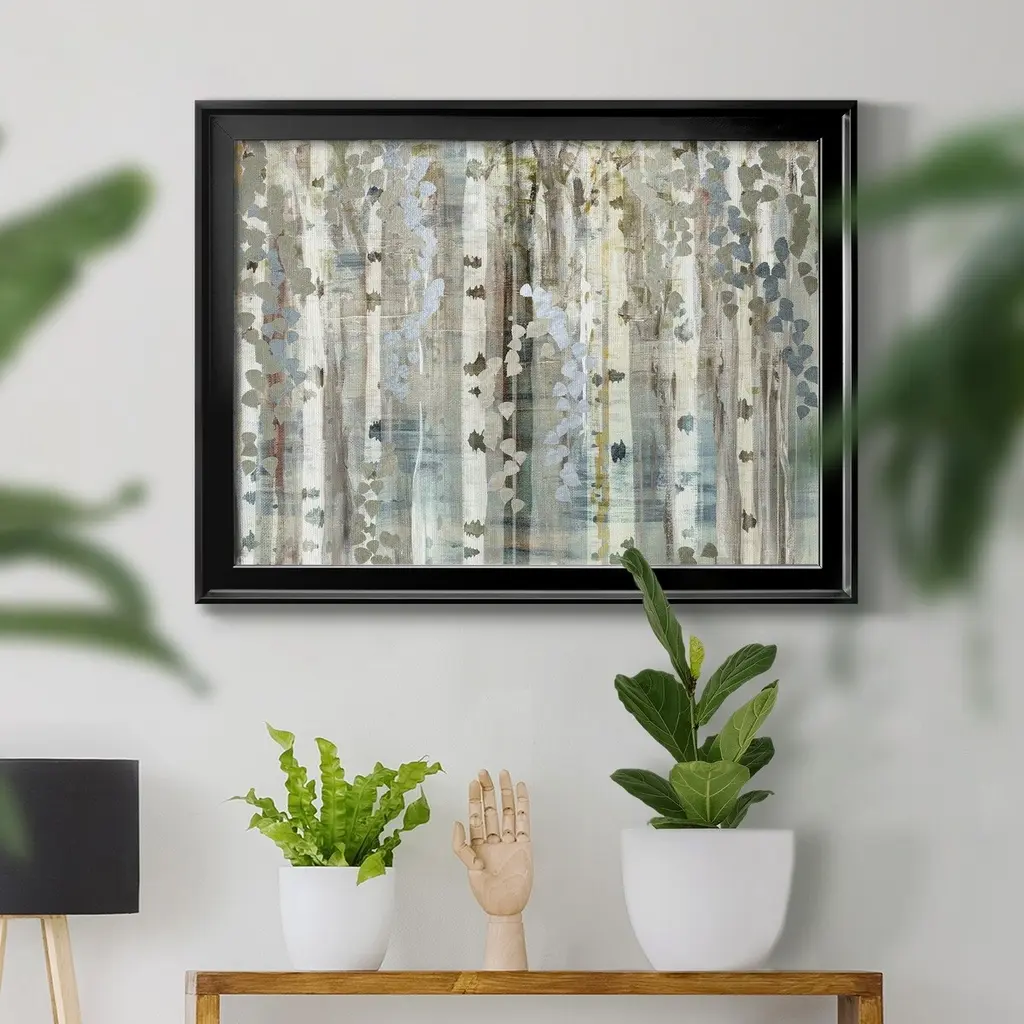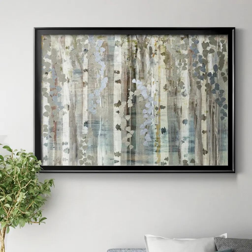 Birch Wood Meadow Premium Framed Canvas - Ready to Hang A Premium Framed Canvas created to last. Framed in distressed wood and available in an array of sizes and colors Featuring a beveled a solid wood stretcher bar, each piece comes ready to hand 4 SIZES AVAILABLE 30.5''X42.5'' - Overall Size 26.5'X36.5'' - Overall Size 22''x30'' - Overall Size 18''x24'' - Overall Size Each piece is made to order. Each piece comes with hanging hardware. Made in the USA Ready to Hang Giclee Paper Print Acrylic Glass Beveled Matt Board